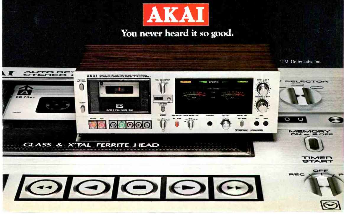 ----------------- AKAI Quality in Reverse ![]() AKAI introduces automatic reverse record at popular prices. Now instead of interrupting great moments in music when it's time to flip the cassette, AKAI's two newest decks automatically reverse the tape and continue to record or play back. In addition, the deluxe GXC-735D is loaded with all the features that make the difference between a good deck and a great one. Things like AKAI's exclusive GX (glass and crystal ferrite) heads, guaranteed for 150,000 hours the equivalent of playing 24 hours a day for 171/2 years. As well as feather-touch controls, Dolby," memory rewind, quick reverse and dramatically recessed red/green illuminated VU meters. Not to mention the kind of specs serious component buyers all over the world depend on AKAI to deliver. (For the more economy-minded, there's the CS-732D. Same great auto reverse record/playback feature, with Dolby, quick reverse and tape selector-- a lot of AKAI quality for not a lot of money.) Hear them both at your AKAI dealer or write AKAI America, Ltd., 2139 E. Del Amo Blvd., P.O. Box 6010, Compton, CA 90224. And see how they can reverse your thinking about automatic recording. ![]() GXC-735D: Wow/Flutter less than 0.08% WRMS; S/N Ratio-better than 58 dB, weighted, at FeCr position, with peak level at 3% THD. Dolby on improves up to 10 dB above 5 kHz. Frequency response 35-17,000 Hz (± 3 dB) using FeCr tape. CS-732D: Wow/Flutter-less than 0.08% WRMS; S/N Ratio better than 57 dB, weighted, at FeCr position, with peak level at 3% THD. Dolby on improves up to 10 dB above 5 kHz. Frequency response38-16,000 Hz (± 3 dB) using FeCr tape. AKAI You never heard it so good. ---------------------- ES Translator ELECTROSTATICS TURNED INSIDE OUT