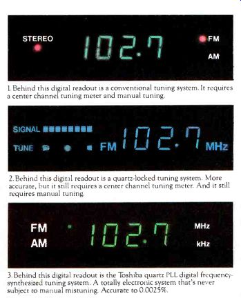 Toshiba has solved the problem of mistuning by eliminating the need for a center channel tuning meter. Instead, digital frequency synthesis uses a carefully selected quartz crystal to produce a stable reference frequency. In plain English, this system constantly corrects tuning errors. The result is the lowest possible distortion and absolutely no drift. Toshiba was the first to utilize this system in a receiver, and now we're using it again in our SA 850 receiver. Digital frequency synthesis not only makes us accurate, it also makes us more convenient. No unnecessary parts. We've eliminated the center channel tuning meter, FM/AM dial scale and tuning knob. So you can tune automatically or manually with the ease of pushbutton selection. You get LED digital readout and 5 LED signal strength indicators. You'll thank us for the memory and scan. Actually, you'll thank digital frequency synthesis. Because only with 1. Behind this digital readout is a conventional tuning system. It requires a center channel tuning meter and manual tuning. 2. Behind this digital readout is a quartz-locked tuning system. More accurate, but it still requires a center channel tuning meter. And it still requires manual tuning. 3. Behind this digital readout is the Toshiba quartz PLL digital frequency synthesized tuning system. A totally electronic system that's never subject to manual mistuning. Accurate to 0.0025%. this process can you store 6 FM and 6 AM stations for instant recall tuning at the touch of a memory button. And in the automatic FM mode, digital frequency synthesis allows the tuner to scan until it stops at the next listenable station. FM stereo S/N ratio is 68 dB. FM selectivity is a high 80 dB. Frequency response is 20 to 15,000 Hz + 0.2 0.8 dB. But there's more to this receiver than just a superb tuning system. Power you'll respect. We're talking about 50 watts rms per channel into 8 ohms from 20-20,000 Hz. This is provided by full complementary direct coupled power amplifiers. And couple that with an ultra-low THD of 0.03%. A preamp you'll appreciate. Along with provisions for attaching two tape decks, we give you full monitoring controls. Plus duplication switching between the decks. Our special subsonic filter switch helps eliminate low-frequency warp distortion. And our receiver looks as good as it sounds. With a sleek slide-away cover that conceals a full range of controls, including tone/defeat switch and a dual speaker selector. The Toshiba SA-850 digital frequency-synthesized receiver. The next time you're looking at receivers, don't believe every digital readout you read. Except ours. TOSHIBA Again, the first. Toshiba America Inc. 280 Park Ave., New York. NY 11710 --------------- Sansui is breaking up a very successful relationship. The TU-717 has a new mate: The AU-719. Sansui has just introduced an exciting new integrated amplifier, the AU-719. It represents the very latest developments in audio and electronics technology t is so good, in fact, that has replaced its rave-reviewed, best-selling predecessor as the partner of the TU-717 tuner. The-U-717's performance has been extravagantly praised by professional critics and knowledgeable consumers alike. With advanced features like switchable IF bandwidth and specs like 81dB signal-to-noise ratio and 0.06% THD, it's only natural. We expect the tuner's new mate to receive a tremendous reception and set industry amplifier standards for a long time to come. Here's why. INTRODUCING DD/DC What particularly distinguishes the new AU-719 amp is Sansui's patent-pending DD/DC (Diamond Differential/DC) circuitry that provides the extremely high drive current needed to reduce THD by adding large amounts of negative feedback without compromising slew rate or adding TIM. Slew rate refers to an amplifier's ability to respond to rapidly changing musical signals. The slew rate of the AU-719 is an astounding 170V/µ Sec. MAGNIFICENT MUSIC Many modern amplifiers have extremely low total harmonic distortion specs. And hat's important. But THD is measured with steady test signals and is not really representative of an amp's ability to deal with music. Sansui alone, with it's DD/DC technology, is, able to provide both low THD and lowest TIM simultaneously. Instead of the harsh metallic sound you sometimes get on a conventional amp when the musical signals are complex, with the AU-719 you hear only magnificent music.