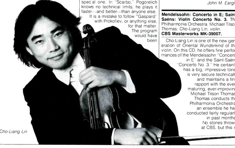 KEITHBOARD ARTISTRY The Köln Concert: Keith Jarrett ECM 1064-2. When's the last time a piece of popular music brought tears to your eyes with its breathtaking splendor? Well, be prepared and get your hanky out when you put Keith Jarrett's The Köln Concert on your Compact Disc player. In truth, you won't be weeping throughout, for in between its moments of sheer majesty and introspective beauty, this recording swings, rocks, drifts and soothes. Jarrett is nominally a jazz musician, although his work defies true categorization. (The New Schwann, that venerable reference guide to recordings, has listed him in its classical category.) This concert recording of a 1975 performance at the Opera in Köln, Germany catches Jarrett in one of his most accessible modes, weaving beautiful melodies throughout a typical freeform performance. There is a wonderful ebb and flow to this material, as Jarrett drifts along in the wash of a lovely introspective pattern, then builds subtly and slowly to a swelling crescendo from which he smoothly descends to the next melodic well. Although this is a solo piano concert, Jarrett's music has moments of such density and richness that the memory retains the impression of an orchestrated piece. In contrast, there are also passages of such shimmering delicacy that they seem to have been created in the listener's mind and not by a musical instrument at all. Such a moment occurs about a third of the way into the first piece, when a last, deep piano note reverberates and fades, leaving a hazy cloud of sound into which a quick, light arpeggio is tossed like a glittering handful of silvery fairy dust. The recording is ECM splendid. It is crystal-clear, with an impeccable sense of space; just the sound of the audience applauding conveys an accurate aural impression of the size of the hall. Hats off to the producer, once again ECM's brilliant Manfred Eicher, and to the engineer, Martin Wieland. Surfaces are, of course, pristine, and those all-important stretches between distant, thoughtful notes are blessedly silent. One problem here has nothing to do with the technical handling of this CD. Keith Jarrett, like a few other instrumentalists who become totally engrossed with their work (the late Glenn Gould comes to mind), has a habit of accompanying himself vocally. His subdued but audible whoops, howls, and groans of delight may prove distracting to some listeners. Personally, I enjoy hearing the artist get so lost in his own performance. Although this CD offers more than 59 minutes of Jarrett at Köln, it is missing the fourth side of the original two-disc vinyl album. For faultless, durable sound, stick with the CD. For seven more minutes of Keith Jarrett's exquisite pianism, get the double vinyl set as well. Paulette Weiss Max Steiner: Film Score for King Kong. The National Philharmonic Orchestra, Fred Steiner. Southern Cross SCCD 901. Max Steiner was unquestionably one of the finest composers of film scores from the '30s through the '50s. The hallmark of a fine composer for the film medium is, of course, the knack for integrating the score into the action of the film itself. Not much film music can stand on its own in an expanded concert presentation, and the very attributes that make it good for the film may militate against it in the concert hall. The exception, of course, is the symphonic synthesis, often done by someone other than the composer, which presents highlights of the score in a condensed form 8 or 10 minutes in length. If you recall the immensely successful film music series on RCA conducted by Charles Gerhardt, you know what I have in mind. For anyone except the real film buff or Steiner devotee, there is simply too much King Kong here. Otherwise, the music is beautifully played, and the recording engineering and production are excellent. John M. Eargle Mountain Dance: Dave Grusin. GRP D-9507. Have a drink. Grab a handful of nuts or pretzels. Chat with a friend. Put Dave Grusin's Mountain Dance on your CD player. Listen, sip, talk, listen, nibble. Get the picture? Mountain Dance will not exactly command your full attention. The tunes are attractive, the recording-another rare pop original digital master-is excellent, but, despite the obvious technical competence, both in musicianship and studio-to-disc processing, there's little here of real substance. The cuts are uniformly pretty, varying in tempo and intensity from the introspective Grusin acoustic piano solo, "Thanksong," to more up-tempo boppers like "Captain Caribé." With the exception of the somehow thin "Rag Bag," with its skinny, whining synthesizer accents, the recording is technically excellent throughout; the CD captures delicate textures and textural contrasts, lovingly reproduces the wide variety of sounds the keyboards and synthesizers whip up, and gives real definition to aural space and instrumental placement. Grusin and company dared to record live, direct to a two-track digital format. This meant forgoing the remixing step on which most pop records depend for final balancing, diminishing and/or eliminating mistakes, and generally perfecting the final product. Give Grusin a pat on the back for his bravery. Then have another drink. Have a pretzel.... Paulette Weiss ![]() Cho-Liang Lin Ravel: Gaspard de la nuit; Prokofiev: Sonata No. 6. Ivo Pogorelich, piano. Deutsche Grammophon 413 363-2. The sensational young Yugoslavian, No Pogorelich, has been raising eyebrows for a few years. His unorthodox interpretations at the prestigious Chopin Competition a few years ago split the panel of judges down the middle and resulted in his failure to qualify. While there may be certain norms for performing Chopin, Ravel and Prokofiev allow for a bit more experimentation. In the case of the three poems for the piano in "Gaspard," the unorthodox approach brings out more detail than I had thought possible. "Ondine" starts out at what many would call a practice tempo; however, the musical line remains pliant