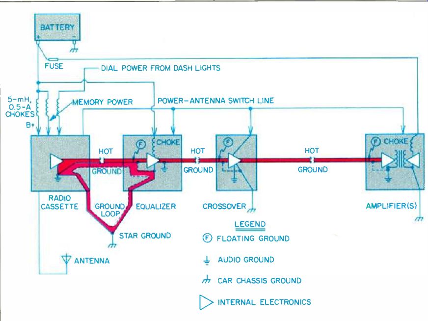 ![]() by DANIEL SWEENEY A favorite theme in advertisements for autosound components is the "hostile environment" of the automobile, and how the particular components advertised manage to sound wonderful amidst all the hostility. The effects of the elements are frequently alluded to-the parching sun, the chill of a northern winter, the ravages of air pollution-but seldom is any mention made of that greatest of autosound cripplers, the noise that infests an automobile's electrical system. That topic--so the industry appears to believe--is best left unexplored. For the problems of noise are so wide spread (and so little under the control of the manufacturers themselves) that to touch on the matter at all could only confuse the consumer. ![]() ![]() In fact, most aftermarket autosound equipment, and many OEM factory-option systems, suffer from at least some extraneous noise during operation. By noise I mean electrical noise-technically, crosstalk between the audio circuits and the various other electrical circuits in the car. To be sure, automotive audio systems are also plagued with extremely high ambient noise levels, microphonic tape heads, resonating speaker enclosures and mountings, and all manner of purely acoustical problems, but most of these are inseparable from the automotive environment. The purely electrical noises are much more amenable to solutions, and are more interesting to investigate as well. Indeed, unless the audio components are themselves defective, virtually arty autosound system can be purged of electrical noise. And you as a consumer need not and should not tolerate any extraneous noise in a custom installation you have purchased. An automobile fosters electrical noise problems in an audio system because it houses a great many electrical circuits and because it is difficult to properly ground all of these circuits and isolate them from one another. Audio signals in an autosound system, as in any electronic audio system, take the form of alternating currents which fluctuate over time with waveforms en coded in the recording medium at the sound source. Noise is created by any extraneous alternating current having no relation to the program signal, and it is always AM-amplitude-modulated. Such extraneous currents may have their point of origin in the car's electrical system-most frequently in the alternator or ignition. Or they may come from separate audio transceiver systems such as CB radios or cellular telephones, from one of the car's mechanical systems (due to a buildup of static electricity), or, occasionally, from sources outside the car. In all cases they represent leakages into the audio circuits; they are not to be confused with distortion, where components fail to pass an input waveform accurately and spurious waveforms are generated w thin the audio circuit. Noise in an autosound system may take the form of a steady whine; clicks and pops; high-pitched, twittering sounds known as "birdies," or a continuous ticking. The noise may be level-dependent (that is, it may rise and fall with the strength of the audio signal at speaker level), or it may be at constant volume and largely masked when the program signal is strong. Noise may be continuously present or maddeningly intermittent. It may occur only when the tape or tuner section is in use, or may be present in both modes. Noise is more likely to intrude in systems containing a multitude of components, simply because there are more points at which the noise may enter the audio system. But all autosound systems are vulnerable to noise, even those that are factory-installed. Noise may enter the signal path at any point, from the antenna right up to the speaker cables. The earlier in the signal path the noise enters, the more severe it will be at speaker level be cause the noise will be amplified along with the signal at each gain stage in the signal path. Noise may enter the system directly through the positive power leads from the battery; it may be induced by powerful magnetic fields from electrical cables running adjacent to audio cables or components; it may be radiated through the air in the form of radio-frequency interference; it may enter through ground loops formed by false grounds, hovering above true ground potential, or it may take the form of crosstalk between or among audio components in the system. For every noise problem in a car, there exists a specific remedy based upon generally held engineering principles. The trick is to identify the source of the noise. Identification tends to be the major task in noise suppression simply because of the wide variety of electrical systems to be found among different models of cars, and because of the varying immunity to noise even among cars of the same make and model. Techniques of suppressing noise in automobile systems evolved by trial and error. Theory could explain both the nature of electrical noise and the circumstances in which it could occur, but the actual, physical sources of noise within a car had to be discovered by a painstaking isolation of components within a system while evaluating the effects on noise level, by shielding potential noise generators, and by instrument testing of the car's electrical circuits. A number of manufacturers and installers, many of whom did ground breaking work in noise suppression, provided me with considerable assistance in writing this article, among them Charles Apcar, of Apcar Engineering in Los Angeles, Cal.; Roger Holdaway, founder of Speakerworks, an autosound retail chain in Orange County, Cal.; Larry Frederick, recently of Proton; Steve Mantz, president of Zed Audio, a manufacturer of high-end automotive electronics, and finally, the technical-services staff at Alpine-Luxman. I might add that Holdaway and Apcar, among the most respected installers in California, pioneered techniques of high-end installation during the late '70s. Holdaway is also a manufacturer of automotive loudspeakers and enclosures. ![