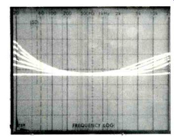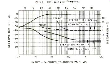 Fig. 4-Composite plot of possible response curves available with the Fosgate PR-7000 auto amplifier. Summary The PR-7000 is extremely simple to install under the dashboard and is suspended by means of a single supplied bracket. While it naturally draws a considerable amount of current from your car battery when operated at high levels, under no-signal conditions, current drain was about 1/3 of an ampere. By itself, the unit had a signal-to-noise ratio of 65 dB as claimed, far better than most program sources that would be connected to it. This noise (disregarding the 35 kHz switching component) is primarily of a random nature and, as might be expected from a d.c. operated device, totally free of hum components. While the orders of distortion produced by the PR-7000 are not nearly as low as those produced by home high fidelity amplifiers, they were far better than those observed on most mini-powered all-in-one car stereo units. If you crave good, big sound in your car or van or boat, this high powered amplifier can deliver it. Fosgate claims that in the close environment of a car, SPL levels of 115 dB have been obtained using the PR-7000. Much, of course, will depend upon the quality of associated speakers used with the amp and with their ability to handle such levels of power. Given a good set of speakers and reasonably good program sources, even with the equalization controls set for full boost (in most cases you won't need that much compensation), midrange average sound levels of 100 dB should be obtainable without taxing the power output capability of the PR7000-and that's really quite a lot of sound when you're on the road. Leonard Feldman ============== 2. J.I.L. Model 615 CB/AM/FM/MPX. Radio/Stereo Cassette Player ![]() Sooner or later, someone was bound to combine a AM/FM stereo radio-cassette car unit with a 40-channel C transceiver in a single, compact, behind-the-dash unit fo car use, and the distinction of having accomplished that feat belongs to J.I.L. Corporation of America, whose broad line of auto electronic products is probably well known to read ers of this magazine. Even more amazing is the fact that all o these electronic goodies are contained in a cubic volume n greater than that occupied by ordinary AM-FM cassette ca units. Like so many other late-model CB units which including all of the newly approved CB frequencies (now totaling 40 the hand-held microphone serves many important functions other than just being a transducer. A thumbwheel at the right of the microphone assembly changes channel, whose numbers are displayed on the front face of the mike by means of illuminated LED digital readouts. A push-to-talk switch is located on the left of the microphone case, and above it is an r.f. gain control. Needless to say, there's a pretty thick cable running down from this microphone assembly to the chassis proper but that cable terminates in a multi-pin plug so that it can be easily disconnected and stored when not in use, or removed from the car to prevent possible theft. The chassis proper, intended for behind-the-dash permanent mounting, features dual concentric controls at either end of the front panel. The pair of controls at the left turn on the unit and control volume, and serve as a tone control. Those at the right take care of station tuning and left-right speaker balance. A cassette cartridge door flap is centered above the stationary dial scale area and permits insertion of a cassette tape only when it is properly oriented. ![]() Fig. 1--FM quieting and distortion characteristics of the J.I.L. 615CB. At the left is a fast-forward tape transport button which also serves as an eject button for the inserted cassette. To the right of the cassette/dial scale area is a continuously variable squelch control used to eliminate noise when no CB channel is being received. Below the dial area, to the right, are the AM/FM selector button, a mono-stereo selector button, and a special standby switch which activates an unusual circuit developed by the people at J.I.L. and patented by them. With this button depressed, if you are listening to music via any of the available program sources and a CB signal is received on the channel you have selected, the circuit automatically switches over to CB reception, returning to your previous program source once the received signal goes off the air! Additional features at the lower left of the panel's center area are a CB button (depressed for continuous CB operation), a "transmit" light, and a dual-purpose indicator light that illuminates when CB signals are received (so long as squelch is overcome) or, in the case of FM reception, when a stereo FM signal is tuned to. Another indicator light centered below the dial area tells you that you are listening to a tape cassette program. All of this on a panel surface that measures only 2 in. by 7 1/2 in. wide! Circuit Highlights A complete schematic diagram is supplied in the owner's manual accompanying the J.I.L. 615CB and, while it does not detail construction of the FM front end of the unit, we did note that the i.f. section uses an IC amplifier, plus a second IC limiter-quadrature detector circuit followed by an IC phase-lock-loop multiplex decoder section. The AM circuitry uses three bi-polar transistor stages in a fairly conventional circuit arrangement. Tape head signal pre amplification is accomplished by means of a single dual channel IC, while the main amplifier module contains a pair of IC power circuits, one for each speaker channel plus two additional voltage amplifier bi-polar transistor stages. The novel tone control arrangement used in this amplifier circuit combines the action of a conventional treble control with that of bass-boost loudness compensation, so that rotation of the control clockwise (when the volume control is at less than maximum settings) results in simultaneous bass boost and treble attenuation. A separate module board is used for the CB transmit circuitry wit