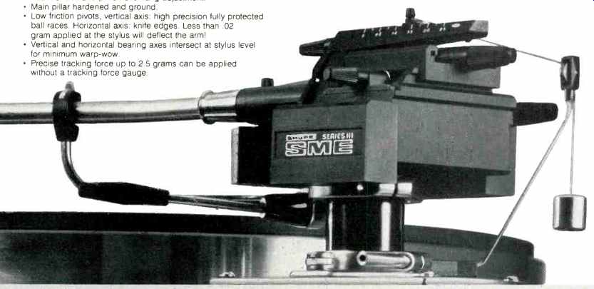 fact: the Shure/SME Series III is the state of the art in tone arms. Breakthroughs & Improvements. The Series Ill is the culmination of research and development extending over more than seven years. It embodies a number of significant breakthroughs as well as evolutionary improvements over its distinguished Shure/SME predecessor. Notable among these is an exotic nitrogen-hardened titanium tubing arm (with wall thickness only twice the diameter of the average human hair) providing a previously unattainable strength-to-weight ratio. The arm has a soft core annular cross-section with an internal fibrous lining which results in an efficient, natural damping of the vibration fed into the arm by the cartridge. Cartridge Carrier. The Series Ill "cartridge carrier," a combination tone arm and shell in one piece, is removable and interchangeable for multi-cartridge use. Coupling is close to the fulcrum so the carrying arm makes a minimum contribution to the Series Ill total effective mass (only 5.05 grams measured at 9 inch radius!). Fluid Damper. A built-in highly efficient F.D. 200 Fluid Damper gently but effectively resists spurious or potentially damaging stylus forces in both planes, yet does not interfere with normal arm motion. --"The best pickup arm in the world." THE SME SERIES III PRECISION PICKUP ARM WITH THE NEW SHURE V15 TYPE IV CARTRIDGE The combination of the Shure V15 Type IV cartridge and the SME Series III tonearm transcends previous tone arm-cartridge system performance, and sets dramatic new standards in connoisseur-class high fidelity reproduction. ...other features of the unique SHURE/SME Series III precision pickup arm: Unique balance system enables cartridges weighing 0 to 12 grams to be operated under conditions of minimum inertia. Interchangeable integral carrying arm replaces conventional tone arm and shell. Positive rack and pinion overhang adjustment. Main pillar hardened and ground. Low friction pivots, vertical axis: high precision fully protected ball races. Horizontal axis: knife edges. Less than .02 gram applied at the stylus will deflect the arm! Vertical and horizontal bearing axes intersect at stylus level for minimum warp-wow. Precise tracking force up to 2.5 grams can be applied without a tracking force gauge. Bias (antiskating) with fine adjustment. Longitudinal and lateral balance with fine adjustment. Ultra low-distortion geometry. Fluid-damped lowering and raising control. All electrical contacts heavily gold-plated. Superb camera finish throughout. 1978 Design Award from the British Design Council. Shure Brothers Inc., 222 Hartrey Ave., Evanston, IL 50204 ----------------- Radio Shack "I'm very impressed with the way Radio Shack has translated latest technology into good looks and precision record playing in the 400.” Realistic Direct-Drive Automatic ... Finest Turntable We've Ever Offered Two motors, damped cue/pause, S-shape tonearm, speed controls, $39.95-value Realistic/Shure cartridge The LAB-400 makes studio performance both affordable and convenient. Its massive die-cast platter rests directly atop a 16-pole brushless DC servomotor. The platter and motor rotate at the same speed, either 33 1/3 or 45 RPM no idler wheels, reduction gears or belts to alter the music that's stored in your record's grooves. The result: wow and flutter is less than 0.03% WRMS and rumble is better than -63 dB (DIN B). The fully automatic tonearm has an effective length of 8 11/16”, for flawless tracking down to 1/2 gram. Handsome walnut vinyl veneer base with ultra-modem, slim design. Elliptical-stylus magnetic cartridge and detachable hinged dust cover significant "extras" that aren't extra. All for $199.95. Fully Automatic Tonearm Operation You need never touch the tonearm-just select record size and push start switch. An independent motor does the rest, cueing the arm, gently lowering it onto the record, and removing it at disc's end. With repeat mode, cue/pause, anti-skate and tracking force controls. Two speeds with controls for ±4% pitch adjustment. Neon light with strobe disc for checking speed. Low-profile styling with precision shock mounts to stop acoustic feedback.