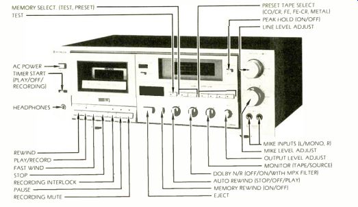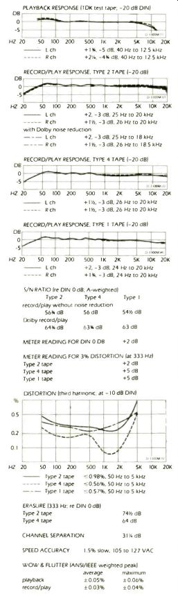 ![]() Hitachi's Thoroughgoing Tape Adjustment Hitachi D-3300M cassette deck, in metal enclosure with simulated wood-grain finish. Dimensions: 17 1/4 by 6 inches (front panel), 10 inches deep plus clearance for controls and connections. Price: $700; optional RB-100 remote control, $40. Warranty: "limited," three years parts and labor. Manufacturer: Hitachi, Ltd., Japan; U.S. distributor: Hitachi Sales Corp. of America, 401 W. Artesia Blvd., Compton, Calif. 90220. We continue to marvel at self-adjusting decks, though the microprocessor technology that makes them possible is not abstruse and, at least at the upper price levels, the inclusion of some sort of automated tape matching is not all that uncommon. When you start recording on the D-3300M and press TEST START, the AIRS (Automatic Tape Response System) panel comes to life: The 1-kHz LED comes on, followed by that for 7 kHz, alternating with that for 15 kHz until the microprocessor is satisfied with the flatness and Dolby calibration of its work. Then the deck stops, and we sit bemused. In the face of so pre-emptive a feature, it's hard to focus on all the others in this very enjoyable deck. But let's start with the transport itself. As the accompanying data show, speed is totally unaffected by line voltage but notably on the slow side. Most decks run a bit fast (improving high-frequency response ever so slightly), and we generally consider anything within ± 1% as above reproach for consumer purposes. Thus, a figure of 1.5% slow is surprising. It might even prove a subject of complaint if you were to play on it tapes made on a deck that runs 1.5% fast, or vice versa, because reproduced pitch would then be about a quarter-tone off the mark. (That is, middle C would reproduce about half way between C and either B natural or C sharp, depending on which machine was used for recording and which for playback.) This still would not be a major consideration in most consumer applications (remember that, when you record and play on the same machine, pitch remains exact), and the speed behavior of the transport is otherwise excellent. Notice, in particular, the wow figures; those for record/play are lower than those for playback, meaning that there is less wow in the deck than in the test tape, and are in the champion class--never bettered and seldom equaled since we began using the ANSI measurement spec two years ago. The credit presumably is due to Hitachi's brushless, coreless, slotless capstan-motor design. This, we think, is more important than absolute speed. ![]() There are some nice twists to the transport controls, whose "logic" permits ad lib hopping from one function to another without passing through STOP or collecting damaged tapes. If you simultaneously press the recording interlock and the PAUSE, the PLAY button automatically lights as well; you are ready to go when you release the PAUSE (which actually requires you to press PLAY in this deck). Unfortunately, the tiny LEDs that indicate current operation mode are omitted from the fast-wind buttons; since it's relatively difficult to see what's going on in the cassette compartment, we found ourselves squinting at the deck trying to determine whether a fast-wind mode had begun or ended. On the other side of the ledger, the PAUSE makes exceptionally transient-free "edits" on the tape-no pops, no ticks, no burbles, so to speak-and leaves only a tiny (approximately 1/4 second) hiatus in any sound continuing through the pause. The metering scheme is pleasant, though it, too, struck us as a good idea that could have been better. The pattern is clear and the calibration adequate, extending from-20 to +8 aB with 1-dB increments between-3 and +3 dB. And Hitachi gives you a choice of peak or peak-holy modes, with quick response and no overshoot. But the peak hold does not decay after a few seconds to let you know what range the sound has got into in the meantime (an arguable benefit since it will "remember" a maximum even if you're out of the room). And it doesn't operate at all below-1 dB, meaning that, if you don't have the level set near the correct spot to begin with, the peak hold won't help you get it better. Passing over the many other well-recognized features cataloged in the picture, that brings us back to the piece de resistance: the automatic tape matching. As the presence of three test frequencies should suggest, it does considerably more than most user-adjusted bias/sensitivity controls You begin the process by choosing one of four tape groups (corresponding to our Types 1-4), which determines the microprocessor's starting point and methodology. If, for any reason (for example, because you've pressed the wrong tape-type button), the microprocessor can't successfully complete its adjustments, it will stop the transport and flash the TEST button's LED to signal the error. But if all goes well, the microprocessor adjusts for tape sensitivity (to the nearest 1/2 dB), determines bias response, and sets bias from it according to a formula for the tape type, then goes for flattest response by trimming recording equalization in two bands. The methodology is a close approximation of what a technician would do on the test bench and makes most user controls seem unconscionably crude by comparison. The results, as you might expect, were excellent replication, using the monitor switch to A/B playback with source, on any branded tape we threw at the deck. On the Diversified Science Laboratories test bench, the microprocessor seemed to have some doubt about how to set the deck for metal tapes, but we consistently got excellent results with them in listening tests. All this makes it relatively unimportant which brands are used for measurements. We weren't surprised that Hitachi suggested tapes from its Maxell subsidiary_ UDXL-I for the Type 1 ferric, UDXL-II for the Type 2 ferri-cobalt, and MX for the Type 4 metal. Actually, Hitachi offers its own branded product in all three categories and ado