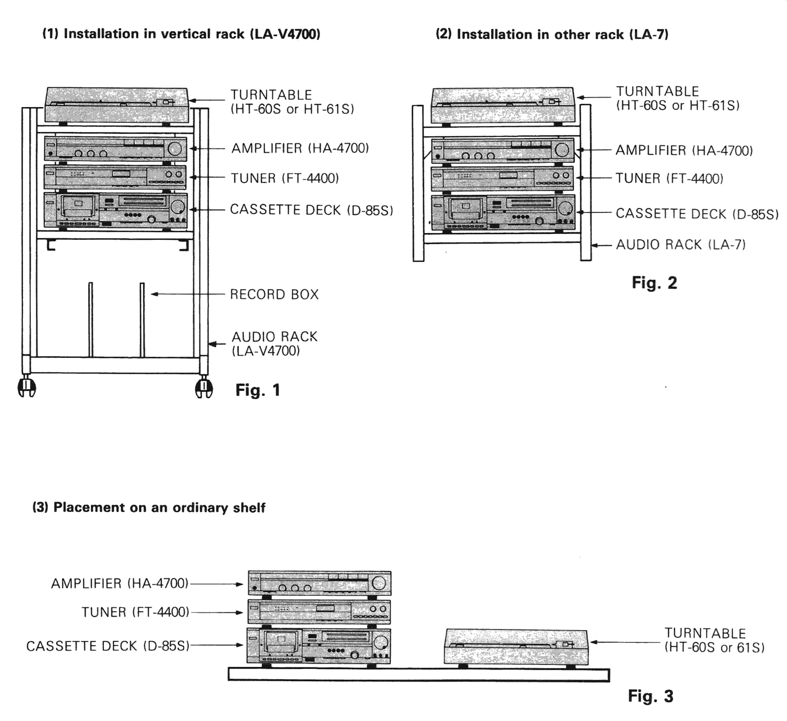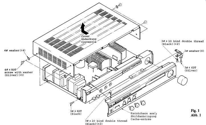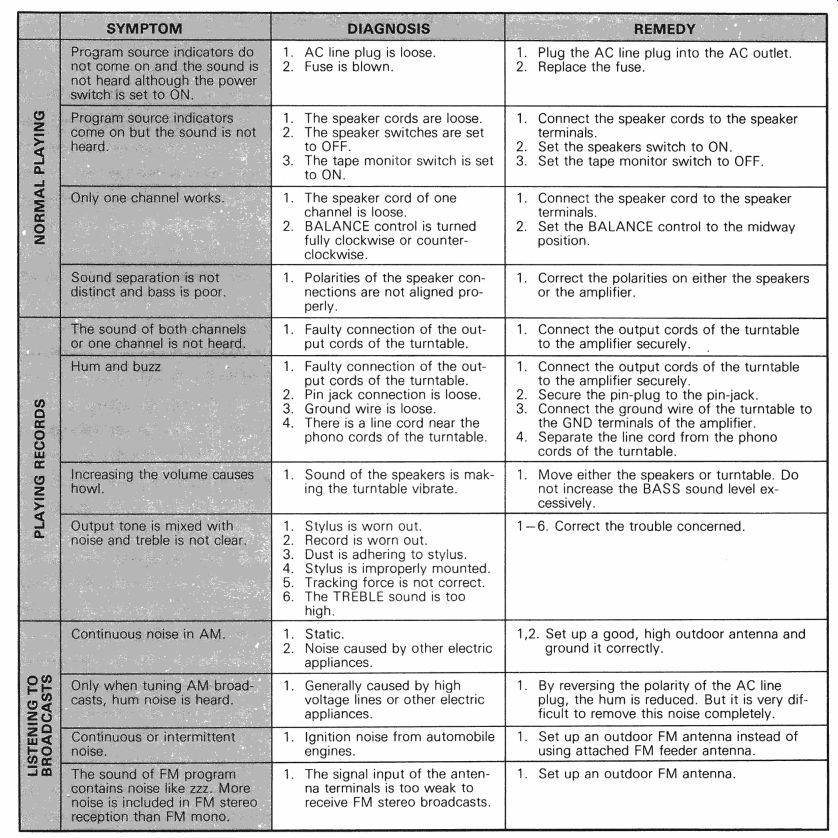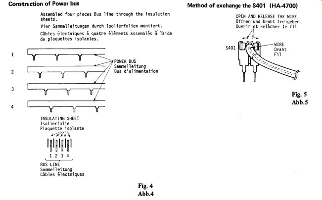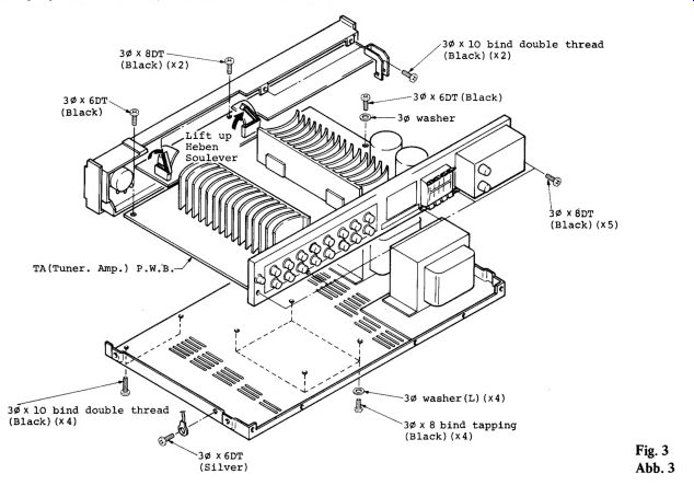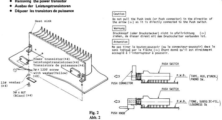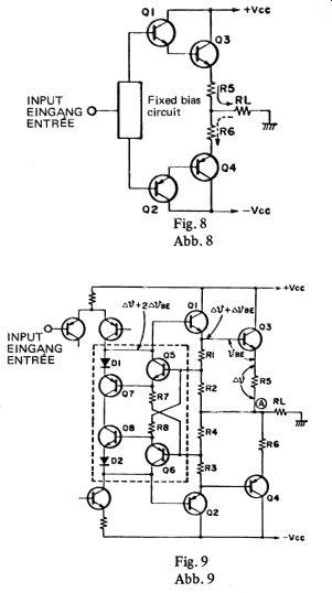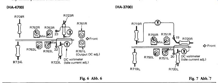 Adjust R751L(R) so that the voltage is 7.7mV. Next, adjust R750L(R) so that the voltage is mini mum (7.7mV *2mV). When this is impossible, When this is impossible, repeat items (1) and (2). (Fig. 7) Checking the super linear circuit When the balance adjustment becomes impossible (when R762 <~HA4700 or R750 «<HA-3700 is adjusted, the minimum point of current disappears and only increase or attenuation is possible) during the idle current adjustment, this indicates trouble in the super linear circuit transistors (Q705-708) so check it. (HA-3700) R719R R750R DC voltmeter R761L R723L (idle current adj.) ( Output DC adj.) R724L Fig. 6 Abb. 6 Cautions on repairing and replacing parts A4700/3700 Be careful that the measuring instrument does not touch he parts around the part to be adjusted by mistake when adjusting the idle current, etc. Carefully adjust idle current, etc. using an adjusting screwdriver insulated with tape, etc. Care has been taken in use of such parts as using fuse resistors, floating installation, etc. to improve safety. Be sure to use specified parts when replacing parts and install in the original condition. if a measuring instrument with low impedance such as the tester is used when measuring the voltage of the first-stage transistors (Q701 - 703) of the main amp, ES DC voltmeter (Idle current adj.) R719L Fig. 7 Abb.7 ![]() ![]() ![]() ![]() ![]() ![]() ![]() (1) The output DC adjustment may be changed when the parts of the stabilized power circuit or the main amp. are replaced. Be sure to check the output DC voltage. (2) Check Q803 and Q804 when the +B voltage is not present. This circuit operates to accelerate the decay characteristics to the stabilized power circuit of the +B power supply when the power is switched OFF. (3) 2 power transformers are used in this unit. When the thermal fuse of the power transformer or the primary fuse is blown, the bias of the transistors Q701 - 703 disappears and the amp. does not operate. HA-4700 /3700 Caution on assembly Be careful in layout during installation of the switch PW before. installing the switch PW Board. Board to the sub panel so that the 8-core jumper leads (3) Match the marking side (colored side) of the lead and does not touch the input selector switch. ~ mark wv stamped on the PW Board when installing the Install the PHONO selector switch to the sub panel 7-core/8-core jumper leads to the jumper socket. HITACHI HA-4700/3700 DESCRIPTION OF THE NEW CIRCUIT HA-4700/3700 Super linear circuit The class B amplifier circuit is constructed as shown in Fig. 8. A constant idle current flows from the fixed bias circuit, Q3 and Q4 are alternately switched ON/ OFF corresponding to the input signal, and current flows to Load Ry. However, with this transistor, the response of the output current is delayed with respect to the base input current due to the time of the carrier storage at the base when this transistor changed from OFF to ON. As a result, it causes generation of switching distortion when the transistor changes from OFF to ON; the frequency increases as the signal frequency is higher. So, a circuit which varies the conventionally fixed bias voltage according to the signal strength applies a constant bias voltage when there is no signal to prevent Q3 and Q4 from being set to OFF and prevent the generation of switching distortion has been installed. The circuit surrounded by broken lines in Fig. 9 shows this bias circuit; this is called the super linear circuit. In Fig. 9, the output neutral point (A) with non-signal is assumed to be the reference. When a positive signal is input, positive current flows to the load resistor Ry. Voltage drop Ay occurs in RS and Ay gg, in Q3 by means of this current, the emitter (Base of Q3) voltage of Q1 becomes higher by Av + Ay gg compared with that during no signal and the base bias of Q5 becomes higher. When the base bias of Q5 becomes higher, the current increases, the voltage across R7 becomes higher, and the bias voltage of Q6 does not change compared with that of point (A). Accordingly, the base voltage of Q2 which is biased by Q6, Q8 and D2 is kept approximately the same as that during no signal, and the idle current continues to flow. In the case of a negative signal, the reverse operation is performed keeping the base bias of Q1 constant. In the actual circuit, variable resistors are used for R2, R4 to adjust idle current, and in addition, a circuit which performs thermal compensation is installed. LED power meter drive circuit 12 LEDs (HA-3700 7LEDs) per channel are used to indicate output level. These LEDs and driven by meter circuit; the relationship between the output level and the number of LEDs lit when 82 speakers are connected is as shown in Fig. 10. Incidentally, Fig. 11 shows the operation circuit. HA-4700 Equalizer amp. circuit (Fig. 12) This circuit is composed of a low noise transistor (2S8C2546) and low noise IC (HA12017) combined, to directly connect an MC cartridge. By this, high sensitivity (input sensitivity: 0.15mV), high S/N ratio (90dB with an MM cartridge, 73dB with an MC cartridge [converted to 0.25mV input] ) are obtained. +++++++++++++ ![]() ![]() ![]() ![]() ![]() CHECKING THE OPERATION OF THE PROTECTION CIRCUIT When the output circuit is repaired by replacing the power transistors, etc., perform an operation check on the ASO (Area of Safe Operation) detection circuit and the speaker protection circuit. 1. Operation check of the ASO detection circuit for the output transistors Connect the audio oscillator to the TUNER IN terminals with the speaker terminals unloaded (speaker: disconnect). Set the frequency of the audio oscillator at 1kHz and adjust the level of the input signal so that the voltage at the speaker terminals is approx. 5V rms. Under these conditions, short-circuit the speaker terminals of the channel to which the input signal is applied using a lead wire, etc. If this short-circuit makes the ASO detection circuit operate, no output appears a