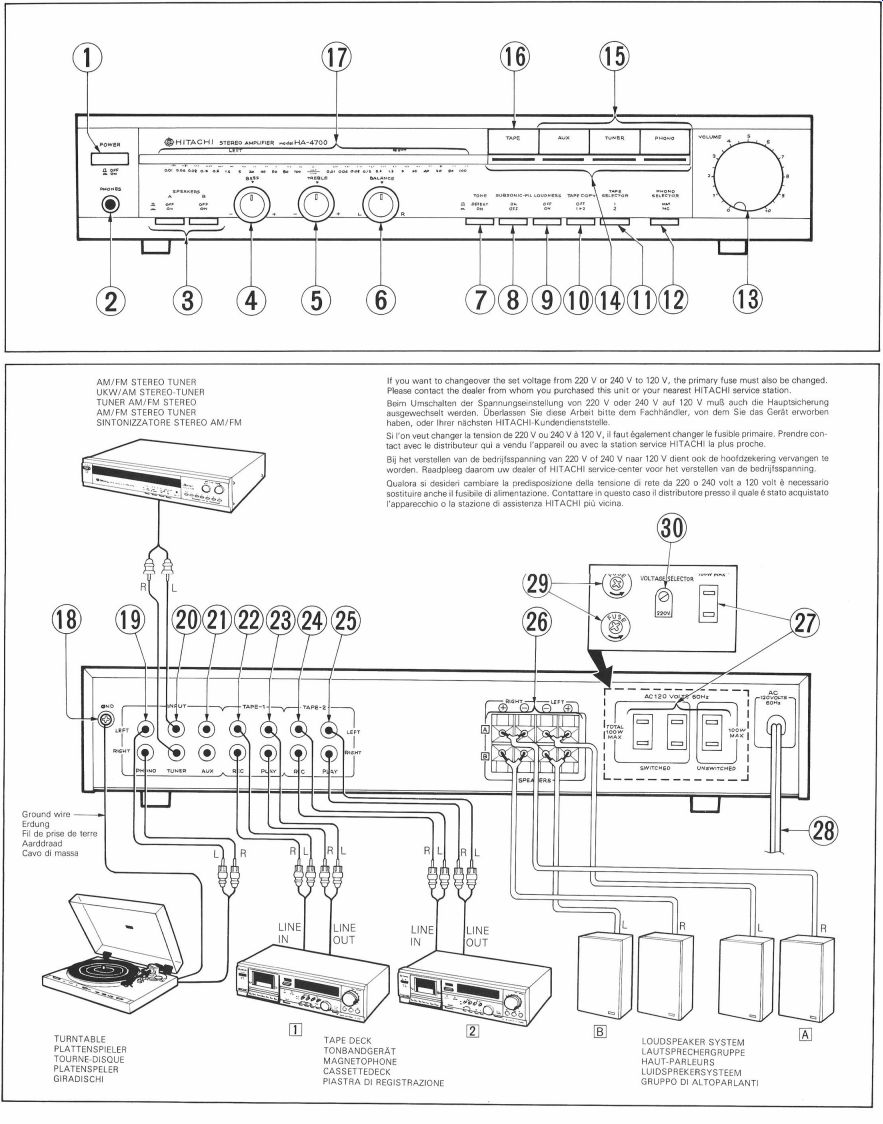 When we drove both channels at 1,000 Hz into 8-ohm loads, the output waveform clipped at 60.5 watts for an IHF clipping-headroom rating of 0.83 dB. The amplifier is not rated for use with lower load impedances, but we measured clipping outputs into 4 and 2 ohms of 54.8 and 25.2 watts, respectively. The IHF dynamic headroom (8 ohms) was a very good 2.58 dB, corresponding to a maximum short-term output of 90.6 watts. Into 4 and 2 ohms the dynamic power output was 60 and 29.7 watts, respectively. For a reference output of 1 watt into 8 ohms, the HA-4700 required an input into the AL x jack of 24 millivolts (mV), 0.32 mV into the PHONO (MM) jack. The respective A-weighted noise levels were -83 and -81 dB referred to 1 watt (both very good readings for an integrated amplifier). The phono-preamplifier stage overloaded at a high 230-mV input at 1,000 Hz, and the equivalent overload limits at 20 and 20,000 Hz were 250 and 152 mV. The phono-input impedance was 46,000 ohms in parallel with 250 picofarads. Although we made no measurements with the MC input, its gain is about seventeen times higher than the MM input (+24 dB), and it terminates the cartridge in 100 ohms. The harmonic distortion of the Hitachi HA-4700 was extremely low. With 8-ohm loads, the distortion at 1,000 Hz was between 0.004 and 0.008 per cent from I to 50 watts output, reaching the rated 0.02 per cent at 60 watts just as clipping was beginning. The performance into 4-ohm loads was generally similar, with distortion readings falling from 0.03 percent at 1 watt to well under 0.01 percent between 20 and 50 watts and rising to 0.08 per cent at 55 watts. The amplifier's output-current limitations prevented it from delivering much power to 2-ohm loads, and its distortion was in :he range of 0.015 to 0.04 percent for outputs up to 25 watts. The two-tone intermodulation-distortion measurement with equal amplitude signals at 19 and 20 kHz revealed no detectable second-order distortion (1,000 Hz) and a barely detectable third-order product (18kHz) at -92 dB referred to the rated 50-watt output of the amplifier. The slew factor was greater than 25, and the amplifier rise time was 4 micro seconds. The overload-recovery time (from a 10-dB overdrive condition) was a negligible 5 microseconds, and the amplifier was stable with simulated complex reactive speaker loads. The distortion at rated power output was no more than 0.002 to 0.008 per cent over most of the audible frequency range, reaching a maximum of 0.015 percent at 20,000 Hz and falling to a nearly unmeasurable 0.0007 percent from 3,000 to 7,000 Hz. At half and one-tenth power the shape of the distortion curve was similar, with only slightly higher readings. The tone controls had a sliding bass-turn over frequency (from about 100 to 500 Hz) and treble curves hinged at 2,000 to 3,000 Hz. The maximum bass boost occurred in the range from 50 to 100 Hz. The loudness compensation boosted both low and high frequencies, but only moderately. The "subsonic" filter appeared to have only a 6-dB-per-octave slope, with its-3-dB response at 60 Hz and-10 dB at 20 Hz. The RIAA phono equalization was accurate within ±0.25 dB from 20 to 20,000 Hz, and the inductance of most cartridges caused no more than a 0.5-dB rise in the output be tween 10,000 and 20,000 Hz. Comment. The Hitachi HA-4700, although appearing with relatively little fanfare or publicity, has most of the features that have been seen of late in the top amplifiers of many other manufacturers. It is a compact, handsomely styled, and versatile amplifier that sounds as good as it measures. No manner of sonic flaws or operating "glitches" showed up in our testing or listening to the amplifier, and we came away with a thoroughly positive impression of its performance and overall design. The HA-4700 has a very comprehensive protection system that manages to be completely unobtrusive as well as effective. A short circuit across the outputs will shut down the amplifier if it is driven hard, and the power must be switched off for a few seconds to restore it to service. Although a d.c.-offset voltage at the output will also silence the amplifier, it recovers from that automatically when the fault is removed. There is also a thermal cut-out that shuts the HA-4700 off if it becomes too hot. None of these protective systems operated during our tests, in spite of their severity, but it was reassuring to know they were there and waiting if need for them arose. The schematic of this HA-4700 amplifier (pre-amp section) revealed a feature whose presence we would not have suspected from our measurements. A major problem of modern hi-fi systems is their susceptibility to interference from strong radio-frequency fields from nearby transmitters. Often these signals enter through the phono leads, overloading the low-level stages and superimposing the modulation of the r.f. signal on the regular program (or even completely obliterating the program). External filters are a possible treatment for this condition, but their success is uncertain, and there is also the possibility of de grading the amplifier's frequency response by an improper cartridge termination. Hitachi has built an L-C low-pass filter into the HA-4700 at the phono input. We calculate that the filter has a cut-off frequency of about 1.5 MHz, which should help in cases of interference from nearby CB or amateur radio stations, although it probably will not do much if one is unfortunate enough to live in the shadow of a powerful AM broadcast station. So far as we can see, the only sacrifice made for this feature is the relatively high 250-pF input capacitance of the phono section, but this should not cause problems with most combinations of record player and cartridge. [Note: a tweak to improve the phono section mau include elimination of this filter; and simply enclose the amp in a grounded metal cabinet.] The Hitachi HA-4700 is, therefore, a thoroughly up-to-date, very high-quality, moderate-pow