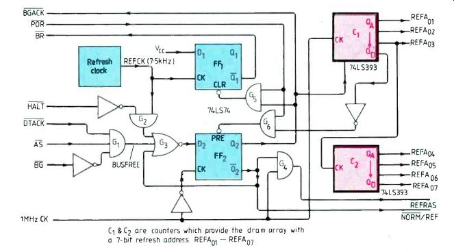 by Alan Clements, Ph.D, Teesside Polytechnic The three parts of this article are based on part of a book 'The 68000: software, hardware and interfacing' to be published next spring by PWS Boston, who are represented in the UK by Wadsworth International. ---- MEX68KECB, referred to in September's article, is Motorola's 68000 educational computer board, requiring power supply and v.d.u. terminal. The ECB has powerful monitor called Tutor which enables 68000 programs to be entered, debugged and executed. Although now somewhat dated its monitor is the basis of most educational and training systems on the market. ----------- Large memory arrays can be produced economically with dynamic ram provided care is taken over timing requirements, refreshing and the supply rail. Part 3 concludes the series. The simplified circuit diagram of the dynamic refresh generator on the 68000 board is given in Fig. 20, and its timing diagram in Fig. 21. A refresh clock operating at 7.54kHz signals the need for a burst of refresh cycles every 1/(7.54 x 103) = 0.133 ms. This design does not carry out all refreshes in one burst-it performs eight cycles every 0.133ms, completing all 128 row refreshes in 0.133 x 16 = 2.128ms. By distributing the refresh operation over 16 bursts of eight cycles, the processor is not held up for any appreciable length of time. The refresh control circuitry on the board uses the 68000 bus arbitration signals, ßR (bus request, Bc (bus grant) and BGACK (bus grant acknowledge). When 1. is asserted by a device wishing to control the system bus, the 68000 responds by asserting its BG out put. The requesting device recognizes Bc and then waits until the end of the current bus cycle before asserting BGACK to claim ownership of the bus. Once BGACK has been asserted, the requester may release BR and the old master releases B i. The new master owns the bus until it releases BGACK. A power-up, POR (power-on-reset from the processor control circuitry) goes low, clearing FF1 setting FF2. Any well-designed circuit should be similarly initialized and placed in a "safe state". In this state, Q 1 (i.e. BO is negated and Q2 (i.e. NORM/RE) is low, signifying normal operation. When the refresh clock, a simple RC oscillator, generates a rising edge, FF1 is set and BR asserted. The 68000 detects the bus request and asserts bus grant sG and-gate G1 detects the condition Bc = 0, As = 1 DTACK = 1, which occurs when the 68000 has relinquished the bus and forces input D2 of FF2 low. Note that the other two inputs to nor-gate G3 (at this time) are both low-one because we will assume HALT is negated and the other because Q2 (NORM/ RRF) is low after FF2 has been preset. When D2 is low, FF2 is cleared on the falling edge of the 1MHz clock. Output Q2 is connected to the 68000 bus BGACK input and, while low, stops the processor from regaining control of the bus. At the same time, it forces the output of and-gate, G5 low, clearing FF1 and negating 13R. Thus FF1 has done its job in this burst of refresh cycles and is once more in its initial state. When FF2 is cleared, its Q2 output goes high; it is also the NORM/REF line controlling the address multiplexer to the ram array. When high, NORM/REF selects the address from the refresh column-counter (i.c’s C1 and C2). The output Q2 is also fed back to the D2 input of FF2 via or-gate G3, so that once Q2 is high the flip-flop is held in this state and no longer depends on the state of Bc from the processor, as BG is automatically cleared following the negation of BR. Flop-flop 2 is now "locked up", Q2 high, and can only be released by the assertion of its PRE (preset) input. The final role played by Q2 is to gate the 1MHz clock in and-gate G4, the output of which is the pulsed Rñs needed in the refresh cycle. Because Q2, when low, allows counter C1 to operate, three bits of the refresh address appear on REFA01 to REFA02 Which form part of the dynamic ram's row refresh address. This counter is clocked at the refresh rate-1MHz. A second-state counter, C2, is clocked by C 1 after eight cycles and provides the remaining four row refresh addresses-REFA03 to REFA07. After the three-bit counter C1 has produced eight pulses, its Qd output rises and disables and-gate G5. This presets FF2, causing Q2 (i.e. BGACK) to be negated, freeing the processor by releasing BGACK and Q2 (i.e. NORM/REF) to go low, disabling and-gate G4 and removing the refresh clock (REFRAS). The system is now in its normal state, with BR, BG and BGACK all negated. The only change since the start of the cycle is that counter C2 has been advanced by one, so that the next time the refresh clock generates a pulse, the following eight row addresses will be refreshed. TMS4500A dynamic ram controller I have always been surprised that the semiconductor manufacturers have done so little to make it easy to interface drams to microprocessors. Some d-ram controller chips have appeared, but most of' them perform little more than address multiplexing and the generation of a refresh address. The designer still has to generate the RAS, CAT and multiplexer timing signals. To be fair, it is not easy to design a d-ram controller because the timing requirements of d-ram chips are very stringent if they are to be operated at their limits. Several controllers have been designed which include all timing and control functions on one chip and which can make a d-ram array look almost like a static ram array. One such device is the Texas Instruments TMS4500A. I am going to briefly overview the chip, but I do not intend to wade through the data sheet and applications manual in any detail here. Figure 22 illustrates its structure. A 16-bit address from the microprocessor is applied to RA0-RA7 and CAo-CA7 and is latched into the controller by the address latch enable input, ALE. If the cs input is active-low when it is latched by ALE, a memory access begins. The 4500 places the row address on its MAo-MA7 outputs and awaits a negative-going 
