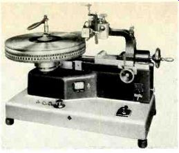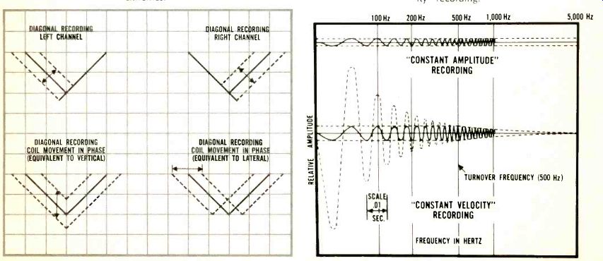 by Albert B. Grundy Stereo Disc Cutting ALBERT B. GRUNDY THE STEREOPHONIC RECORD WAS introduced over 10 years ago (at the October 1957 Audio Enginering Society Convention) . Through these years, many articles were published about the method of obtaining two independent channels in one record groove. Nevertheless, many aspects of stereo groove cutting still remain a mystery to many audio buffs, including a host of recording engineers. Disc cutting heads and cutting systems have an undeserved reputation of being the most temperamental part of any studio operation. Engineers often blame the system when results obtained at previous times cannot be repeated. More often than not, this is due to a misunderstanding of what happened the first time. Tape recording has driven most "instantaneous" disc recording out of existence; the only commercial application left is cutting master records for disc production. In fact, today there are only two European firms (Ortofon and Neumann) and one American Company (Westrex) manufacturing mastering-quality mono and stereo dynamic cutter heads. One other mono cutting system, Grampian, is also used for mastering. It is a magnetic system as opposed to a dynamic system; that is, it has a stationary coil and a moving iron armature rather than a coil moving in a magnetic field. It is of great benefit to understand how mono grooves are cut before tackling stereo grooves, so let us examine the earlier system first. Monophonic grooves Specifications for groove geometry and dimensions are given in great detail in the NAB and RIAA standards for disc recording and reproducing and are, in general, well known to most engineers. That is, static dimensions: depth, width, bottom radius and included angle. And professionals experience no difficulty with lead-ins, spirals, and lead-out grooves. But this is not always true of some of the groove's dynamic characteristics, such as, peak amplitude or velocity in centimeters per second. What happens during modulation is really what we want to know. Not only is the disc moving with turntable rotation, but the stylus is actually in motion perpendicular to the groove. One other concept that should be clarified at this time is groove velocity or peripheral groove speed. The peripheral groove speed is the rate (usually in inches per second) at which the disc passes under the stylus. Since the rotational speed of the turntable is a constant 33% rpm or 1.8 seconds per revolution, the length of groove passing the stylus in one revolution is a function of the instantaneous radius that is being cut. As the stylus moves toward the center of the disc the radius becomes smaller. Consequently, the length of groove that passes the stylus in one revolution becomes progressively less. The circumference at the beginning diameter of a standard 12-in. LP is approximately 36 inches. Groove speed, based on the foregoing 1.8 seconds per revolution, is therefore 20 inches per second. By the same reasoning, groove speed at the RIAA minimum closing diameter is 8.3 inches per second. With modern cutting heads, this variation in groove speed has very little effect on the recording process. It simply means that the packing density of information is about 2.5 times as great as the inner diameter. Its effect really shows up in playback when we try to recover this information. A cutting stylus for monophonic records moves laterally with respect to the plane of the disc surface. In other words, it is actually on the disc radius and instantaneously perpendicular to the rotational motion of the groove. The motion of the stylus and, therefore, the dynamic characteristic of the groove, is most easily examined with sine wave modulation. When the cutter head is driven by a sine wave, the stylus moves from side to side in a straight line. The stylus moves from its center rest position to one extreme, stops, reverses its direction, and moves back through the center position to the other extreme, stops, and repeats the pattern. When the disc is rotating, this motion is stretched out in the form of an undulating groove which has the appearance of a conventional sine wave. The distance that the stylus moves from the rest position to the extreme position (where it stops and reverses its direction) is called the peak amplitude; the distance between the two extremes, which is simply double the one-side distance, is called the peak-to-peak amplitude. This peak-to-peak amplitude actually determines the total over-all width of the groove. Since there must be some space between adjacent grooves, a certain land area must be allowed. The total space allowed for each groove must therefore be the sum of the peak-to-peak amplitude of the groove and the width of the land. The stylus velocity is the rate at which the stylus moves back and forth in the groove. This can be either the cutting stylus or the playback stylus. All dynamic cutter heads and pickups are velocity-sensitive devices or transducers. The pickup transforms the mechanical motion of the groove into a voltage at its output terminals according to the general law: E = BLV In this equation, the B is the magnetic field strength of the permanent magnets in the cutter head or pickup, and the L is the length of wire in the coil. For any pickup or cutter head, these two factors are fixed. Therefore, the equation can be simplified to: E + KV The output voltage, E, of the pickup is directly proportional to the velocity, V, of the stylus and, in the cutter head, the stylus velocity is directly proportional to the driving voltage. (K is simply a constant.) The stylus velocity will be a sinusoidal function if the cutter head's driving voltage is also a sine wave. The stylus moves from the center rest position to one extreme end. And it must slow down to zero velocity when it reaches this end to reverse its direction. It starts to move in the opposite direction, accelerating until it passes through the center position and then slowing do
