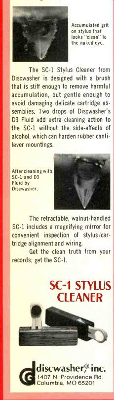 When your stylus plays over one light fingerprint or one tiny "bead" of vinyl stabilizer, the clean naked diamond becomes a glazed, dust-holding abrasive weapon wearing away at your records and masking their true sound. This unseen build-up may actually hold the tracking tip of the diamond out of `. the record groove. Accumulated grit, on stylus that looks "clean" to the naked eye. The SC-1 Stylus Cleaner from Discwasher is designed with a brush that is stiff enough to remove harmful accumulation, but gentle enough to avoid damaging delicate cartridge assemblies. Two drops of Discwasher’s D3 Fluid add extra cleaning action to the SC-1 without the side-effects of alcohol, which can harden rubber cantilever mountings. After cleaning w SC-1 and D3 Fluid by Discwasher, The retractable, walnut-handled SC-1 includes a magnifying mirror for convenient inspection of stylus/cartridge alignment and wiring. Get the clean truth from your records; get the SC-1. SC-1 STYLUS CLEANER discwasher inc. 1407 N. Providence Rd., Columbia, MO 65201, USA. ----------------- A. Telarc Digital