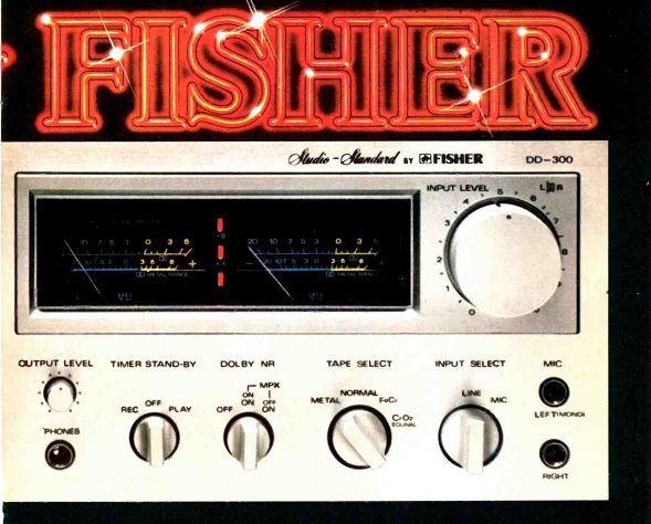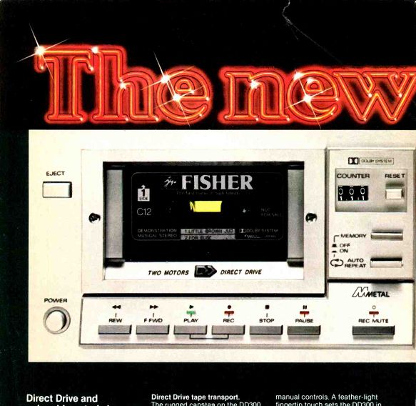 Direct Drive and solenoid controls in a new cassette deck. Here is the very latest cassette deck technology. The new Fisher DD300 Cassette Deck has direct drive tape transport for lasting, unvarying performance, feather-touch solenoid electronic controls for superior operation and metal tape compatibility for the ultimate in frequency response. There's an incredible amount of advanced engineering packed into this new Fisher cassette deck. Direct Drive tape transport. The rugged capstan on the DD300 is directly driven by a high-torque 18 pole brushless, coreless DC flywheel motor, optimized for the critical record and play transport functions. It glides silently at a steady 360 RPM. And, it eliminates the problems of conventional high speed DC brush motors and drive belts. Wow and flutter are down to an amazingly low 0.04%. A separate motor is provided for fast forward and rewind. No compromise. Feather touch electronic controls. Goodbye to the old "clunk-clunk" of manual controls. A feather-light fingertip touch sets the DD300 in motion. An IC logic circuit actuates the solenoid transport function for instant, silent, p3sitive action. LED's light up to continuously display what functions are in operation. Metal tape compatibility. If you want to try the new metal particle tape you've been hearing so much about, the DD300 is ready. Get set for an astonishing improvement in signal-to-noise, dynamic range and a frequency response of 30Hz-18kHz ± 3dB. Get set, too, to make recordings that rival studio-produced tapes. It's what you'd expect from the new Fisher. We don't have the space to list all the other features of the new Fisher DD300. Features that are indicative of the high technology of the new Fisher. We invented high fidelity over LO years ago. And we've never sbpp c innovating. If you're ready for the latest cassette deck technology, Eee tre new DD300 at your Fisher sealer. Fisher Corporation, 21314 Lassen Street, Chatsworth, CA., USA. FISHER The first name in high fidelity: Drive coils provide 18-pole permanent pulsating magnetic ring magnet is field to propel bonded to back of flywheel. Sensing coil between driving coils and flywheel magnet continuously monitors speed in DC servo circuit. Dynamically balanced flywheel weighs over lb., helps maintain speed accuracy, low wow and flutter. Capstan shaft is directly connected to, and is part of the flywheel. There are no belts, no pulleys. Separate motor operates fast forward and rewind functions. Instant, silent, positive tape transport functions are operated by solenoids. --------------------- DON'T BELIEVE EVERY DIGITAL READOUT YOU READ. When you tune to 102.7, you want to stay tuned to 102.7.