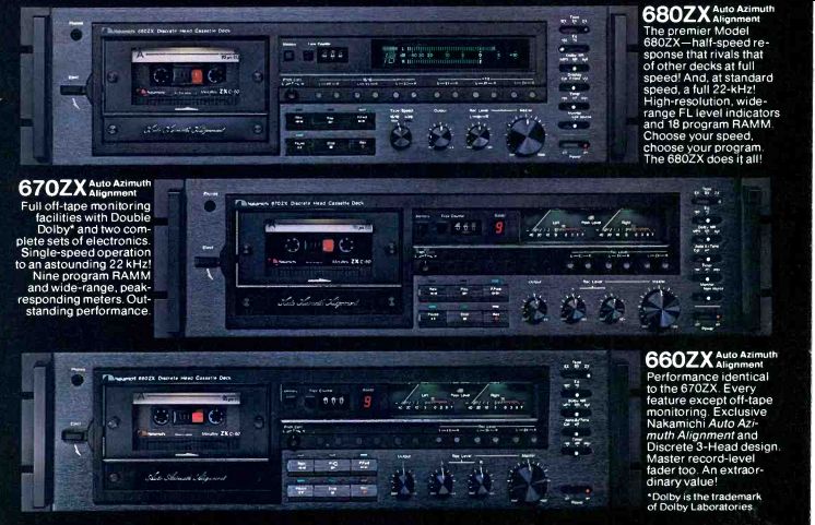 The dawn of a new recording era Auto Azimuth Alignment 680ZX Auto Azimuth Q / Alignment The premier Model 680ZX-half-speed response that rivals that of other decks at full speed! And, at standard speed. a full 22-kHz! High-resolution, wide range FL level indicators and 18 program RAMM. Choose your speed. Choose your program. The 680ZX does it all! 670ZXAuto Azimuth A Alignment Full off-tape monitoring facilities with Double Dolby* and two complete sets of electronics. Single-speed operation to an astounding 22 kHz' Nine program RAMM and wide-range, peak responding meters. Outstanding performance. 660ZXAuto Azimuth Alignment Performance identical to the 670ZX. Every feature except off-tape monitoring. Exclusive Nakamichi Auto Azimuth Alignment and Discrete 3-Head design. Master record-level fader too. An extraordinary value! 'Dolby is the trademark of Dolby Laboratories. Undoubtedly the most advanced and sophisticated innovation in cassette-recorder technology, Auto Azimuth Alignment launches a new era in high-fidelity recording. For the first time, you can be assured of perfect record-head azimuth alignment-on any cassette-at the flip of a switch. And, with that perfection comes an unprecedented frequency response-22 kHz at standard speed, 15 kHz at half speed! Auto Azimuth Alignment-designated by the ZX in the model number-is available now on three revolutionary decks-the 680ZX, 670ZX, 660ZX. Each features exclusive Nakamichi Discrete 3-Head technology, 4-Motor, Dual Capstan, Asymmetrical, Diffused-Resonance Transport, Random Access Music Memory and 22-kHz response at standard speed. And, the 680ZX-joining the popular 680 with manual alignment-matches its unique half-speed recording response of 15 kHz! Auto Azimuth Alignment--Nakamichi's commitment to excellence in the fine art of recorded sound. Nakamichi For more information, write to Nakamichi U.S.A. Corp.. 1101 Colorado Avenue, Santa Monica. CA 90401 ------------