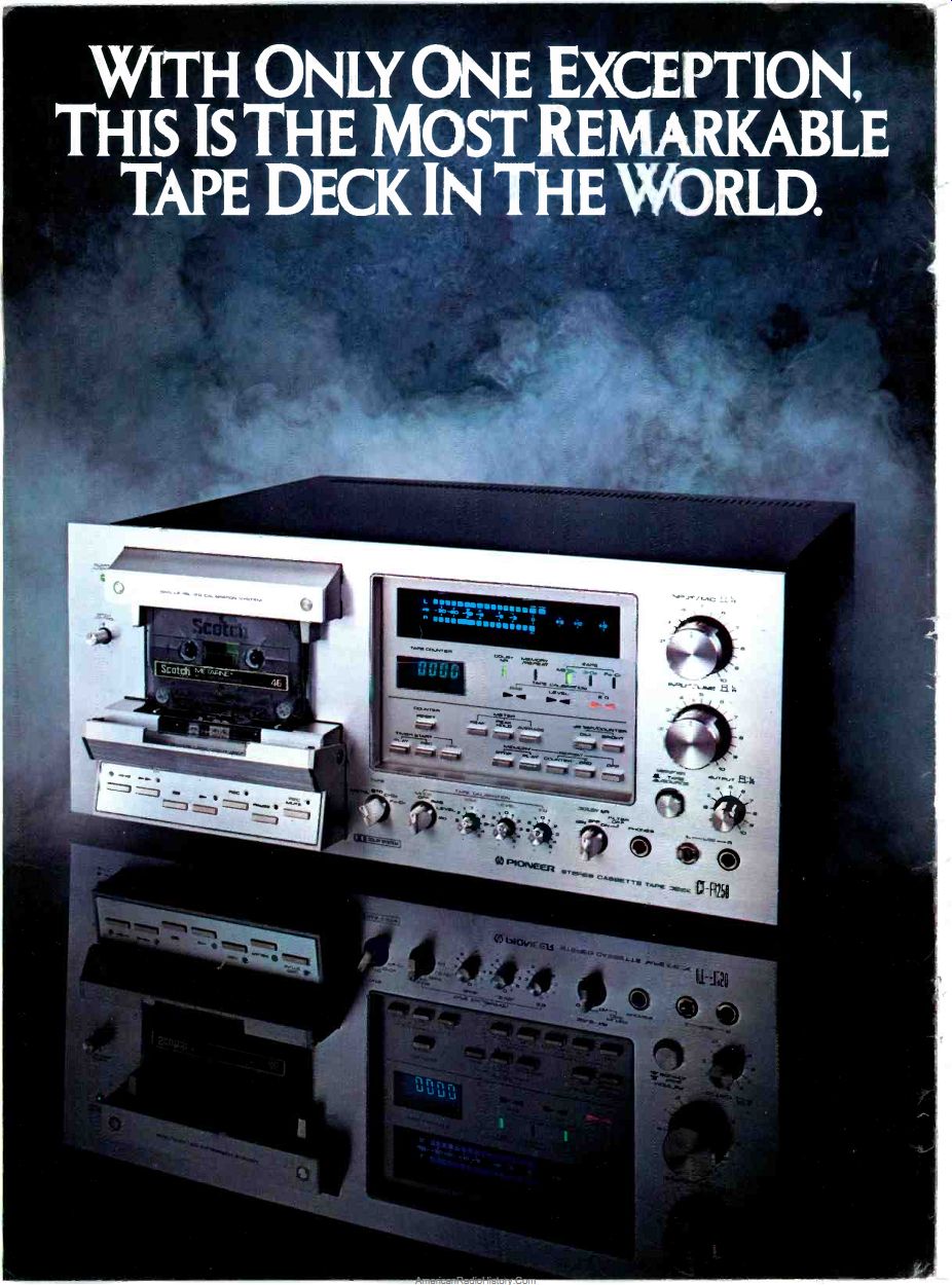 WITH ONLY ONE EXCEPTION. THIS IS THE MOST REMARKABLE TAPE DECK IN THE WORLD. But without exception it's the most remarkable cassette deck. Today, a thousand dollars or more is standard fare for a professional quality cassette deck. But when Pioneer designed the new CT-F1250, they not only raised the performance standards of high quality decks, they also lowered the standard price. Metal tape capability is something most new high quality cassette decks have in common. But while many of them have just been modified for this advancement, the Pioneer CT-F1250 has been specially designed for it. Instead of the two heads found in most metal capable tape decks, the CT-F1250 has three. And it's these three heads that keep us way ahead of the competition. Our new "small window" erase head makes a big difference in making sure all metal tapes are wiped completely clean. And our Uni-Crystal Ferrite recording and playback heads give you greater frequency response and better wear-resistance than the ordinary ferrite and Sendust alloy heads you'll find on most other tape decks. But you don't get distortion-free recordings just by using your heads. Instead of the single capstan tape transport system you'll find on some tape decks that are nearly twice the price, the CT-F1250 has a closed-loop dual capstan system, similar to that found in our remarkable RT-909 open-reel deck. This system keeps the tape in perfect contact with the heads at all times. So you are assured of getting everything that's on the tape. Nothing more; nothing less. What's more, the CT-F1250 has a Quartz Locked Direct Drive capstan motor that senses the slightest deviation in speed and automatically corrects it to keep wow and flutter down to an unbelieveable 0.03%. It's engineering innovations like these that make the CT-F1250 so remarkable. But equally remarkable are the features that make the CT-Fl 250 so easy to operate. Like our specially engineered Tape Calibration System that lets you quickly set bias level, Dolby adjustment, and record equalization for the best possible signal-to-noise ratio, the lowest distortion, and the pest high frequency response. And our 24 segment Fluroscan meter that works on Pioneer's own microprocessor to give you a more accurate reading of what you're listening to. It even has Peak, Peak Hold, and Average Buttons that let you record without fear of overload. In addition Pioneer's CT-Fl 250 has a digital brain with a memory that controls four different memory functions. Plus pitch control. Mic/line mixing. Independent left/right input/ output controls. And more. By now, it must be obvious that the CT-F1250 was designed to push up the limits of cassette deck performance. But only Pioneer would do it, without pushing up cassette deck prices. ----Metal tape capability for far greater dynamic range and far less distortion. ----Pioneer's 24-Segment Fluroscan Meter gives you an instantaneous picture of what you're listening to. ----Pioneer's easy-to-use Tape Calibration System guarantees optimum performance from every tape. WITH ONLY ONE EXCEPTION, THIS ISTHE MOST REMARKABLE TAPE DECK IN THE WORLD. But without exception it's the most remarkable reel-to-reel. Today, many audio manufacturers are putting a lot less into their tape decks and charging a lot more for them. But when Pioneer designed their new R1T-909 open-reel tape deck they made certain it had every conceivable feature an audiophile could expect. And one feature that was totally unexpected. A reasonable price. Even if you pay $1500 or more for a so called "professional" quality tape deck, you'll probably still be getting a conventional single capstan tape transport system that is prone to wow and flutter. Pioneer's RT-909 has a specially designed closed-loop dual capstan system that isolates the tape at the heads from any external interference. So you get constant tape-to-head contact. And constant, clear, accurate sound. And while many of the expensive new tape decks have old fashioned drive systems that drive up heat and distortion, the RT-909 doesn't. Instead, it has a far more accurate DC motor that generates its own frequency to correct any variations in tape speed. And keeps wow and flutter down to an unheard of 0.04% at 7 1/2 ips. What's more, the drive system of the RT-909 is unaffected by fluctuations in voltage. So a drop in voltage doesn't mean a drop in performance. The RT-909 also has a logic system that ensures smooth, accurate speed change. Most professional quality tape decks are designed for use outside the home. So the convenience features most audiophiles enjoy are nowhere to be found. The RT-909, on the other hand, offers automatic reverse, automatic repeat, and a timer controllable mechanism that lets you record a midnight concert even if you can't stay awake for it. Examine our heads and you'll see Pioneer engineers at their very best. Our playback heads, for example, have a new "contourless" design that makes them more sensitive. They increase frequency response upwards to 28,000 hertz, and extend it all the way down to 20 hertz. So you not only get greater range than any other tape deck, but also any other musical instrument. Of course, these features alone would make Pioneer's RT-909 quite a remarkable tape deck. But the RT-909 also has a Fluroscan, metering system that gives you an instantaneous picture of what you re listening to. A pitch control that lets you listen to music in perfect pitch even if it was far from perfectly recorded. Four different bias/equalization selections so you can use many tapes and get maximum performance from them all. Obviously these advancements are very impressive. But there's still one thing even more remarkable than the technology we feature. It's the price we feature.