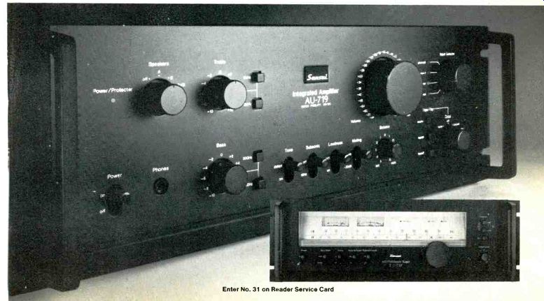 Toshiba has solved the problem of mistuning by eliminating the need for a center channel tuning meter. Instead, digital frequency synthesis uses a carefully selected quartz crystal to produce a stable reference frequency. In plain English, this system constantly corrects tuning errors. The result is the lowest possible distortion and absolutely no drift. Toshiba was the first to utilize this system in a receiver, and now we're using it again in our SA 850 receiver. Digital frequency synthesis not only makes us accurate, it also makes us more convenient. No unnecessary parts. We've eliminated the center channel tuning meter, FM/AM dial scale and tuning knob. So you can tune automatically or manually with the ease of pushbutton selection. You get LED digital readout and 5 LED signal strength indicators. You'll thank us for the memory and scan. Actually, you'll thank digital frequency synthesis. Because only with 1. Behind this digital readout is a conventional tuning system. It requires a center channel tuning meter and manual tuning. 2. Behind this digital readout is a quartz-locked tuning system. More accurate, but it still requires a center channel tuning meter. And it still requires manual tuning. 3. Behind this digital readout is the Toshiba quartz PLL digital frequency synthesized tuning system. A totally electronic system that's never subject to manual mistuning. Accurate to 0.0025%. this process can you store 6 FM and 6 AM stations for instant recall tuning at the touch of a memory button. And in the automatic FM mode, digital frequency synthesis allows the tuner to scan until it stops at the next listenable station. FM stereo S/N ratio is 68 dB. FM selectivity is a high 80 dB. Frequency response is 20 to 15,000 Hz + 0.2 0.8 dB. But there's more to this receiver than just a superb tuning system. Power you'll respect. We're talking about 50 watts rms per channel into 8 ohms from 20-20,000 Hz. This is provided by full complementary direct coupled power amplifiers. And couple that with an ultra-low THD of 0.03%. A preamp you'll appreciate. Along with provisions for attaching two tape decks, we give you full monitoring controls. Plus duplication switching between the decks. Our special subsonic filter switch helps eliminate low-frequency warp distortion. And our receiver looks as good as it sounds. With a sleek slide-away cover that conceals a full range of controls, including tone/defeat switch and a dual speaker selector. The Toshiba SA-850 digital frequency-synthesized receiver. The next time you're looking at receivers, don't believe every digital readout you read. Except ours. TOSHIBA Again, the first. Toshiba America Inc. 280 Park Ave., New York. NY 11710 --------------- Sansui is breaking up a very successful relationship. The TU-717 has a new mate: The AU-719. Sansui has just introduced an exciting new integrated amplifier, the AU-719. It represents the very latest developments in audio and electronics technology t is so good, in fact, that has replaced its rave-reviewed, best-selling predecessor as the partner of the TU-717 tuner. The-U-717's performance has been extravagantly praised by professional critics and knowledgeable consumers alike. With advanced features like switchable IF bandwidth and specs like 81dB signal-to-noise ratio and 0.06% THD, it's only natural. We expect the tuner's new mate to receive a tremendous reception and set industry amplifier standards for a long time to come. Here's why. INTRODUCING DD/DC What particularly distinguishes the new AU-719 amp is Sansui's patent-pending DD/DC (Diamond Differential/DC) circuitry that provides the extremely high drive current needed to reduce THD by adding large amounts of negative feedback without compromising slew rate or adding TIM. Slew rate refers to an amplifier's ability to respond to rapidly changing musical signals. The slew rate of the AU-719 is an astounding 170V/µ Sec. MAGNIFICENT MUSIC Many modern amplifiers have extremely low total harmonic distortion specs. And hat's important. But THD is measured with steady test signals and is not really representative of an amp's ability to deal with music. Sansui alone, with it's DD/DC technology, is, able to provide both low THD and lowest TIM simultaneously. Instead of the harsh metallic sound you sometimes get on a conventional amp when the musical signals are complex, with the AU-719 you hear only magnificent music.