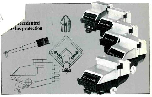 THD is less than 0.015% at full rated power of 90w/channel, min. RMS, both channels into 8 ohms from 10 20,000 Hz. Overall frequency response is awesome: DC 400,000 Hz, +0,-3dB. Hum and noise area super-silent-100dB on aux and-88dB on phono. The phono equalizer, which adheres to the standard RIAA curve within ±0.2áB from 20 20,000 Hz, also uses our unique DD/DC circuit for record reproduction that's second-to-none. CONTROL YOURSELF The unit is equipped with a full complement of versatile controls and connections to create the system and sound that's right for you, including two phono and two tape inputs, defeatable tone controls with switchable center frequencies, deck-to-deck tape dubbing and a very convenient 20 dB muting switch. Audition the new AU-719 and matching TU-717 at your authorized Sansui dealer. We think it will be the start of a very successful relationship. SANSUI ELECTRONICS CORP. Lyndhurst, New Jersey 07071 Gardena, Ca. 90247, USA. Sansui Electric Co., Ltd., Tokyo, Japan Sansui Audio Europe S.A., Antwerp, Belgium In Canada Electronic Distributors ------------------ FACT: five new Shure Cartridges feature the technological breakthroughs of the V15 Type IV Shure: the M97 Era IV Series phono cartridges Shure has written a new chapter in the history of affordable hi-fi by making the space-age technological breakthroughs of the incomparable V15 Type IV available in a complete line of high-performance, moderately-priced cartridges: the M97 Era IV Series Phono Cartridges, available with five different interchangeable stylus configurations to fit every system and every budget. The critically acclaimed V15 Type 'IV is the cartridge that astonished audiophiles with such vanguard features as the Dynamic Stabilizer-which simultaneously overcomes record-warp caused problems, provides electrostatic neutralization of the record surface, and effectively removes dust and lint from the record-and, the unique telescoped stylus assembly which results in lower effective stylus mass and dramatically improved trackability.