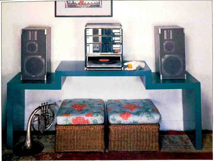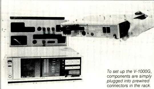 The initials in this system's name stand for "Synchro Performance Audio Network," a unique inter connection method which lets the V 1000G's components act together like a single unit. However, you must use only the components offered, with the possible exception of the turntable and the definite exception of the optional speakers. (In my tests, I did not use Aiwa's speakers and recommend using something larger and of higher quality for best sound.) Interconnection is extremely simple: With the glass rack accompanying the "G" system or the wood rack of the less expensive V-1000X, one just places the components in position and plugs them into prewired connectors in the rack's back plate. Additional cables are supplied for those who do not wish to use a rack. Even without the rack, however, the lengths of the cables supplied are such that you must stack the components as shown in the owner's manual, unless you buy longer cables with the appropriate DIN plugs (not all identical). Ordinarily, however, the Model LX-100, linear-tracking turntable goes on top; the Model MX-100 amplifier (which also acts as the system's control center) goes just below it. Below that will be the Model TX-100 frequency-synthesized tuner, resting atop the Model FX-100 Dolby B/C-equipped cassette deck. (All components have "footprints" slightly larger than a re cord jacket's, just under 13 inches on each side.) Even the various a.c. power cords must be hooked up a specific way in order for the interactive features of the system to work properly. Once all the connections are made, the only "spare" inputs available are a pair of "AUX" terminals. There is no provision for tape monitoring or the addition of any sort of signal processing equipment (dbx decoder, equalizer, etc.). Neither is there any circuit interruption point between the preamp-control section of the integrated amplifier and the power amplifier section. There are, of course, operating ad vantages to this arrangement. The amplifier's program source selectors for "Phono," "AUX," and "Tuner" are paralleled on the cassette deck, so you can select a source for taping without reaching back up to the amp. If you go into "Record" mode when the system is set for "Phono," the tape deck goes into "Record Pause" mode, automatically starting the tape when the tonearm comes to rest on the first groove of the spinning record. These neat tricks, and more, are all made possible by those extra wires inside the supplied interconnecting cables. The MX-100 integrated amplifier has an accurate LED power-output indicator referenced to 8-ohm loads. Next to it is a corresponding volume-level indicator which is necessary because volume levels are altered by means of up/ down keypads rather than a rotary level control. Several other indicators in form the user about amplifier status, including a "Tone" indicator, since the bass and treble controls of this unit can be bypassed if desired. A DSL ("Dynamic Super Loudness") switch boosts bass below 100 Hz for rooms or speakers requiring it, but boost diminishes as the level control is advanced for speaker protection. The amplifier is equipped with a microphone input jack and an associated volume control, for mixing live mike sounds with other pro grain sources when listening or re cording. There is also a jack for a re mote control, as yet unavailable. The MX-100 delivered a full 60 watts per channel for its rated distortion, even at the audio frequency extremes of 20 Hz and 20 kHz. Aside from its excellent frequency synthesized tuning circuitry, the TX 100 tuner features a real-time digital clock display and timer which can be programmed to turn on the tuner and thereby the entire system. It is the tuner's line cord that is connected to a wall socket, with all other line cords connected to its convenience outlets or to convenience outlets on the amplifier. Power will switch off automatically, about 64 minutes after a timed start, or after a front-panel sleep-timer button is pressed. As for its operation as a tuner, sensitivity was just average (an out door antenna is recommended), but distortion was surprisingly low and stereo FM separation was excellent. There are memory presets for six FM and six AM stations. ============ ONE-BRAND SYSTEM RATINGS ![]() General Comments Power Amplifier: Sound quality very good, power output conservatively rated. Phono equalization slightly off in bass region. Good switching arrangement between components. Turntable & Cartridge: Properly matched to each other, but cartridge response further accentuates extra bass boost. If replacing, choose a high-output moving-magnet cartridge. Tuner: Well designed and easy to use, with special features not normally found on separate tuner components. Cassette Deck' Exhibited excellent frequency response and good Dolby C tracking. Excellent interface with the amplifier and with the rest of the system. Overall Comment: While this system makes good use of the fact that it is sold as a complete music system, it also sacrifices some features that are found in separate components, such as a tape monitor loop. On the whole, however, Aiwa manages to cram a great deal of audio performance into a very small space at a very attractive price. A fine system for small apartments, second homes, and the like. Overall Rating: ============ Perhaps the most outstanding component of this system is the turntable, Model LX-100. Its tangential-tracking tonearm is equipped with an Ortofon VMS-type cartridge of extremely low mass. Thanks to the front-loading system (records are slipped in from the front, after a "Load" button causes a drawer-like ejection of the entire turntable tray mechanism), no clearance for lifting the dust cover is needed. Such operations as lowering or raising the tonearm are controlled from the front panel. Record size is automatically detected by the tonearm. My only criticism of the system had to do with a slight rise in the cartridge's bass response which, combin