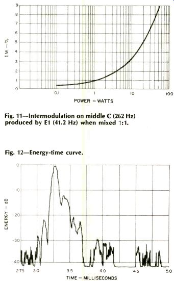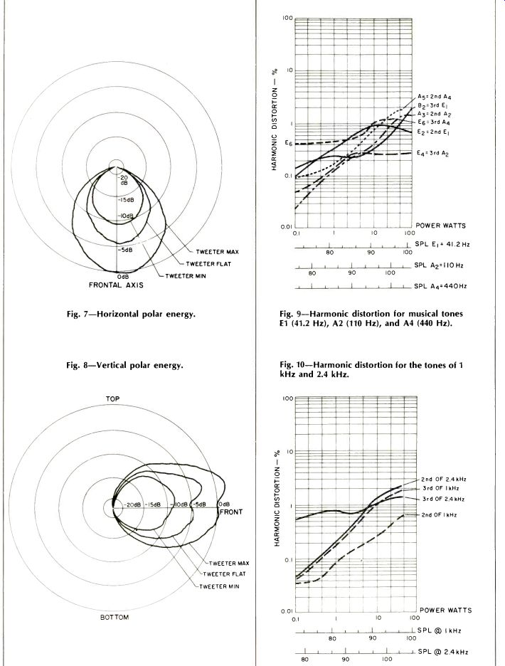 Fig. 4-Anechoic response, one-meter axial phase Fig. 5-Three-meter room test, tweeter set flat. Fig. 6-Three-meter room test, tweeter set to maximum. Speaker connection is made to well-marked terminals placed in a recessed cavity on the rear of the enclosure. Also mounted in this cavity is a system fuse holder for overload protection and a tweeter balance L-pad. A red dot is placed on the tweeter control place to indicate the position for flattest response, each speaker being individually calibrated. Plastic angle brackets hold the upper grille in place and serve as edge trim on the upper front and sides. These brackets are cut off flat, leaving edges at the corners. In typical Laurel and Hardy fashion, I cut myself on one of the brackets when I grasped the enclosure to move it. My lack of grace notwithstanding, I hope that Duntech will smooth or remove these edges on subsequent units. Duntech supplies a very thorough and readable instruction manual with each speaker. This covers both technical details and helpful suggestions on room placement for best sound. The DL-15 loudspeaker system carries a five-year, transferrable, full warranty against manufacturing defects. Technical Measurements The measured magnitude of loudspeaker impedance is shown in Fig. 1, and the corresponding complex plot is given in Fig. 2. The rear-mounted tweeter control was left in the factory preset flat position for both of these measurements. Impedance variations are quite small and remain predominately resistive for frequencies above the characteristic bass resonance peak. This speaker should present no load problems to any quality power amplifier. The one-meter axial anechoic frequency response at one watt average drive is shown in Fig. 3 for the amplitude of the sound pressure and in Fig. 4 for the phase. The tweeter control was set to the indicated flat position for these measurements. Bass response extends down to around 45 Hz, then rolls off smoothly. The unusual dip in response at 5 kHz, and its attendant phase change, warrants some discussion, particularly in view of the fact that Duntech measures the frequency response of each unit prior to shipment. Duntech's claim for their low frequency response is based on using a two-boundary measuring condition (wall and floor), which they believe more nearly approximates normal home listening conditions. Audio measures the response directly on the geometric center line of the speakers, with no "preferred" positions, and everybody gets the same treatment. It just happens that this is about the worst position for the Duntech. Moving the microphone a bit up to be aligned with the tweeter or down to be in front of the woofer substantially smooths the measured response, but the response shown in Figs. 3 and 4 is what the center-line measurement yields. The acoustic transition between midrange and tweeter accounts for the dip in response at 4 to 5 kHz and nearly 360 degree shift in phase. The phase measurement was made with a time delay offset corresponding to the air path delay from midrange driver to microphone. The phase shift below 600 Hz is due to the woofer, which has an acoustic position behind the midrange driver and hence a longer time delay. With the exception of the phase changes around 600 Hz and 5 kHz, the Duntech DL-15 is principally minimum phase. Figure 5 shows the measured three-meter room response. The DL-15 was placed on a carpeted floor and against a wall, as recommended by Duntech. A microphone position three meters from the front of the enclosure and one meter above the floor is used to simulate a normal listening position. The tweeter control was set to its indicated flat position. Two measurements are shown, one directly in front of the enclosure and the other angled 30 degrees for the Duntech in a normal left-channel stereo position; the plots are displaced 10 dB for clarity. The response is quite smooth throughout the frequency range but begins to drop above 7 kHz, though it extends smoothly to 18 kHz. (Editor's note: This high end drop, says Duntech, with distance was intentional. It is based on their contention that the same drop is evident with most musical instruments and the human voice due to a reduction in angular dispersion at frequencies higher than about 4 or 5 kHz.) In order to check the top end drop, the measurement was rerun with the tweeter control in its maximum position, with the results shown in Fig. 6. It appears that the tweeter control should be left in its flat position as a 6-kHz peak occurs when the control is placed in its maximum position. If you want to pull the top end up for a more uniform direct source sound, an equalizer should be used which pre emphasizes the frequencies above 5 kHz. An octave band equalizer may do it, but a normal pre-amplifier tone control will not and should be left in the flat position. The polar energy response is shown in Fig. 7 for horizontal dispersion and in Fig. 8 for vertical dispersion. This is a measurement of the total sound energy density for all frequencies equally weighted from 20 Hz to 20 kHz. The three curves are for the rear-mounted tweeter control in its minimum, flat, and maximum position. ![]() Fig. 7-Horizontal polar energy. Fig. 8-Vertical polar energy. Fig. 9-Harmonic distortion for musical tones E1 (41.2 Hz), A2 (110 Hz), and A4 (440 Hz). Fig. 10-Harmonic distortion for the tones of 1 kHz and 2.4 kHz. The horizontal polar pattern is quite symmetric with almost no left or right dominance of sound. The vertical polar pattern, particularly in the flat position, shows a mild upward dominance of launch angle for sound with a minor notch on axis. This verifies the axial frequency response measurement difficulty we encountered in the anechoic test. The room tests, shown in Figs. 5 and 6, have a microphone position above the enclosure's geometric axis and thus are made in the major vertical lobe of Fig. 8. This is why the 5-kHz notch did not show for an average room listening p