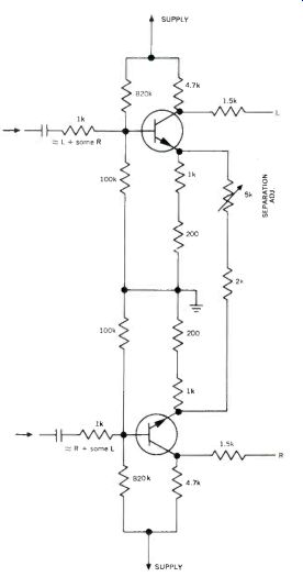 Only careful initial design can take care of these phase-response differences between channels and between main- and sub-channel components, so that a separation figure of 40 dB at all frequencies is rarely achieved in a practical design. A separation of 40 dB at mid -frequencies, however, is realizeable and has been noted for several of the better stereo receivers and tuners currently available. Interestingly, the FCC requires only approximately 30 dB of separation at all frequencies in the transmission process and most popular phono cartridges don't even do that well on stereo discs (though stereo tapes can do a lot better). Following the separation adjustment, the two signals are fed through a pair of emitter followers to provide a low source impedance for the low pass filters which follow. These filters remove any residual 19 kHz, 38 kHz, 57 kHz,. and 76 kHz (the latter two being harmonics of the first two) which might still be present. One or more of these frequencies, though inaudible by themselves, might beat with the local bias oscillators of tape recorders you might use to record "off the -air" stereo FM, creating unexpected whistles and squeals in your valued recordings. Accordingly, the designers of this circuit have added extra filtering to remove the last vestiges of these unwanted frequencies. Finally, the signals are passed through a pair of conventional voltage amplifier stages, very likely to raise the signal level to match other signal inputs to this particular receiver. -------------- (Audio magazine, 11/1969) Also see: How Disc Masters Are Made Today = = = = |