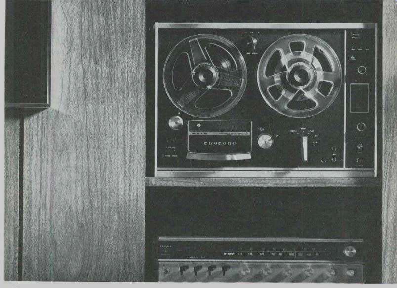 NEITHER AIR CONDITIONERS, TV SETS, WASHERS NOR ANY OTHER ELECTRICAL APPLIANCE CAN KEEP THE HYSTERESIS-DRIVE CONCORD MARK II FROM ITS PRECISELY APPOINTED SPEED. Voltage supply in your city can vary as much as 10%. And even a 2% variation causes a significant tape speed change in tape decks with induction motors and a difference in reproduced sound that is intolerable. The Concord Mark II stereo tape deck completely ignores fluctuations in line voltage. It is driven by a hysteresis synchronous motor which locks onto the 60 cycle power line frequency and maintains constant speed (within 0.5%) regardless of voltage variation from 75 to 130 volts. So if you're about to buy a tape deck that doesn't have a hysteresis synchronous drive motor, you're liable to negate any other fine feature it might have. Don't get the idea the hysteresis motor is all the Concord Mark II has to offer. It also has just about every other professional feature. Three high-quality heads: ferrite erase head; wide gap Hi-Mu laminated recording head for optimum recorded signal and signal-to-noise ratio, narrow gap Hi-Mu laminated playback head for optimum reproduced frequency response. No compromise combination heads. The three heads and four preamplifiers also make possible tape monitoring while recording. The tape transport mechanism assures a fast startup-you don't miss a note. Supply and takeup tape tension arms eliminate startup burble. A special flutter filter eliminates flutter due to tape scrape or cogging action. A cue control provides instantaneous stop and start operation. Other important conveniences: the flip-up head cover permits you to see the head gap position markings for professional editing; 3 speeds; automatic sound-on-sound with adjustable level controls; variable echo control for reverb recording; calibrated VU meters with individual record indicator lights; stereo headphone jack; electronically controlled dynamic muting for automatic suppression of tape hiss without affecting high frequency response. All this, for under $230. The hysteresis drive Concord Mark III has all of the features of the Mark II plus pressure-sintered ferrite heads for extended frequency response and virtually no head wear. It sells for under $260. The hysteresis drive Mark IV, the top-of-the-line Concord deck offers all of the performance and conveniences of the Mark II and III including wide gap record, narrow gap playback heads, tape source monitoring, sound-on-sound, echo recording. Plus, a dual capstan tape transport mechanism with electronic automatic reverse, no metal foil or signal required on the tape. Superior recording performance plus the convenience of automatic reverse and continuous play. A superb instrument with the finest performance money can buy, and it's under $330. Audition the new Concord Mark series, the tape decks with the hysteresis synchronous drive motor. For "all the facts" brochure, write: Concord Electronics Corp., 1935 Arma-cost Ave., Los Angeles, Calif.90025. (Subsidiary, Ehrenreich Photo-Optical Industries, Inc.) For copy of Concord Mark III Instruction book, mail. -------- (Audio magazine, 11/1969) Also see: Astrocom/Marlux Model 407 tape deck = = = = |