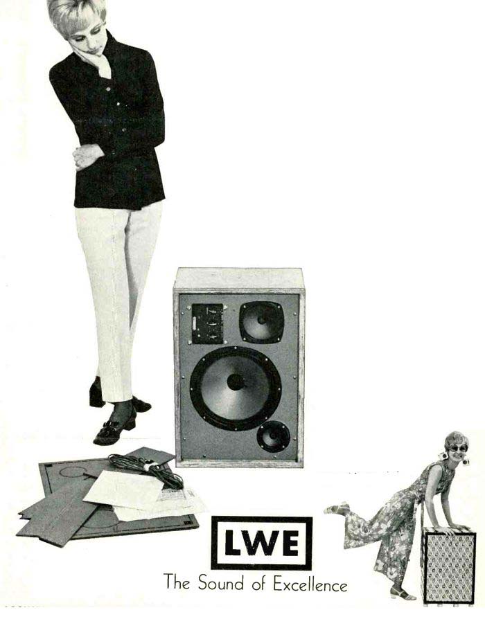 ![]() Electronic Suspension makes LWE the most technically advanced speaker in history of sound reproduction. What is Electronic Suspension? LWE researchers have taken the principle of inverse (negative) feedback used so effectively in amplifiers-and adapted it to use in LWE speakers. This revolutionary breakthrough in technology has been recognized by issuance of U.S. Patent No. 3,449,518, dated June 10, 1969. LWE Electronic Suspension speakers can be used with any good amplifier (min. 20 dB of feedback). The above circuit illustration shows how feedback voltage is derived when the LWE is connected to amplifier. A voltage is developed and fed back to the same point in the amplifier that the negative voltage feedback enters. How does Electronic Suspension work? LWE speakers utilize an electronic network to generate their own error voltages when the speaker does not follow the amplifier out-put. Inverse feedback is utilized to control the speaker cone electronically at all times, rather than allowing a resonant mechanical or acoustic mass-spring system to discolor response at low frequencies. Such "discoloration" occurs in most conventional designs such as folded horn, acoustic suspension, tuned port, drone cone, and bass reflex speakers. How does Electronic Suspension improve speaker reproduction? Provides the best transient response ever achieved in a Hi-Fi speaker. Eliminates speaker resonance and its bad effects (resonant peaks, boomy bass and muffled percussion). Extends low frequency response, ranging from 20-20,000 Hz in the LWE II to 29-15,000 Hz in the LWE VI. Makes possible Room Gain Control to compensate for room acoustics and size. Delivers infinitely better musical instrument definition and clarity. Reduces distortion almost completely ... especially at high volume levels. Increases speaker efficiency 5-10% over passive means of speaker equalization Allows freedom in speaker placement due to compact size (fits on floor or shelf-horizontal or vertical positioning). Adapts to any good quality amplifier or receiver, solid state or vacuum tube. (min. 20dB) *Flat response range. ![]() There are only two good things about an LWE "Instant Kit" --- sound and price. You might call it our starving artists model. For people who appreciate the art of music, but feel they can't afford the full price of a wood-finished LWE speaker. Here's how it works. Instead of buying LWE in a hand-crafted, oil walnut cabinet with grille, you buy LWE in an unfinished, 3/4-in. plywood and novaply housing without grille. You get the same unsurpassed sound reproduction of LWE with Electronic Suspension. But you get it at a savings up to 30%. Sound good? You bet! And with a little creative painting or staining or veneering on your part, you could turn our ugly duckling into your own thing. Ask your dealer about LWE's money-saving "INSTANT KITS." It's simply a great buy. Kit sizes: LWE land III, 17"x25"x12" LWE II, 23 1/2"x33 1"x16" LWE VI, 10" x 20" x 8 1/2". LWE. The Sound of Excellence. ACOUSTRON CORPORATION / 2418 Bartlett Street, Houston, Texas, 77006 / Phone: (713) 524-7407 -------- (Audio magazine, 11/1969) Also see: Wharfedale Variflex Model W80 speakers = = = = |