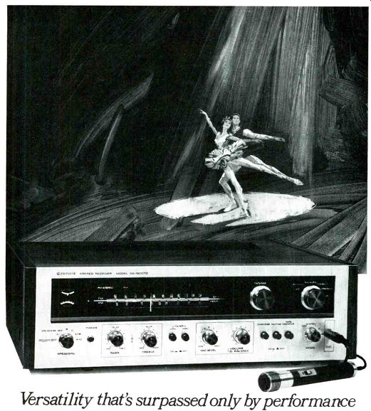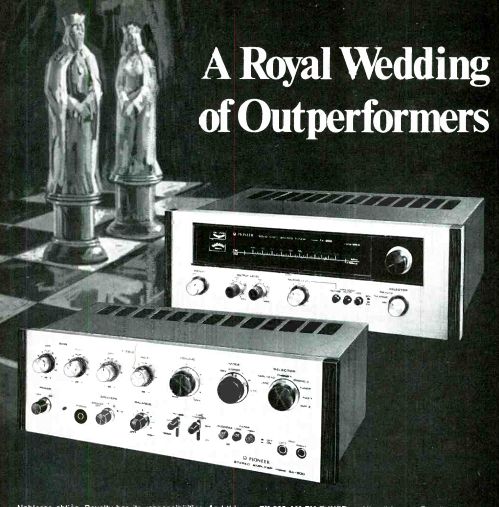 SA-900 PRE- /MAIN AMPLIFIER Its IHF music power rating of 200 watts (at 4 ohms) is just part of its magnificence. The solid state preamplifier is designed to give exceptionally low noise level ... better frequency response ... decreased distortion ... improved tonal quality. Unlike otter units at this price, it offers stepped tone controls for the finest precision adjustments. The pre and main amplifiers can be used independently. Maximum flexibility with inputs for 2 phono, tape monitor, microphone: outputs for two sets of speakers. $259.95. TX-900 AM-FM TUNER All solid state. Excellent selectivity and sensitivity from three FET's and two RF amplifier stages in the front end plus two crystal filters and four IC's in the IF section. Interchannel noise is completely muted. A variable muting switch accommodates weak signals while suppressing noise at any level. Tuning is precise. A bright spot indicator as well as twin meters tune for maximum signal strength ... minimum distortion ... optimum fidelity and channel separation ... best signal to noise ratio. $239.95. The designer-styled cabinets for both units are faced with brushed silver /gold tone highlights, with end pieces in luxurious Brazilian rosewood. Hear the majestic sound of royalty at your local Pioneer dealer. A new criterion of excellence in sound has arrived. The Pioneer SX-1500TD AM/FM multiplex stereo receiver was meticulously designed for the audio perfectionist. Its advanced design circuitry, incorporating an FET front end and IC's IF strip, offers an array of features for the ultimate in stereo performance. Music power is at a zenith of 180 watts, rated in compliance with the standards of the Institute of High Fidelity. Extremely versatile, it provides six sets of inputs. The pre and main amplifiers may be used independently. An exclusive highlight is the unique facility for Dynamic Microphone Mixing which provides simultaneous recording with broadcast music ...voice over music announcements ...5-position speaker selection for announcements over speakers in several locations. You can connect up to three different speaker systems.. Complementing its magnificent sound reproduction is the subdued elegance of the hard rubbed, oiled walnut cabinet faced with brushed silver and jet. Hear the true sound of quality at your Pioneer dealer. Only $399.95, including microphone. PIONEER ELECTRONICS U.S.A. CORPORATION, 140 Smith Street, Farmingdale, N. Y. 11735 (516) 694-7720. West Coast: 1335 W. 134th Street, Gardena, Calif. 90249--(213) 323-2374 & 321-1076. In Canada: S. H. Parker Co., Prov. of Ontario -------- (Audio magazine, 11/1969) Also see: ACOUSTRON Corp. (LWE) speakers = = = = |