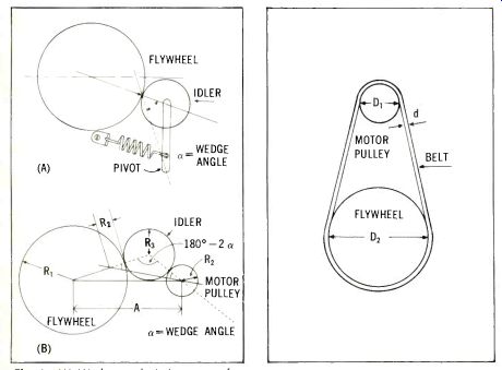 by H. W. HELLYER DESIGN PHILOSOPHY dictates which sort of tape drive shall be used-direct motor, belt, or idler. Each has certain advantages and some drawbacks. For speed exactitude, and precise control, directly driven capstan and reel carriers will be chosen; the obvious drawback is its high cost. The choice between belts and idlers is not so simple. Quite often we find the maker has compromised, using both types of drive in the same machine, performing different functions. Belts, or bands, may be rubber, composition or fabricised rubber, and can be round, triangular, or rectangular in cross-section. The most important criterion is evenness of cross-section, with elasticity following a close second. Round-section belts will more often be used with a large-diameter motor pulley. It is more difficult to maintain constant diameter of a round belt, and under tension the belt `flattens' at contact points, so angle-section belts are used with smaller-diameter motor pulleys having shaped flanges in which the belt rides snugly. The other alternative is a flat belt on a wide running surface, and fabricised flat belts which accept variations of tension for function change (play/fast wind/reverse) are favored by some designers. Where flat belts are used, the general tendency is to employ a slipping-belt drive for take-up rather than a slipping-clutch or gravity take-up, and vertically mounted machines may therefore have tensioned flat belts. Idlers, jockey pulleys, puck wheels, or intermediate wheels, called variously (though not strictly correctly) by all these names, are used to couple the drive from the motor to the flywheel and to the reel carriers. Many different systems are employed, each with its own peculiarity. Most idlers are rubber-tired, and the type of rubber used has to be chosen carefully. As well as having good elastic properties, it must have a good coefficient of friction, the minimum of self-heating, and high abrasion resistance-properties which do not always go hand-in-hand. Because maximum tension must be achieved to reduce slip, pressure on the idler will be high. This tends to stress bearings, and makes the initial contact of idler and drive (or driven) surface vulnerable to irregular forces. For optimum transmission of drive power, systems are designed to be self-adjusting, the idler being held in contact with the driving surface by spring pressure. Idler wheels lend themselves to designs which need reversal of driving direction, such as for the rewind operation, and to speed changes which can be effected by a stepped driving pulley. They are useful when the spacing between drive wheel and driven surface has to be varied, or is large. Because the friction wheel is spring-loaded to make contact, some retardation is inevitable, and this has to be allowed for in design. The wedge angle for optimum conditions has been determined empirically to lie between 35 and 40 deg. for optimum drive with least slip. Figure 1 (A) shows a simple spring-loaded drive wheel, and in Figure 1 (B) we can see the design principles for an intermediate wheel. The wedge angle of 35 deg. is determined by experience, and wheel diameters should have specific relationships. The diameter of an idler wheel should, in theory, make no difference to the speed of the driven surface.