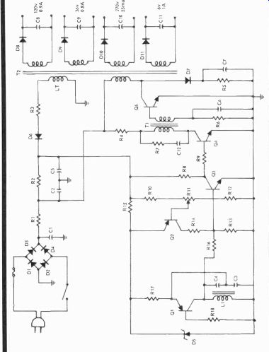 Thereafter, driver Q4 supplies energy for the primary of T1, which is flux coupled to the base of switch transistor Q5, the primary switching source for T2. Components R5, D7, and C7, a voltage clamp for Q5, absorb the higher than normal voltage spikes. Diodes D8 through D11 supply the complete current and operating voltage outputs as shown on the schematic ; 120 volts at 900 milliamperes, 36 volts at 800 milliamperes, 270 volts at 25 milliamperes and 6 volts at 1 ampere. The entire circuit operates at 20 kHz with small T1 and T2 transformers; the first is a laminated steel core type and the second has a ferrite core. QUESTIONS 1. What is a "cold" chassis, and why do the less expensive receivers have one side of the chassis connected to the AC line? 2. How does C1 in Fig. 11-1B charge on the negative current alternation? 3. A sine-wave peak-to-peak voltage of 340 volts equals what value at RMS? 4. Why are so many 4-bridge diodes used in modern power supplies? 5. What happens when a degaussing thermistor gets hot? 6. When a capacitor in a low-voltage supply opens, what problems occur? 7. Why do you always use an ohmmeter to measure coils and capacitance? 8. The collector current is the sum of the and currents? 9. Show that transconductance equations for FETs and tubes are somewhat similar. 10. Why do you suppose Zenith added a diode-transistor limit switch in the power supply? 11. How does Zenith take care of its solid-state pincushion problem? 12. RCA differs in its power supply philosophy from other set manufacturers. How? 13. Is Motorola's new power supply DC or AC governed in it's regulation function? 14. How do the Delco and Motorola regulators basically differ? Next: Chroma Circuits Also see: TV Antennas and Transmission lines Air Time--An Intro to Television Broadcasting TV and Radio Tube Troubles (1958)