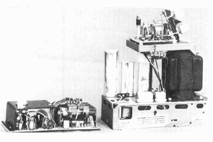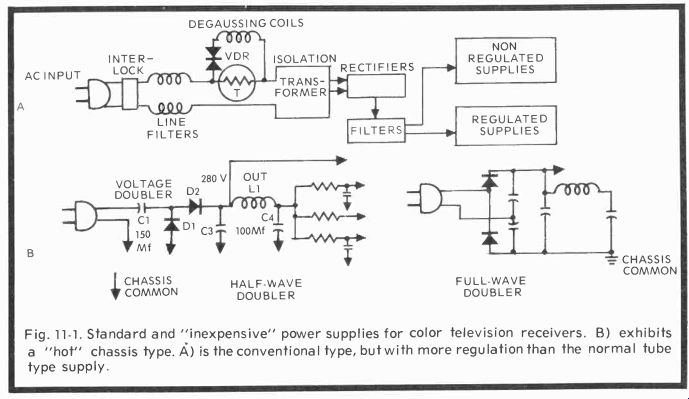 Low-voltage power supplies used to be, in the days of simple vacuum tubes, just a matter of whether you had a "hot" or "cold" chassis and, perhaps, whether rectifiers were either half-wave or full-wave. In the less expensive receivers, this outlook hasn't changed much, because of the lower cost involved. But in the better color sets, there's now a considerable choice with many, many engineering advances in the past two years and, apparently, considerably more to come. For in stance, the industry is talking right now about switched power supplies for everything but the collector voltage of the horizontal oscillator, and this could be the only directly rectified feed. All other voltages could come from power circuits that would be driven, probably, by the horizontal oscillator, or higher or lower frequencies thereof. A big advantage would be better short circuit protection, which is very important with semiconductors. Others include much less filtering at the higher frequencies, a completely modularized power supply, less costly low-voltage transformers, and reduced ripple on the bus feeders, to name a few. Motorola, in fact, is already doing just this, and has additional ideas in the engineering think tank for the future. RCA, also has a partially plug-in power supply, with regulators among the modules, and the removal of modules in certain Zenith receivers will disable DC immediately. Romancing power supplies has been a pretty dull job until recently, but the already tremendous setup and competition in consumer products will certainly result in many unique and useful innovations now and in the years ahead. And it may just come to pass that the active filter principle, used in the past several years by Sylvania, may be well worth adding to the very advantageous oscillator switching method of developing power. POWER SUPPLY BLOCK DIAGRAM The block diagram in Fig. 11-1A is typical of the power supply found in better receivers. AC passes through the line cord into the receiver interlock and coil line filters, then through the voltage-dependent resistor that, when cold, exhibits little resistance. In a second or two, the screen area is degaussed, but no substantial AC reaches the isolating stepup or stepdown transformer. In a moment, however, the thermistor gets hot, decreases quickly in resistance, and current passes directly to the transformer primary while the VDR blocks all AC from the degaussing coils. The transformer secondary supplies the rectifiers, which usually pass the positive alternations and block the negative ones. The resulting DC ripple is now filtered by chokes, resistors, and capacitors and passed, non-regulated, to circuits like the audio output, CRT, etc. The more critical portions of the receiver, such as transistorized IFs, video amplifiers, and the chroma circuits-especially if these are semiconductors-receive regulated supply voltages. In the less expensive version in Fig. 11-1B, we didn't bother to put in a degaussing coil, since it would be the same principle, but we do show a half-wave voltage doubler, with one side of the AC line connected directly to receiver chassis. This is the "touchier" type power supply where-if the AC plug has the right (or the wrong!) polarity and you have your hand on ground or a cold water pipe-you could become an instant angel with no difficulty. ALWAYS use an isolation transformer when you're working with one of these, not only to protect yourself but your test equipment, too. Well-regulated changes of 20 or 30 amperes and 115 to 120-volts (some 2300 to 3600 volt-amperes) play few favorites. Most unfortunates never live to recognize their mistake. In case you meet this voltage doubler in your work, here's how it works: On the negative alternation, C1 charges through D1 to 150 volts. On the positive alternation, C1 discharges through D2, charging C3 and C4 by way of L1 (for C4). The 120-volt input, naturally, is doubled through a 150-mfd capacitor, and comes to D2 at about 300 volts. Then there's a 20- to 40-volt drop because of rectification loads, and dividers. The capacitors are low impedances to AC ripple, while the choke is a low-impedance to DC and a high impedance to AC. The ripple frequency, in this instance, is 60 Hz, always a tough one to filter, while ripple in the supply diagrammed in Fig. 11-1A is 120 Hz, since you'd have full-wave or bridge rectification. The faster the frequency the less and more uniform the ripple and the easier it is to smooth out by filters, where component values decrease somewhat in proportion to frequency. Remember; C = ½ pi fXc