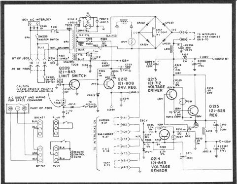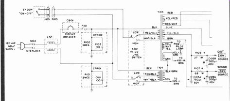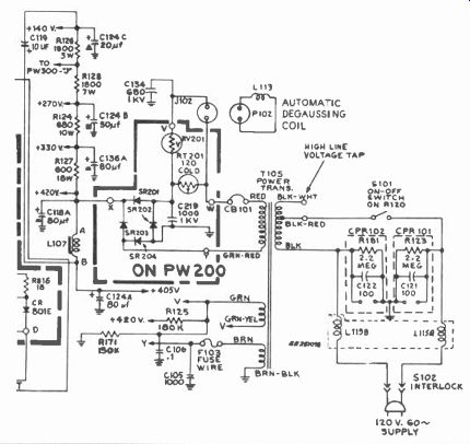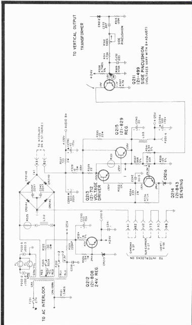 Since the reference diode has a fixed voltage (in one case, 140 volts and in the other 24-volts), any change in voltage will result in a change of current through Q214, reducing or raising the bias on Q213, and so regulating the output of Q215. Below the AC protection varistor, you will see an arrow to the horizontal output transformer and you will also observe the side pincushion amplifier bus coming into the circuit between R337 and R338. What happens here is that the vertical 60-Hz parabola actually modulates the B+ to the horizontal output transformer and expands the B+ with vertical scan to change the picture width to compensate for pincushion distortion by pushing out the sides of the picture through its middle at a 60-Hz rate. Filtering for the resulting 60-Hz induced ripple is taken care of by R327, C239C, and L213, and C239A and B. RCA'S CTC46 SUPPLY The generally sophisticated circuit in Fig. 11-5 has the usual interference reject coils, circuit-breaker and LC filters, high-low line switch, and isolation line transformer with five voltage sources that are all rather carefully filtered and rectified. The individual video and chroma plug-in modules have their separate or collective regulators, instead of single source regulation from the power supply. Both diode bridges work as all bridges do, and there is a thermistor at terminals 4 and 5 to block and shunt current when cold and hot, respectively. After degaussing has been completed, the half-wave CR1 is allowed full current and the 225-volt source comes on to provide drive for the set. A centertap off the 77-volt supply produces the 26- and 30-volt sources for the sound and other circuits.