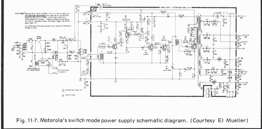 One of the handy features of this supply, however, is the plug board (part of PW600) that contains all rectifiers and the large thermistor for the degaussing coil. If you suspect any of these elements being faulty, simply pull the MAB module, substitute another, and find out. MOTOROLA'S SWITCHING POWER SUPPLY FOR CTV7-8 CHASSIS Like the "offshore" beginning of Instamatic, Accu-Matic, or by whatever name present chroma and other controls have become known, this general power supply had some foreign origins, too, but its U.S. introduction is very likely the beginning of an era of all sorts of switching power supplies. Why? Because of utility, less expense, lighter power trans formers, stepdown instead of stepup voltages, and the other advantages named earlier in this section. To this Motorola power supply they all apply. And, since a picture can sometimes tell more than 1,000 words, look at the difference in Fig. 11-6 between Motorola's new and original all-AC regulated Quasar power supplies in terms of filtering, size of components such as capacitors, the power transformer, huge dropping resistors on top the regulator subchassis. In addition, almost the complete supply is made of plug-in modules and can be removed by simply unplugging panel JA in any of the Quasar CTV7 and CTV8 solid-state receivers. The schematic for the switch mode supply is shown in Fig. 11-7. As you can see, except for full-wave rectifier diodes, filament transformer, several other coils, and the degaussing units, most of the circuitry fits snugly on plug panel JA. The input voltage doubler is made up of D800, D801, and capacitors C800 and C801, collectively, that are attached to one side of the AC line. C800 also goes to isolated ground. Rectified AC charges C800A, C801 alternately plus the other capacitors, and D800 passes a total WVDC about 300 volts that, because of drops and loads, becomes 280 usable volts. This filtered DC is now brought over the top of panel JA, in through terminal 10, to the primary of low-voltage transformer T3. (In block diagram form, this DC connection and the ensuing circuit description is shown in Fig. 11-8. You may follow both the schematic and block outline together.) DC energizes the primary of the transformer through the action of output switch Q8 to isolated ground. This switch is driven through a series of three other transistors plus a regulator, and all are protected by a silicon controlled rectifier (SCR) crowbar microsecond shut off.