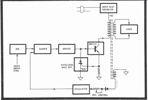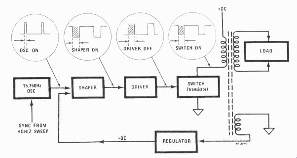 A 200-volt sync pulse from the 15,734 Hz horizontal output appears across the primary of T2, a blocking oscillator, connected between collector and base of Q5. Thus, the oscillator is synchronized with the receiver's horizontal oscillator and its output is shaped as a rectangular wave to control the driver and, finally, the output switching transistor. The action is further shown in Fig. 11-9, along with the various waveforms that may be expected. These waveforms are, of course, exhibited for normal conditions only when regulation is unnecessary. But when, say, brightness is increased and the secondary of the transformer needs more power, the Q8 DC switch is closed for a longer time period and primary current increases, thereby satisfying the secondary demand. The switching transistor is controlled as follows: Regulator Q4 takes samples of the driven oscillator voltage from a separate winding (pins 3 and 12) on T3, which is routed back to the base of the regulator through diode D15. At the same time, positive DC from the 33-volt bus, regulated by zener D4, and filtered by 50-mfd C18, is the reference DC for the base and emitter of Q4. Another reference is series RC circuit C24 and R35, which is connected between the Q4 base and the 280-volt line, establishing a positive-to-negative charge on the capacitor that can vary with DC voltage changes. Further RC time constants C12, R30, R16, etc., help shape this feedback voltage in the Q4 base-emitter circuit. Any changes in the DC supply will produce an RC change at the base of Q4, resulting in a steepening or lengthening of the sawtooth at the emitter of the regulator, changing the width of the oscillator output waveform and so shaping the final drive pulse to the output switching transistor. Under extra load conditions, the output switch is kept on longer, therefore, supplying more current to both the primary and secondary of the transformer so that the response promptly fulfills further current drain requirements. Conversely, less supply needs cause the regulator to conduct for shorter periods and so narrows the rectangular drive waveforms for the output switch, keeping it on for a shorter period and so reducing current in the supply. Pretty much the same situation occurs if the line voltage increases or decreases, and so the supply is regulated both from within and without, and any internal supply transients on the various buses will appear stationary at a 63.5-microsecond time rate. Should the voltage through the output switch reach a level that causes D3 to zener and pass a signal, this will turn on SCR Q1 and the entire supply will shut down until the receiver is turned off (or the circuitbreaker blows) and the anode of the SCR has the voltage removed entirely. Gate voltage turn on will never turn off an SCR, only the removal of its anode potential. DELCO'S FLYBACK SWITCHING REGULATOR To show that other companies besides Motorola are already actively thinking about a switched power supply, consider the following material, developed by W.A. Robinson of Delco Electronics. Instead of a blocking oscillator, however, a self-generated Colpitts (two capacitors) oscillator (Q1) is used to produce a sine wave. The Q1 and Q2 emitters and the collector of Q3 are regulated by zener diode D5. Feedback modulation voltage comes from winding "LT" directly into the emitter of Q2. The feedback voltage and the sine wave are mixed between R13 and R14. This feedback is proportional to the DC output voltage. There is also a feedback effect through R2 in terms of supply voltage, and R2 is also the starting drop resistor for the Colpitts oscillator. Voltage adjustment R11 is located between R10 and R12. R13 actually determines the maximum pulse width, which goes to Q3 (a shaper), to change the sine wave into a pulse of varying width, depending on the feedback and DC reference modulation.