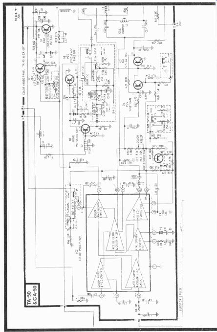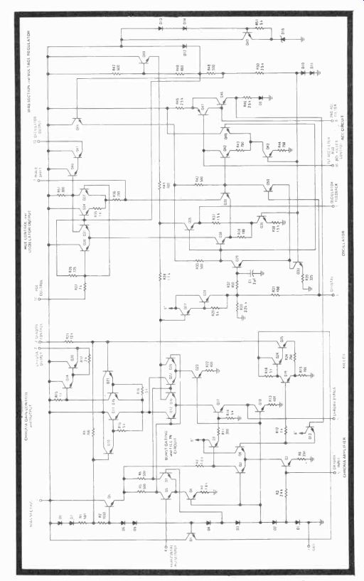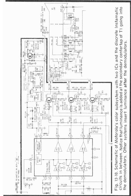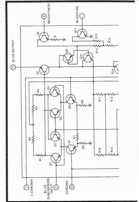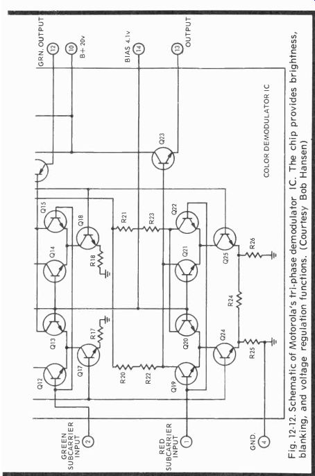 MOTOROLA'S DISCRETE & IC COLOR SUBSYSTEM The Quasar CTV8 chassis (Fig. 12-10) contains an integrated circuit color processor (IC2) and an integrated color demodulator (IC1). IC2 is an MC1398 which provides DC control for both chroma amplitude and phase shift, a crystal- controlled feedback oscillator, built-in noise immunity, a Schmitt trigger color killer automatic chroma control, burst gate and pulse shaping, oscillator lock, and built-in voltage supply regulation. A schematic of the MC1398 is shown in Fig. 12-11. Signal voltage for the color amplifiers and automatic chroma control functions comes from the emitter of the first video amplifier to pin 5, with a 0.05-mfd capacitor bypass at pin 6 (Fig. 12-10). The chroma amplifier (Q2, Q3, Q8, Q9, Q17 and Q18) takes its DC references from the series diode regulator string and upper left regulator output transistor Q6. The chroma amplifier supplies inputs for the chroma gain and output section directly above. Transistor Q2 is a constant-current source, while Q13 is a bias and operating source for both the chroma amplifier and the color killer Schmitt trigger to the right of the amplifier. Differential amplifier Q3-Q9 supplies Q8 with in coming chroma that is emitter-coupled to the base of Q17, another amplifier which receives regulated emitter current by bypassed Q18. Output from inverter Q17 now goes to the emitters of Q12 and Q16, half of a dual differential, constant current fed (by Q23) Q22 and Q26 gated switch. Gating for the differential amplifier (applied through Q5 and Q7) is switched by a 4-microsecond 3-volt p-p flyback pulse to pass the reference burst information used to lock the 3.58-MHz chroma oscillator. The second half of switched amplifier Q22-Q26 is used to prevent undesirable level changes in chroma during gating. Outputs now go to chroma gain control differential output amplifier Q11-Q15 and the gating inputs Q10 and Q21. DC bias for both Q10 and Q21 is set by the chroma intensity control outside the IC by voltage division from the internal connection between R1 and R2. Therefore, the conduction of Q11-Q15 is controlled and Darlington output Q14 and Q20 provides a linear chroma signal at pin 2. Without incoming chroma, there is no bias from Q13 for the Schmitt trigger, so Q19 goes high while Q25 conducts hard, pulling the base of Q21 down and turning the transistor off so there is no noise or transient output. The oscillator, of course, generates the 3.579,545-MHz chroma subcarrier, with a conventional crystal attached to pin 8. An RC series feedback network connects to ground from pin 1, a hue corrector and color killer control circuit at pin 10, and another capacitive filter at pin 9. Darlington pair Q27 and Q28 pick up the burst signals from Q16 and Q26 in the chroma amplifier section and deliver them to the base of the first section of the subcarrier oscillator, Q29. This transistor and Q50 form a differential pair from which the output level is proportional to that of the incoming burst. The conduction of each transistor then excites the rest of the Q35 through Q39 oscillator network. Oscillator output through Q38 goes to the emitters of Q30-Q31 so that hue control can be established. An oscillator signal also is applied to the emitters of a second differential pair, Q34 and Q37, for a 3.58-MHz output through Darlington pair Q40 and Q41 to pin 13-the oscillator signal exit for all three demodulators. The sine wave from Q39 is phase shifted somewhat by R36 and external capacitor C9. The hue control is simply another DC bias potentiometer that can manually change the bias on the two differential amplifiers which are already 180 degrees out of phase. DC bias changes mix the contents more or less and change the resulting output phase. The automatic chroma control circuit supplies two operations: the first rectifies the subcarrier sine wave by differential offset amplifier Q42-Q45 and puts out a DC voltage proportional to the incoming chroma signal. The second function is adjustment of the operating point for Q46 and Q47 through the action of the controls at pin 10. With incoming chroma, the ACC output turns on the Schmitt trigger input, Q19, and turns off output Q25, which then has no affect on Q21 and Q15, but Q13 still supplies operating bias for Q9. With no ACC, naturally, Q19 is off, clamp Q25 is on, Q9 has no base bias and so ceases to conduct. Voltage regulation and bias drops are generated by Q48 and Q49 with D12 through D14 and reference zener D15, while D10 and D11 provide base bias for Q33, the current feed for Q29 and Q50. Normal chroma out (Fig. 12-10) then passes through pin 2 to mixing transformer T1, while luminance information arrives the centertap in the T1 secondary, where both chroma and luminance are combined. But, remember, the chroma must be demodulated. The 3.58-MHz subcarrier sine-wave output appears at IC2 terminal 13 and is applied by way of RLC coupling to the red, blue, and green demodulators. In passage to the demodulators, however, the chroma in formation meets some unfamiliar passive and active components making up the "Instamatic" circuits. There are two groups of circuits in the Instamatic: one, the variable potentiometer group which is preset and which controls the brightness, hue, contrast and intensity. An active semiconductor group increases the red output gain and monitors the amplitude of the second color "Int." amplifier and changes the demodulator phase. Transistors Q6 and Q7 act as an AND gate when the Instamatic is active, so that Q7 shunts the red drive control (R32) and allows more current to flow in the Q10 emitter, and therefore, the collector. As a result, Q10 conducts harder and supplies a slightly reddish tint to the CRT screen. At the same time, the 3.58-MHz phase angle to the blue demodulator is changed slightly through C21 and, together, the two changes cause the screen to broaden the area of fleshtones. The other active part of the Instamatic circuit is com posed of