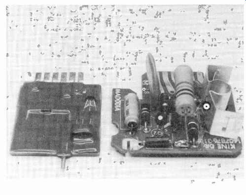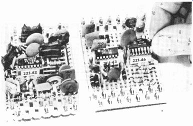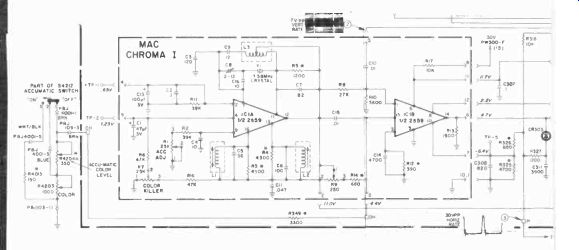 The uA780 phase locked loop subcarrier regenerator contains the 3.58-MHz oscillator that is phase-locked to the transmitter by burst through the automatic phase control detector. This IC also furnishes burst gating, DC tint, and automatic chroma control, plus its own regulated voltage supply. The schematic is shown in Fig. 12-18. An overall interconnection diagram for the entire chroma processor appears in Fig. 12-19. The oscillator itself (pins 6, 7, and 8) is made up of two pairs of differential amplifiers, with bias and control gates at all inputs. Rigid control is provided by the APC detector DC outputs at pins 11 and 12. The oscillator, through feedback out of the base and emitter of Q16, drives the Q17 section of differential amplifier Q17-Q18 to supply the emitters of the APC and ACC detectors as well as the oscillator output at pins 2 and 3. The oscillator output signals are phase shifted by RLC components in the ladder network phase shifter and delay line where the sectional or total time delay can be calculated by N (the number of sections) times the square root of L and C: written: Td = NiLC …while the output impedance is : Zo = /ETC This network is strikingly reminiscent of the DC delay lines used in radar for square wave pulses, but used here basically to separate the phase of the voltages going to pins 6 and 7 of the uA746 chroma demodulator by approximately 105 degrees. APC and ACC setup controls are simple 20K potentiometers which are adjusted with the normal-setup switch in the setup position to provide bias at the bases of Q8 and Q7, respectively, without the benefit of incoming chroma. The subcarrier oscillator crystal is connected to pins 6, 7, and 8 (oscillator control), with feedback going to Q16 through pin 6 to complete the regenerative oscillator loop. Output from amplifier Q17 determines the phase for both the ACC and APC differential amplifiers, and makes one side conduct more than the other, depending on the respective DC biases during setup. Each of the automatic correction circuits is heavily filtered at the appropriate output from the uA780 and so supplies relatively positive and negative DC correction voltages to both the oscillator (Q12 and Q15), as well as pin 1 of the uA781 chroma IF amplifier to control its gain. The gate input at pin 4 (Q1) is a blanking pulse from the horizontal output trans former, temperature compensated and shunted by diode D1 and protected by zener D2. A DC tint control voltage applied at pin 1 of the chip changes the Q2 bias, and so shifts the phase of the oscillator output. Voltage regulation is achieved by the amplifiers and diodes in the upper right corner of Fig. 12-18. D3 is a reference zener for Q21, while D7 is a feed and temperature compensator for the base of Q22. Supply voltage changes will cause Q22 to conduct more or less, changing the base voltage of Q23 which conducts proportionately. As a result, Q24 varies the load on the 24-volt power supply, providing dynamic regulation for this portion of the chroma subsystem. D4 through D6 are also bias and temperature compensators for emitter follower Q20. The three chips are manufactured at least by RCA and Fairchild, and perhaps others. RCA numbers for the Zenith system are: CA3070, CA3071, and CA3072. RCA'S TWO-CHIP CHROMA PROCESSOR The two-chip chroma processor for this receiver is shown in Fig. 12-20 with output connections to the MAD CRT driver modules that are the encapsulated thick film throwaways exhibited in Fig. 12-21. The MAC chroma 1 module is shown as a pair of "amplifiers" included in the A and B subsections of IC1, with outputs going to MAE chroma module 2, which has a voltage regulator governed by the output of pin 6, IC1B of chroma 1. All areas within the smaller dashed lines, of course, are on edge-connector plug boards, while the large dashed lines denote the mother board for each particular section. This series of RCA solid-state receivers has four mother boards, 12 plug-in modules, and a removable, single-piece high-voltage quadrupler. We'll look first at the IC1 CA3066 (Figs. 12-22 and 12-23), that contains most of the color processors except the tint control and demodulators. Signals from the video preamplifier are coupled to pin 1 of the chroma amplifier. This stage, in which gain is automatically controlled by the ACC detector amplifier, supplies both the burst and bandpass amplifiers with signal. The chroma amplifier is stagger tuned to 4.3 MHz at pin 16 by the variable inductor and RC network, while the bandpass amplifier is tuned to 2.7 MHz, pin 13, by L2 and the RC combination so that the two combined can pass the 3.08- to 4.08-MHz chroma signals. The subcarrier signal is introduced between pins 7 and 11 by a crystal ringing circuit. This type of oscillator control is a somewhat less expensive method of color sync than the phase comparator, and the neutralization and damping of the circuit must be carefully designed for best transient response, especially so that no hue shading appears after the vertical interval. On the other hand, with this type of circuit you could dispense with the color killer, but RCA didn't. You can drive the ACC with the 3.58-MHz oscillator, since the amplitude of the ringing signal is proportional to the amplitude of the burst, and a well-adjusted ringing circuit will lock on a single cycle of burst. The circuit also must be followed by a well-balanced demodulator, and it does need a color killer if automatic color control is a feature, which it is. A horizontal keying pulse gates chroma from the band pass amplifier into the burst amplifier, and this stage, of course, rings the crystal for the 3.579,545-MHz subcarrier oscillator. Chroma gain is simply another potentiometer, as are the ACC adjust and color killer bias setting. Inductors L1 and L2 need alignment with a sweep generator for both band pass and gain. Fig. 12-23 shows the schematic diagram of the IC1 color processor. Common-emitter and current source amplifi