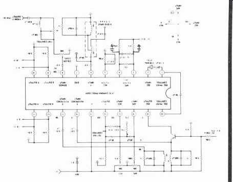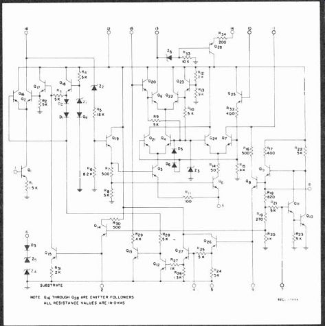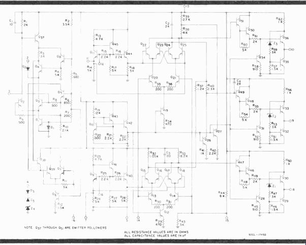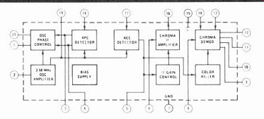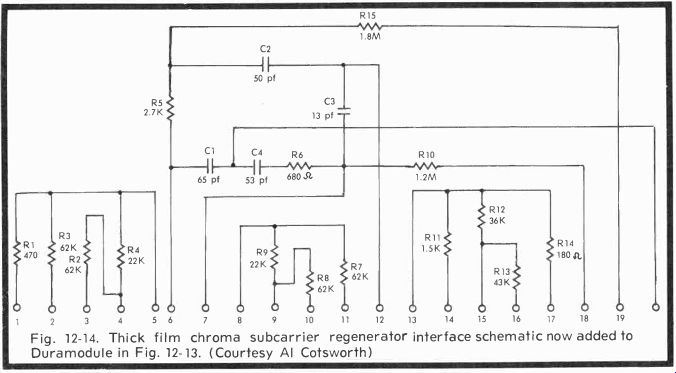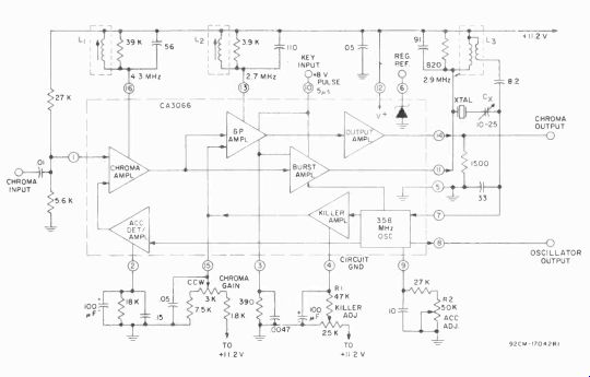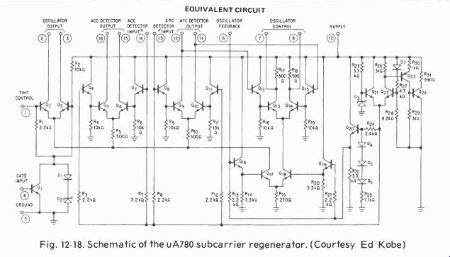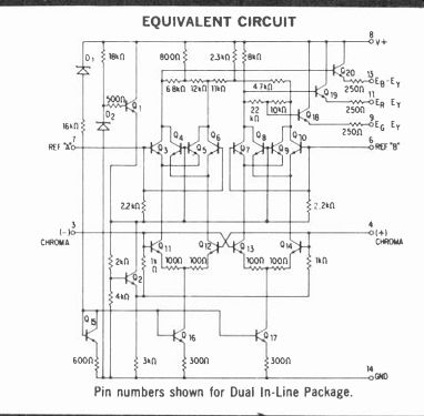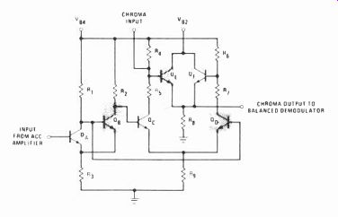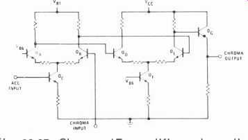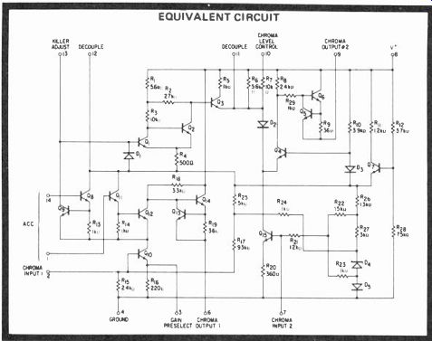 ...schematic for the uA781C chroma IF amplifier is shown in Fig. 12-16. ACC inputs are pins 1 and 14, which connect to emitter-follower Q11 and decouple stage Q8. Chroma comes in at pin 2 and goes to the base of Q10 for initial gain-control amplification. DC voltages from the subcarrier regenerator are simultaneously applied to the automatic chroma control in puts. The potentials are different, however, and when Q8, for instance, is driven further into conduction to supply more base current to Q9 (which makes this emitter follower furnish more collector-emitter voltage for Q10 and Q12), the opposite phase voltage on Q11 causes this emitter follower to drive Q12 less. As a result, the output of Q12 is regulated, as well as the output of follower Q14, the first chroma output shunted by switch Q13. An opposite condition can occur, too, where Q11 can drive Q12 harder when there is less collector-emitter voltage from Q9. Therefore, the gain-controlled chroma output at pin 6 is coupled to the input of the second chroma amplifier (Q15) at pin 7. DC for the base of Q15 is regulated by zener diodes D4 and D5, which are supplied by Q7 from the power supply. D4 and D5 also furnish collector voltage and emitter-base bias for Q10, Q1, Q2, Q11, and Q8 in the stages just described and in the Q1, Q2, Q3 DC gain control circuits that monitor the DC from the level control relative to the potential at the collector of Q9 and the killer adjust. Diode D2 is a gain control, operating together with Q4 (like Q9 and Q12). Chroma from the collector of Q15 forward biases the emitter of Q4 and reaches the base of emitter follower Q6 as a positive-going signal identified at pin 9 as chroma output 2. Diode D3 supplies both bias and temperature compensation for amplifier Q4.