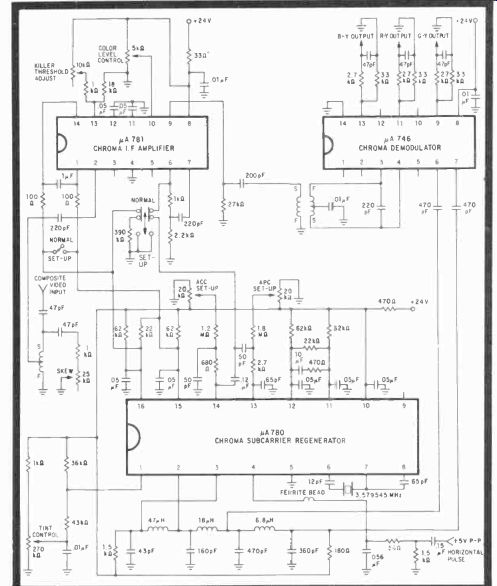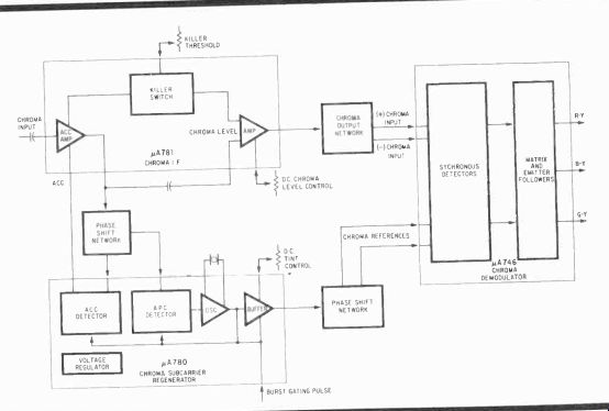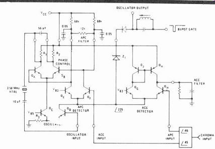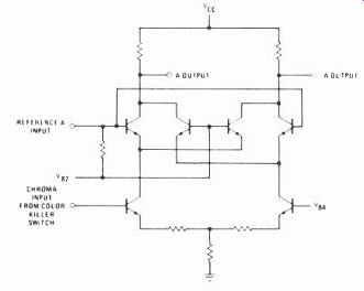 At the June, 1971, IEEE Broadcast & Television Receiver group meeting in Chicago, R & D products showed a complete one-chip color processor. The finished product has a power dissipation of 400 mw, an output resistance of 50 ohms, five alignment adjustments, and 42 external components as op posed to the announced competition which has 62 and 77, respectively, for active 2- and 3-chip circuits. The system is identified as a uA782 chroma processor. A block diagram is shown in Fig. 12-26, while Fig. 12-31 outlines the entire function in what is described by Normal Doyle as a typical application. The external transistor is a blanker for 3.58-MHz reference signals to the demodulators. Other peripheral components include APC and ACC potentiometers, capacitance couplers and filters, the 3.578545-MHz crystal control for the color oscillator, video input and chroma reference input trans formers. The block diagram (Fig. 12-26) starts with the 3.58-MHz oscillator that supplies the demodulators through pin 19, and the oscillator phase control, ACC and APC detectors, along with an active bias supply. The ACC detector output goes to the IF gain control and color killer, and these two stages act on the chroma IF amplifier and the chroma demodulators, respectively. Color IF Amplifier (Fig. 12-27) The basic chroma amplifier comprises two cross-coupled pairs, Qa-Qb, and Qd-Qe, with incoming video applied to the base of Qb from the video detector and the bandpass trans former at an amplitude of from 10 to 200 millivolts p-p. Automatic chroma control voltage at the base of Qc controls the DC gain of both transistors, with outputs to the bases of Qd and Qe, another differential amplifier supplied by constant current source Qf. Emitter follower Qg is the output with AC at about 2 volts p-p, and this voltage goes into the demodulators through an output that contains both level and tint controls. Subcarrier Regenerator and Control Circuits (Fig. 12-28) Again, a current supplying transistor Qc activates the emitters of Qa and Qb, which supplies the 3.58-MHz crystal, its tuning capacitor, and the base of Qd. Qd and Qa form a voltage-controlled oscillator. The oscillator frequency is determined by the voltage difference between the bases of Qa and Qb, which results in drops across R1 and R2 in the collectors of Qa and Qb, and the charging 56-pf capacitor between them. Upon horizontal scan, the collector of Qd rises toward Vcc, back-biasing the emitters of Qe, Qf, Qg and Qh, and allows oscillator current to flow into the external LC circuit, sup plying a pair of reference signals for the demodulators. But when burst appears, the slightly delayed negative horizontal cutoff pulse back biases the "diode," and the oscillator current channels into automatic phase control detectors Qe and Qf and automatic chroma control detectors Qg and Qh. Since plus or minus 45-degree difference phases of burst from the chroma input appear at the bases of Qf and Qh, Qf is turned on and its output goes to Qb and the APC filter to supply any correction voltage needed by the color oscillator. Since the ACC detector is turned on simultaneously with the APC detector, base-coupled Qk and Qj form a balanced-to-unbalanced converter, with initial collector currents equal. The output goes into an ACC filter for proportional DC control of the IF amplifier and color killer circuits.