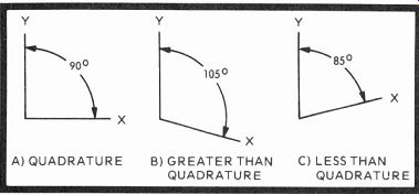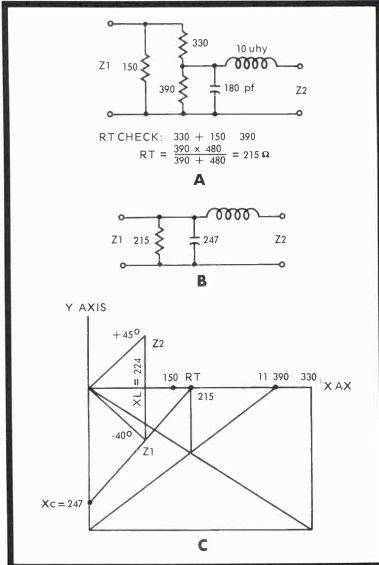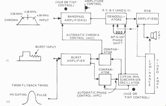 So much has been written and re-written about the chroma section in color television receivers that we felt compelled to avoid complicated, involved explanations in favor of a very simple, straightforward presentation that should stand the test of time. And after you have explored the block diagram, diode, transistor, and then integrated circuit demodulation, along with general color processing, you should have a very thorough idea of most, if not all the methods in use today and the many reasons for their existence. We begin with a block diagram, and then examine each section individually. THE CHROMA SUBSYSTEM There are three inputs to any U.S. chroma subsystem (Fig. 12-1). No. 1 is the chroma input from the first or second video amplifier. No. 2 is the burst, which comes from either the first bandpass amplifier or directly from the video amplifier, depending on the amplification needed. And No. 3 is the high-voltage transformer-generated gating pulse that turns the burst amplifier on. Following the burst amplifier, there are often two comparators, each usually composed of a pair of diodes. They match the phase of the incoming color sync burst against feedback from the 3.579,545-MHz subcarrier oscillator, and correct the oscillator frequency. Also, there is a second comparator, doing the same thing as the first comparator, but this one generates a DC automatic control voltage, reputedly a linear function of incoming burst amplitude, that is supposed to proportionately regulate the amplitude swing of the band pass amplifier (s). The bandpass circuits, naturally, have a chroma amplitude control, while others also have a tint or hue control. The burst amplifier is gated into conduction by a comparatively large pulse from the flyback transformer every 63.5 microseconds for a period of between 5 and 10 microseconds to admit the color sync burst. This burst amounts to 8 to 11 cycles on the back porch of the horizontal sync pulse and on top of the blanking pedestal. There may be a hue or tint control that manually governs the phase of the 3,579,545-MHz subcarrier, rather than the one bracketed in the bandpass amplifier; this is a choice among the various manufacturers, but usually the phase of the subcarrier is shifted since it's a simple sine wave and easier to control. The bandpass information now goes to the demodulators. Also applied to the demodulators are two subcarrier oscillator signals, one at 85 degrees and the other at 105 degrees from burst. These phase angle separations are, however, entirely predictable, either by straight math or through a relatively simple system of graphic circuit analysis that we'll demonstrate. The circuit, along with its analysis, are both shown in Fig. 12-2. Initially, we see a 180-pf capacitor in parallel with a 390-ohm resistor. The 390-ohm and 330-ohm resistors (in series) are paralleled with a 150-ohm resistor. Finally, there's the 10 microhenry series coil in the Z2 output. First, let's show the sum of the 150- and 330-ohm resistors on the graph-no phase shift. We'll drop a perpendicular from the 330-ohm resistor to some convenient point, cross over to the Y axis, then draw a line from 0 X-Y to the right corner of the diagram and another line from the parallel ( ) 390-ohm resistor to the left lower corner in the third intersection. Where the three junctions meet, and directly up to the X axis, is the resistive (RT) total. Now, we calculate the reactance of the 180-pf capacitor: Xc = 1/2Trfc and this amounts to 247 ohms, which is promptly measured on the 4th quadrant negative Y axis. A line is drawn between this point and RT, and a perpendicular laid off to the 0 X-Y junction on the left. This angle, measured by protractor, is-40 degrees. The inductive reactance: XL = 2TrfL is calculated at 224 ohms, and, because it is inductive, is laid off vertically according to the measured distance, and a diagonal is again drawn to the 0 X-Y axis. The measured angle here is 45 degrees. So, from-40 to +45 is an algebraic total of 85 degrees, and this is the same type of phase angle shift we show accomplished by a simple coil in Fig. 12-1. With an adequate vectorscope, you would see this phase angle precisely reflected in the vector output as the phase difference between the third R-Y and sixth B-Y vector petals (Fig. 12-3). At 85 degrees, this angle would be less than quadrature, while at 90 to 105 degrees it would be equal to or greater than quadrature. These phase angles are determined at times by some of the "company official viewers," while at other times-and this is the more prevalent condition now, thank goodness-by the design engineers who are trying to find the best angle to complement the latest RGB phosphors. With yttrium phosphor reds, the usual angle of demodulation is very nearly 105 degrees. Green now, however, is the weakest phosphor, and so the newest receivers "key" on this color instead of red, as most did in the older tubes when blue and green were the stronger phosphors. The "demodulator evolution" began with RCA's X and Z type, which demodulated at an angle less than 90 degrees and used relatively few components. Some off shore and USA manufacturers continue their use even today. Next were Zenith's original high-level demodulators, which amplified first (the opposite of the RCA system) then demodulated, passing the demodulated chroma directly to the electrodes of the picture tubes. Both these systems, by the way, fed the color signals to the grids of the picture tube (Fig. 12-4) and luminance into the cathodes; the picture tube actually did the RGB and Y matrixing (mixing). Both these systems derive the greens from negative portions of the R-Y and B-Y inputs (Fig. 12-5A through E). The second innovation (B) used principally by Motorola and RCA, was the 3-diode matrix, where G-Y was actually demodulated separately, but RCA still went to the cathodes and grids, while Motorola put pure RGB directly into the CRT cathodes and grounded the grids at t