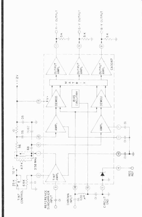 The CA3067 chroma demodulator and tint control is another 16-pin IC, this time centered on the MAE chroma II plug-in module (Figs. 12-24 and 12-25). Subcarrier reference input is fed from terminal 3 to the tint amplifier. The tint amplifier gain is adjusted by the 25K DC control connected to terminal 2. Q7 base is at AC ground through a 0.01-mfd capacitor at terminal 16. Q2-Q3 is a differential amplifier, with Q3 base-fed from the terminal 3 input. The output of these two amplifiers is mixed in the collector of Q4, and the gain of Q4 and Q3 is adjusted by the tint control for an oscillator mix that results in a certain phase shift for desirable flesh tones. Q8, meanwhile, supplies DC bias for Q4 from the divider network of R2, R5, etc., that extends to the bases of Q6, Q5, and Q1 from the main 11.2-volt supply. Voltage from the Q4 collector passes to the base, then emitter, of Q38 and into the base of differential amplifier Q39-Q7 and out to the RLC phase shift ... ... network for the amplifier-demodulator input terminals 6 and 12. These passive components determine the phase angles of the sine waves going into the amplifier-demodulators. Terminals 7 and 11 connect to additional emitter bypass filters. Terminals 6 and 12 may be a little difficult to find, but they are located in the base inputs of Q9 (lowest amplifier) and Q11 (top amplifier), respectively. These two amplifiers are identical and seem to be self-adjusting, since the greater the input the more voltage dropped across R13, for instance. The greater the drop across R13, the less the base input to Q45, and the less signal appears through the emitter of Q44. The same is true for the Q9-Q40 group at the bottom of the schematic. The Q10-Q42 assembly is virtually a regulator for the base bias voltages of Q12, Q19, Q26, Q27, Q34, Q31, and Q28 so that when the main supply changes, Q43 feeds back to Q10, and the DC outputs at the emitter of Q42 is automatically limited or boosted, depending on the drop across R19. Chroma is applied to the lower Q13-Q14 and Q20-Q21 pairs of differential amplifiers, but only through terminal 14, since terminal 15 is at AC ground and the resonant frequency of the 620-microhenry coil and 0.01-mfd capacitor in series amounts to 63.7 kHz, with the reactance of the capacitor amounting to 1 ohm at 3 MHz. To describe the switching action of the synchronous demodulators: when Q13 and Q20 are receiving chroma, R18 and R28 develop sampling signals that key Q22-Q24 and Q15-Q17. And when R14 and R24 develop subcarrier references and turn on Q23-Q25 and Q16-Q18, synchronous switching develops that produces the R-Y and B-Y outputs from the top and bottom output demodulators which go to Q51 and Q47. The G-Y information is resistively matrixed by R37 and R40 for the Q31-Q33 output amplifier with a Darlington Q48-Q49 driver at its input. Capacitors C2, C3 and C4 are the 7.2-MHz filters that absorb switching transients. Since there is signal inversion in Q9 and Q11, signals to the bases of each pair of synchronous switches are 180 degrees out of phase with those opposite, so one pair switches while the other pair is off. It's interesting to note that in the Q29-Q30, Q32-Q33 and Q35-Q36 output amplifiers, a bias is developed for Q29, Q32, Q35 in the collectors of Q30, Q33 and Q36. The bias keeps the lower transistors turned on and helps deliver a pair of rein forced, low-impedance, in-phase inputs to the MAD kine driver modules. These MAD modules are a trio of two transistor amplifiers that mix chroma and luminance for RGB cathode drives of the picture tube. The Accu-Matic in this receiver does about what most other fixed bias systems of this type do: it reduces the blue output, changes the phase angle slightly towards open, adding some red, and enlarges the demodulation angle so that the area of fleshtones is increased. A ONE-CHIP COMPLETE MONOLITHIC CHROMA PROCESSOR