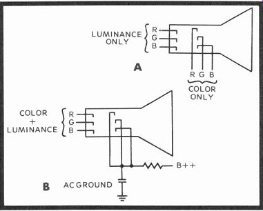 Next, Motorola (C) put chroma and luminance together into an integrated circuit, and went into the CRT with pure RGB. At about the same time, Zenith (D) began demodulating R-Y and B-Y with an IC, matrixing the Y and greens, then amplifying before application to the cathodes of the CRT. Finally, in 1970, RCA and Zenith "IC'd" (E) the entire chroma and subcarrier color sections, and fired the CRT cathodes directly with reds, blues, and greens. The reason for going to cathode CRT operation, according to Fairchild's Normal Doyle, is that with the tube matrix system, gray-scale tracking adjustments are made in the luminance channel. And this requires qualification in the demodulation process because of the difference in phosphor efficiencies and to relate the grid drive more nearly to the cathode drive. In the red, blue, green system (RGB), however, color-difference signals are mixed before entering the CRT, and only the cathodes are driven, while the grids are at AC ground. In this method, both signals are already arriving at the same set of tube electrodes simultaneously; therefore, no individual correction is needed for best color reproduction.