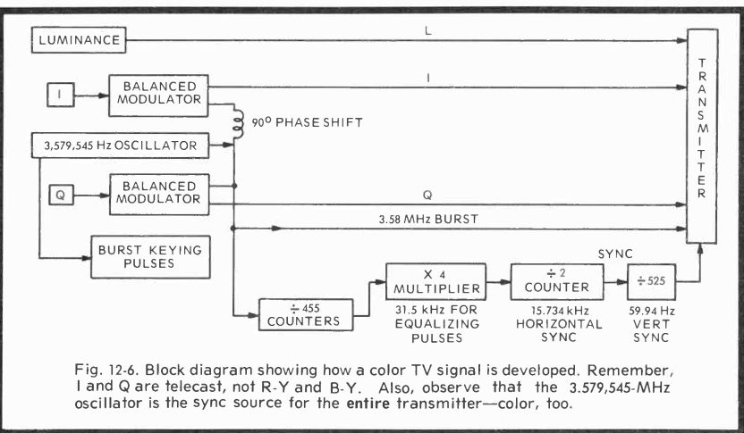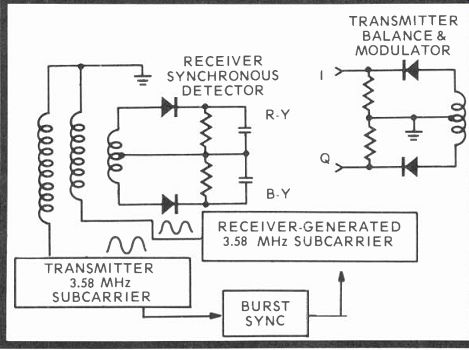 MODULATION TO DEMODULATION Although we talked about this subject somewhat in Section 1, more detail is needed so you will be able to trans late between the two with ease and certainty. Since we cannot transmit two separately modulated subcarriers of different frequencies because of non-frequency interlace and the resulting beat that would ensue, we resort to two-phase modulation of a single carrier. These "two" sub carriers are of identical 3,579,545-Hz frequencies but are separated in phase by 90 degrees. In reality, just as in the receiver, this is actually a single carrier generated by a single source, with its slave branch phase-shifted 90 degrees. Fidelity of color transmission and reception can be greatly affected by crosstalk among all the primary colors if the transmitted phase separation is not carefully maintained, and if the receiver is poorly designed or has component defects. If, for instance, there is carrier imbalance, a gray or white picture area will not cause the transmitted I and Q signals to go to zero, and these neutral shades become colored and are quite objectionable. Also, if there is a video unbalance, un desirable video will be added to luminance and distort the gray scale. A positive upset in the Q modulator, for example, would somewhat intensify reds and blues but darken greens. Negative unbalances would intensify greens but shade blues and reds. Transmitted signals start out, of course, as red, blue, and green information from the three picture tubes in the camera. The three signals are channeled into an encoder or transmitter matrix, and come out as luminance, I, and Q intelligence. These I and Q signals are each then put into a balanced modulator driven by the 3.58-MHz subcarrier oscillator (Fig. 12-6). The subcarrier is virtually suppressed during trans mission and, along with burst, luminance, and sync, go to the transmitter for external broadcast. Greens are included in both I and Q, so no separate green signal is transmitted. The modulation and demodulation processes are illustrated by a diagram from Sylvania's Color TV Clinic Manual, Volume 1, by Eugene Nanni and his staff at GTE Sylvania, Batavia, New York. We've made a couple of changes, however, to suit our immediate purposes. See Fig. 12-7. As I and Q information reaches the transmitter diodes, the 3.58-MHz subcarrier makes each conduct in the peak signal sequence, turning one diode off while the other is on-a time sharing process called synchronous detection so that both signals may be placed on a single carrier. While in the receiver, the I and Q signals are initially phase shifted 33 degrees by the receiver circuitry, and R-Y, B-Y ( and G-Y in late receivers) is demodulated by an internally generated but burst sync'd 3.58-MHz oscillator to produce the same picture tones (phase and amplitude) of the transmitted signals. There are a number of ways to generate such synchronous demodulation which we cover shortly in the discussion of various receiver demodulator techniques.