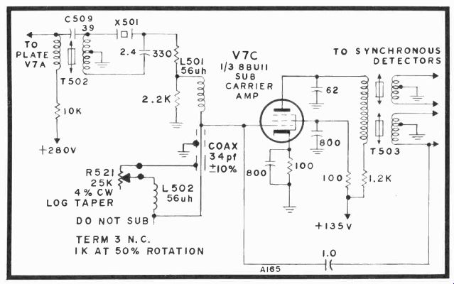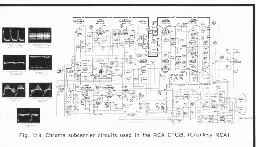 RCA'S CTC25 CHROMA CIRCUITS In this mid- '60s vacuum tube receiver (Fig. 12-8) chroma is applied to the bandpass amplifier through terminal J, while terminal K carries the flyback turn-on pulse for the burst amplifier. With no incoming chroma, the potential at the V707B blanker grid is-90 volts, much of which finds its way to terminal 1 of the R144 1-meg color killer potentiometer, while the top of this control, pin 3, sees +27 volts at the cathode and suppressor of the burst amplifier, showing that this tube is conducting because of the continuous flyback pulse. With no incoming color, the killer control is adjusted so that it just cuts the color killer on, delivering negative DC to the grid of the bandpass amplifier, cutting the tube off. With a chroma input, however, color sync reaches the burst amplifier through C705, and turning on the burst amplifier feeds burst transformer T702. The transformer output goes first to voltage-phase comparator diodes CR705 and CR706, which generate a varying control voltage to turn off the color killer so that its plate becomes zero, and permits the bandpass amplifier to receive chroma at its grid through chroma takeoff coil L701. At the same secondary of the burst transformer are two more phase detector diodes, CR703 and CR704, that compare the phase of the 3.58-MHz oscillator with the phase of the in coming burst. The DC correction varies the grid voltage on reactance control V703A. This tube looks like a capacitor to crystal-controlled 3.58-MHz oscillator V703B, and so holds the oscillator in sync with the transmitted color sync burst by speeding up or slowing down the oscillator. Signals from the 3.58-MHz sine-wave oscillator go to pentode X and Z demodulator suppressors (the phase of the signal to V709 is shifted 90 degrees). In-phase chroma signals go to the V704-V709 grids. The two tubes conduct on the positive sine-wave tips, producing R-Y and B-Y outputs that differ in phase by less than 90 degrees. Green is resistively derived in the G-Y amplifier through the voltage divider between the X and Z demodulators and 270-ohm common cathode bias resistor R728. Chroma is then amplified and coupled by capacitor-shunted resistors to the CRT grids. Luminance is applied simultaneously to the tube's cathodes because of the 0.8 microsecond delay line between the second and third video amplifiers. Arriving through PW700 terminal T is a large positive blanking pulse that drives the V707B blanker into inversion and produces a negative blanking pulse every 52.4 microseconds for some 11.1 microseconds duration, which turns off the three color amplifiers. In Fig. 12-8 the color amplifiers are passing a color-bar generated pattern which shows large negative off periods, with considerable variation in AC color-bar amplitudes, depending on color signals reaching the RGB (-Y) outputs. The DC plate voltages with no incoming signal can be almost identical. In operation, the blue gun is conducting the hardest, with red second, and green only a few volts, since we might assume the blanking pulse was included as part of the recorded waveforms, as it should be in the usual technician's evaluation. In engineering, we would mentally separate the two at once, since neither is a function of the other, and are completely separate entities. From the amplitudes of the various waveforms we could then deduce that blue was probably the weakest phosphor, followed by red, and then green. GENERAL ELECTRIC'S CRYSTAL RINGING CHROMA OSCILLATOR Another way to sync a chroma subcarrier oscillator is to use a high Q crystal filter (Fig. 12-9). This actually rings in damped sinusoids when "hit" by the color burst signal. Its advantage is that neither an automatic phase control (APC) nor a color killer circuit is required, since the crystal will not oscillate unless there is incoming color and, when excited, will directly provide all sync oscillations in the proper phase. Although the subcarrier amplifier shown in Fig. 12-9 is a tube type, the ringing crystal works equally well with semiconductors. R521 is the tint control that induces a vector-like RL phase shift in the grid of V7C so that the best fleshtones can be manually tuned. Feedback is applied through the 1-mfd capacitor from the negative lower winding of T503, while the 800- and 62-pf capacitors in the grid and plate circuits are stray oscillation-preventing filters. Notice that the screen grid resistor is only 100 ohms, while the plate supply from the same DC source is applied through a 1.2K resistor and the primary of T503. This keeps the output at a certain level and "limits" the output to a certain DC swing. The voltage drop across either the 100-ohm or 1.2K resistors divided by the values of these resistances will, of course, tell you the current drawn by each electrode.