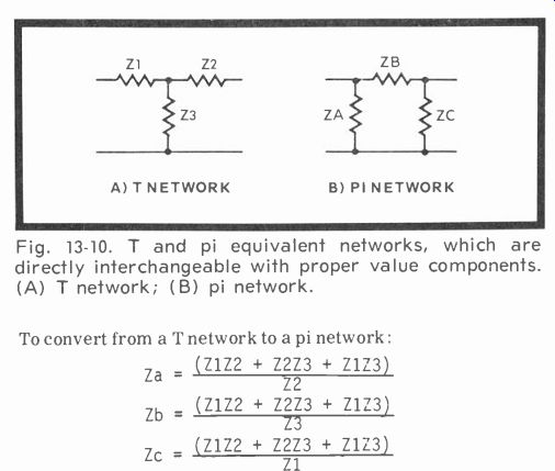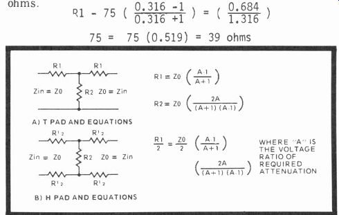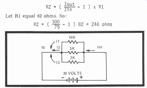 Therefore, if stations were not in line, you would have to use a rotor, that will certainly pickup stray and surrounding signals-and these can mean leading or trailing ghosts in the picture. So your only protection is to learn to read the gain and lobe patterns that every manufacturer should furnish with an antenna. In this way, you at least have a fighting chance for a reasonable installation at a reasonable cost, along with a satisfied customer. INSTALLATIONS Before considering the technical aspects of an installation, a list of DO and DON'T rules should help those unfamiliar with the basics of the task. DO 1. Buy substantial mounting brackets and, if possible, stainless steel straps (banding) for long-lasting installations. They cost more, but stay put. 2. Use coated steel masts instead of aluminum masts for strength, especially in regions where high winds are prevalent. 3. Masts approaching 10 feet tall or taller should be guyed for added strength wherever possible. Five-foot masts usually carry almost any antenna if the mounting brackets are sturdy. Do BOLT together connecting sections. 4. Consider weather protected antennas and masts over those which are uncoated. Weather, salt spray, smog, corrosion, and dust can more easily contaminate those that aren't. 5. Check the antenna gain and lobe patterns first before buying any antenna. A quick analysis of the installation area, coupled with front-to-back ratios, SWR, and pattern lobes can save many a tough situation that could plague both you and the customer for months and possibly years. Even then, a narrow band antenna won't produce the broad response of a log periodic. So go LP if there are many stations to be received. 6. Where stations are located in diagonal or quadrature directions (90 degrees apart), a rotor is needed unless your signal bounce factor is superb. Otherwise, choose an antenna with a low front-to-back ratio if you want stations from the rear. 7. When using VHF-UHF combination antennas at distances over 20 or so miles from the transmitter, check the signal coming in directly from the antenna-on the roof if possible with a portable TV-before making the final installation. Sometimes you'll find the lead-in and especially any non-amplifying two or four-set couplers-will cause considerable problems with UHF. 8. If you're checking an antenna on the roof with a television receiver, tilt, raise, and lower the unit for maximum gain and orient (turn) for best reception. Any peculiarities that show up in the final installation, then, will be due to the lead-in "dress," line loss, or proximity to metal conductors. In difficult situations, try different areas on the rooftop. One-man installations, with a portable TV for a helper, often can out perform a two-man job since a single individual necessarily has to be more careful. 9. In using most coaxial cable, don't forget the 72- to 300 ohm matching transformers and leave a small slit or drain hole in the plastic covering where it enters the house to let water out. A waterlogged piece of coax can induce all sorts of problems. 10. You can easily put two antennas on the same chimney (Fig. 13-6) if you allow enough vertical distance, say, 4 to 6 feet, to prevent inter-antenna interference. DON'T 1. Parallel gutters, AC current lines, air-conditioning ducts, or other metal structures with unshielded twinlead; the ghosts you'll attract will all be nightmares. 2. Put cheap installations in difficult areas where there are reflections, poor signal-to-noise ratios, or great distances. Be fair with the customer as well as yourself ; it's better to lose a lousy job than suffer perpetual aggravation. 3. Hurry to buy either antennas or transmission lines without knowing their specifications. "That which is cheap is often dear" in terms of personal reputation and customer satisfaction. Usually, the best is none too good. 4. Succumb to the habit of blaming the television set for your installation troubles until you've at least tried an indoor antenna to see if there's improvement in reception. Traps and attenuators can remove a great deal of interference most receivers can't reject. 5. Expect the new "mini" antennas to solve all your general reception problems. One day, such antennas may be high-gain, low-profile, and omnidirectional, but not yet. In any area with reflections, weak signal strength, and directional needs, a good standard antenna will be needed for a long time to come. 6. Put up a big antenna in high wind areas without considering its strength characteristics. If wind velocities reach 100 mph, a 75-mile-an-hour antenna installation can conceivably snap or bend at the mast, and you can't bend it back into position without mending (probably welding) the break. 7. Tape twin or oval lead-or any unshielded lead in-to masts, standoffs, gutters, or metal of any description unless you want ghosts induced by standing waves in the received pictures. Further, never lay any transmission line on a roof. The consequence is signal absorption (loss) and rainwater damage, leading to added reception problems. Use standoffs in all installations at all times, and never allow the lead-in to touch metal. 8. Neglect the use of standoffs even with shielded lead-in, since they keep the lines taut. A loose lead-in sways in the wind and could eventually break the copper stranding as well as crack the plastic shield. 9. Tell a customer the old B&W installation is always good for color. It often is, especially if there is unusually good, ghost-free reception. But take no chances when secondary signals retard images you see as ghosts, and where weak signals show a bit of snow. Ten to one, he'll need a good, new installation, complete with the usual accessories. 10. Be bashful about quoting a reasonable price. Others get it, why not you? WORKING RESISTIVE DIVIDERS While keyed AGC (with average video AGC combined with keyed AGC on the way) has dealt the routine divider a near mortal blow, there are still insta