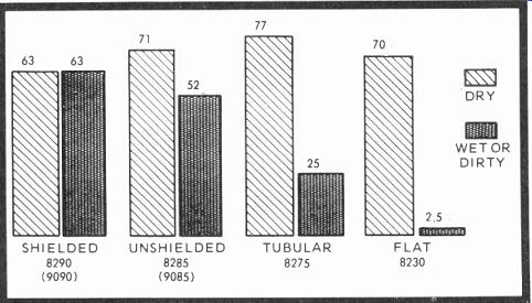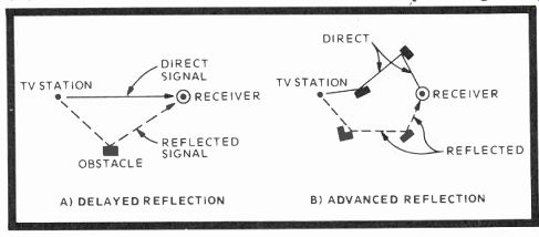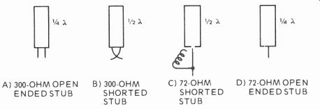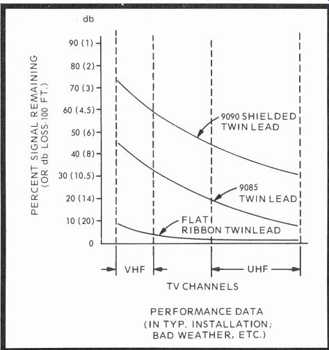 Probably no subject is more overlooked than antennas and transmission lines. Now, with cable TV bringing good-to-excellent pictures into many homes and more just around the corner, it's time everyone paid more attention to what's coming from the broadcast stations. TRANSMISSION LINES Fig. 13-1 shows the percentage of signal remaining on new, clean lines, then on wet, dirty lines, using Belden statistics as an example. The best is also the least as you will observe in the flat twinlead chart showing 78 percent signal reception with new, dry lead, but only 1.5 percent useful signal with old, wet, and dirty lead. And think how much of this inexpensive ribbon is laying on rooftops, taped to masts, looped over gutters (which are parallel to the incoming signal polarity) or stuck to metal conduits and air-conditioning ducts in hundreds of thousands of homes through America. Good transmission line, like anything else, usually costs money. However, many homeowners will happily pay the extra price if you explain the difference. Here's how. Belden, for instance, recommends the usual ribbon or flat lead for indoor use only, B&W VHF and FM reception only. The older tubular twinlead is all right for B&W VHF and-or perhaps local UHF reception. Coaxial cable is good for master antenna systems such as hotels, motels, apartment buildings, etc., but you'll find it lossy and somewhat capacitive over long distances. Belden recommends 8285 or 9085 (71 percent reception when dry and 52 percent wet and dirty) for all-channel systems in both color and B&W. The same cable also is excellent in fringe areas where there is little interference and only small amounts of soot, salt spray, or heavy smog. At the top of the list, though slightly signal restrictive, is Belden's shielded 8290 (9090) twinlead, especially developed for installations with signal problems such as auto ignition noise, transient pickup and excessive ghosts. Shielded lead-in may be taped to masts, routed through conduits and over metal objects. Best of all, no standoffs or lossy matching trans formers are required, since the nominal impedance approaches 300 ohms. There is no signal current flow in the shield, and both 8290 (9090) and 8285 (same cable without the shield) or 9085 are specifically designed for color television. The difference between the Belden 8290 and 9090 and the 8285 and 9085 series is that the newer "90" group is smaller in diameter than the older type, more flexible and easier to in stall. However, it has a slightly higher velocity of propagation characteristic and, in the case of 9085, 0.3 pf more capacitance per foot, plus somewhat more attenuation per 100 feet when the 9090 and the 8290 are compared. Also, the wire size (AWG 26) in the 9090 is smaller than the 8290 lead-in, which is listed as 22 AWG. Probably only under very extreme or unusual conditions could you possibly notice a difference in color or B&W reception. In Fig. 13-2, we can see the percentage of signal remaining or db loss per hundred feet, which shows what happens to signals in the VHF and UHF ranges where lead-in has become brittle, dirty, wet, and thoroughly contaminated. The left vertical column is marked off in percentages, while the adjacent db figures are in parentheses. Observe that with in creased frequency (VHF to UHF) the overall loss for all types of cable increases dramatically under unfavorable conditions. From this chart it is obvious that you must have 10 db or better UHF antennas where either distance or weak signals are reception factors. And a further very reasonable suggestion is ...