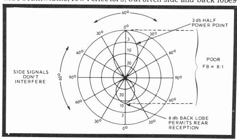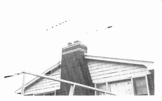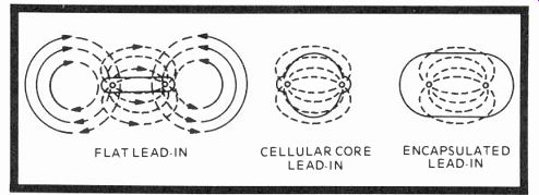 Now, take a hard look at Fig. 13-4. The drawing on the left represents the flat lead that, when wet and dirty, passes only 1.5 percent signal. Notice that the electro-magnetic field completely surrounds the insulator and is subject to all weather and external elements. Cellular core lead is a little better, but some of the EM field still encircles the outside of the cable. The encapsulated lead-in, however, contains virtually all of the surrounding electro-magnetic field, has proper spacing between conductors, and should be almost impervious to all but the severest weather because of its oval, thick jacket made of a special dielectric that is an element-resistive material. If this encapsulated lead were shielded, it would contain the entire electromagnetic field and, although attenuating the incoming signal slightly, the normal ghosting and noise pickup of ordinary unshielded cable would be eliminated. Obviously, good lead-in does make an enormous difference. And don't forget to give all unshielded lead one turn per foot when connecting it to insulating standoffs, since it will help reduce the SWR. Shielded lead comes straight down, but its ground wire must be grounded. ROOFTOP ANTENNA Installing a "price" antenna is probably the surest way to deceive a customer and earn for yourself a lousy reputation. Jobber salesmen must sell their "lines" to earn a living, but it doesn't mean you should always buy. Inspect the merchandise in advance, ask questions, and request every bit of in formation available on the antenna. Above all, don't buy in a hurry, or because someone says "it's good." There are such things as factual data, including gain and lobe patterns and wind resistance guarantees. Further, different antennas by the same manufacturer have all sorts of varied applications, and a study of the characteristics could save you considerable money, plus invite an excellent reputation. And this does not apply solely to those engaged in full-time antenna installations, because often the problem of poor color or ghosty pictures is directly connected to what is perched on the roof. Solid knowledge here is very often invaluable. For all you know, some new recommended antenna may be flimsy or strong, have little or enormous wind resistance, be adequate on low-band channels and literally worthless on high channels, pick up corrosion in 48 hours, have an appalling 1:1 front-to-back ratio, be the most unsightly kluge on the block, and have all the wrong characteristics for the right neighborhood. We didn't mention characteristic impedance, standing wave ratio, UHF characteristics-if it has any-the number of directors and reflectors, or db gain. Of course, there can be an element of reactive surprise in any installation because all factors just can't be positively pre determined. But a good, careful start usually means a happy ending. Theory says that an antenna is resonant when its measured length is half the wavelength of an incoming signal. So cutting a simple dipole for a specific frequency is not difficult. But making one antenna right for frequencies from 54 to 216 MHz and, sometimes, all the way to 890 MHz, takes a bit of doing. And everybody is not wholly successful, especially with the UHF-VHF antenna combinations, because it's a hard thing to do. The big antennas have many forward directors, often rear reflectors, and narrow beam-widths. Small antennas have wide beam-widths, few reflectors, but often side and back lobes.