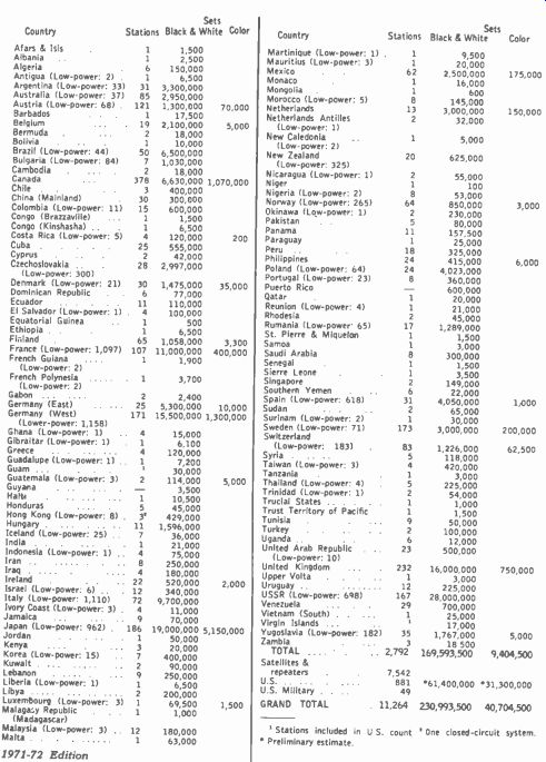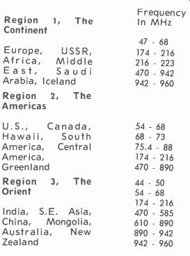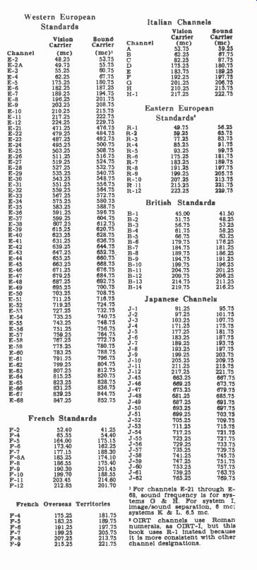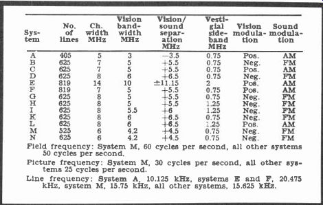 At last count, there are about eight television systems used in the world, and some have certain features in common: In those countries where electric current alternates at 50 Hz, the field frequencies are 50 Hz and the frame rate is 25 per second. Where the current rate is 60 Hz, fields are 60 Hz and the frame repetition is 30. The maximum video bandpass has been standardized at 3 MHz for the British 405-line system, 4 MHz for the U.S. 525-line system, 5.5 to 6.5 MHz for the 625-line European and French systems, and 10.4 MHz for the sideband 819-line Belgian and French systems. Frequency allocations for these various systems in the three principal regions of the world are given by geographical location in Table 16-1. ---------- Region 1, The Continent Europe, USSR, Africa, Middle East, Saudi Arabia, Iceland Region 2, The Americas U.S., Canada, Hawaii, South America, Central America, Greenland Region 3, The Orient India, S.E. Asia, China, Mongolia, Australia, New Zealand Frequency In MHz 47-68 174-216 216-223 470-942 942-960 54-68 68-73 75.4-88 174-216 470-890 44-50 54-68 174-216 470-585 610-890 890-942 942-960 ------------- There are also two important and very recent international Geneva agreements that should also be included: 1) In the 470 to 890-MHz UHF band, the frequencies of 620 to 790 MHz have been assigned to television stations in the FM band to receive satellite transmissions. However, these frequencies will not now be used in the U.S. by local agreement; only by foreign countries. 2) The UHF frequencies of 2500 through 2690-MHz have been assigned as Broadcast Satellite bands, along with 11.7 to 12.2 GHz. The standard aspect ratio throughout the world (the ratio of picture width to height) is 4:3, and all systems have 2:1 interlace scanning to avoid the unpleasant effect of picture flicker. FM is universally used for sound modulation, except in older English transmissions and in France and Belgium where AM is the method used. Both U.S. and European systems have standardized on negative picture modulation, where the transmitter power decreases as televised scenes brighten. England, France and parts of Belgium use positive modulation where power and brightness increase together. Despite the continuing differences in the several European systems, there are now 22 countries in Western Europe and North Africa that are linked by the Eurovision Network, and there are additional links to the Intervision Network of Eastern Europe. Since the launching of Telstar 1 in July 1962, and the later Intelsat series of satellites, distant television transmissions have increased to the point now where, in the Intelsat 4 satellite series, there are channels devoted completely to television. Europe and the United Kingdom have also standardized in the past 20 years, so that in countries using 50-Hz fields, the BBC and ORTF now exchange international programs on the 625-line standard. In Europe, however, there are still the German and French systems where considerable conversion is always necessary, although it is easier to work between these two than among the previous 405, 625, and 819-line systems, respectively, of all three. The remaining outstanding problem between the German and French systems is that of chroma subcarrier frequency tolerance. The German PAL system specifications are normally tighter than those in the French SE CAM system, so conversions from German to French are relatively easy, but sometimes rather difficult from French to German. The PAL and SECAM systems are evolutions of the U.S. National Television System Committee (NTSC) standards adopted in America in 1953. By 1960, the EBU-UER European television group finally decided upon the 625 line 50-Hz system, with a color subcarrier frequency of 4.43 MHz, based on 284.5 times the line frequency of 15,625 Hz. French, German, and U.S. systems transmit luminance and chroma separately, with the usual pair of color-difference signals that are modulated on color subcarriers. The color sync signal is also broadcast on the back porch of the horizontal sync pulse. The following description of the PAL and SECAM systems includes an evaluation supplied by NBC's Jaro Lichtenberg, a native of Czechoslovakia. The German PAL System The Phase Alternation Line television method was developed by Walter Bruch in 1961. Here, the phase of the chroma is alternated 180 degrees from one line to the next so it appears out of phase on every other line and therefore cancels differential phase errors. This requires that a line-switching signal must be transmitted also, as well as a synchronizing color burst. The result, though, is that there are few, if any, transmission phase errors, and a hue control as we know it in the United States is unnecessary. Compared to NTSC, the burst does not have the same type phase, but alternates first positive then negative 45 degrees (from 0 or burst) as it is transmitted from line to line, with changes being made by the line switching signal. At the receiver, this alternating burst is decoded and used to sync the burst so that the local subcarrier oscillator is firmly synchronized with the transmitter. In color transmission, PAL transmits only R-Y and B-Y (since G-Y is a combination of R-Y, B-Y and luminance) NOT I and Q as in the NTSC system. Both R-Y and B-Y double sidebands with bandwidths of 1.7 MHz below and 1.3 MHz above the subcarrier are transmitted to relieve as much chroma crosstalk as possible. While NTSC completes its vertical scan in two fields and at 30 frames per second, PAL operates with 25 frames per second and four fields. The frequency of the color subcarrier then turns out to be: Fsc = (284-!"T) FL + 25 Hz = 4.43361875 MHz The 25 Hz is an offset added for frequency compatibility with monochrome receivers. FL, of course, represents the line frequency, and 14 is the difference between the field rate of the color system and the 50-Hz power line alternation. There are at least three PAL demodulation scheme