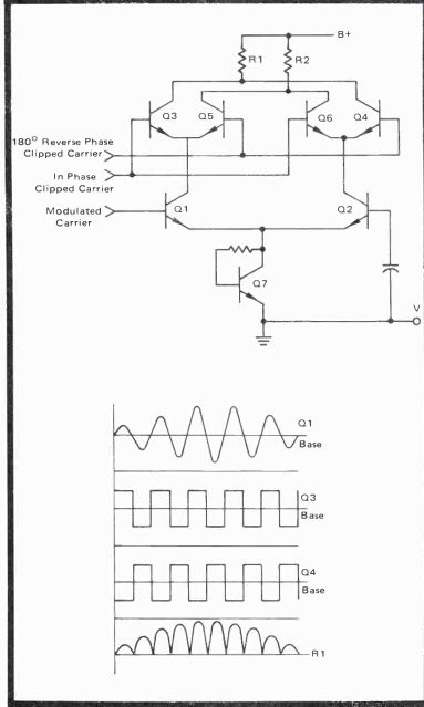 In place of the diode, Kiteley proposes a doubly balanced, full-wave, synchronous detector (you'll see more of this when we're discussing chroma demodulators) wrapped up in a convenient 8-pin plastic in-line package with a conversion gain of 34 db, a video frequency response of 6 MHz, and video output of 7.7 volts p-p. The linear transfer characteristics are exhibited in Fig. 6-8. The line between transistor output and diode output is straight, with an undistorted output and neither sync nor video compression. A schematic of the unit, including IF input and video output, is illustrated in Fig. 6-9, while a block diagram for such a detector is exhibited in Fig. 6-10. The video modulation is amplified and limited, passed to a full-wave multiplier for delivery to a low-pass filter and the video output. In the simplified schematic in Fig. 6-11, transistor Q7 is a forward biased constant-current source. Q1 and Q2 form a differential amplifier, with the base of Q2 at AC ground and the modulated carrier applied to Q1. Pairs Q3, Q5 and Q4, Q6 are the in-out phase clipped carrier-operated synchronous switches. Waveforms on the right side of the illustration show the Q1, Q3, and Q4 base inputs, and the resulting full-wave output developed across R1.