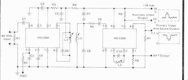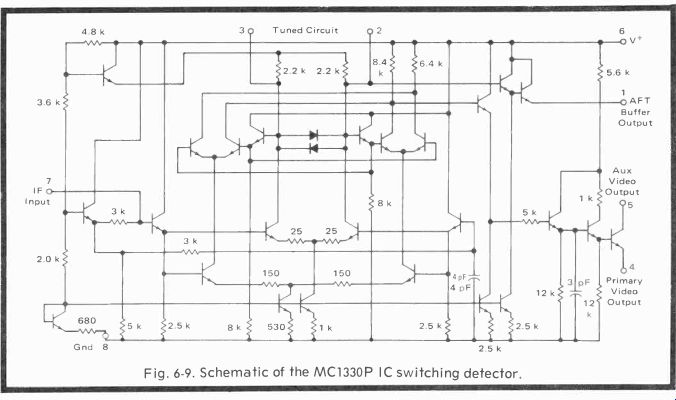 If an in-phase clipped carrier (Fig. 6-11B) is applied to Q3 and Q6, and the negative-going modulated carrier goes to the base of Q1, any possible Q1 conduction would back bias the Q3-Q5 pair of switches because of phase inversion, but turn on Q2 without phase inversion and Q6 would conduct. Current would, therefore, flow through R2 and produce an output. If Q1 were fully back biased, Q2 would conduct through differential action and turn on Q6 anyway. When the modulated carrier has larger positive incoming signals, Q6 is nonconducting because Q2 is off, while a negative voltage forward biases Q3 and produces an output across R1. With a change in clipped carrier phase, Q4 is turned on by Q2's conduction. Then, with a modulated carrier phase reversal, Q5 operates, since Q1 conducts negatively and forward biases its emitter, increasing the current across R2. This is called synchronous detection. First one and then the other switches operate as clipped carriers while modulated carriers go through a phase reversal and develop currents across R1 and R2. This action, of course, causes the detector to be switched at twice the carrier rate, leaving no original carrier present, but simply modulated pulses that are double those of the original carrier frequency (Fig. 6-11D). It is important that switching voltages contain only carrier energy and not color information. Therefore, this external circuit must have a filter such as L3 and C10 in Fig. 6 12. The figure shows two integrated circuits, the first two video amplifiers (MC1350), including AGC amplifiers and bias supplies. The second MC1330 device (schematic in Fig. 6-9) is the circuit we've been looking at, which also contains the third video IF. As you can see in Fig. 6-12, there are still coils to be tuned (the T1 coupling transformer between integrated circuits), so we don't have a transformerless video IF yet. At the outputs of MC1330 are two out-of-phase video signals, either of which may be used. The two signals are simply the emitter and collector outputs of the output transistor shown in Fig. 6-9. FM DETECTION & AUDIO AMPLIFIERS