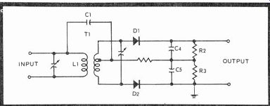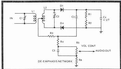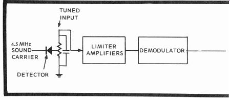 TV receiver audio systems have been taken pretty much for granted these last 20 years because there really wasn't much to them except rather inferior sound delivery. It all began with the good Foster-Seely discriminator that was somewhat susceptible to noise. Sound systems evolved to the popular ratio detector which was more noise immune, then came the pentode quadrature gated-beam detector and the locked-grid detector. Today, an ever increasing number of integrated circuit amplifiers and detectors are appearing, and at least one all-ceramic throw-away output stage is in use. TV audio systems are limited to a 50-kHz bandpass, rather than the 150-kHz bandpass reserved for FM and FM stereo. So you can't expect overwhelming fidelity nor sound-surrounding output. Nonetheless, with the advent of ICs and better designed push-pull output stages that no longer use trans formers, the quality of TV sound has improved remarkably. This is due to the self-limiting characteristics of the internal amplifiers, more precise demodulation, better de-emphasis and tone networks, more powerful and efficient outputs with less built-in distortion, and good impedance matches with an output coupling capacitor in place of the usual lossy trans former. The large bandpass of more recent power transistors has aided, too. A block diagram of a conventional TV sound system is shown in Fig. 6-13. Sound is picked off at the video detector by a sound detector diode, put through a 4.5-MHz FM audio carrier tuned circuit and fed into one or more limiting amplifiers. After FM is demodulated and de-emphasized to counter transmitter pre-emphasis, the audio is amplified in two stages and coupled to the speaker. The "cheapies" chop this sound procedure down somewhat, but all such subsystems are basically the same. The big difference exists in FM-to-audio detectors, and the less expensive receivers almost inevitably use a type of gated-beam detector, since demodulation requires a single tube or perhaps one or two transistors. Otherwise, the block shown is just about what you should expect to find in any receiver on the market. Discriminator This forerunner of FM detectors dates back to much earlier days when frequency-modulated radio was a novelty, so obviously it isn't especially recent or unique. But the sound it produced was good, and some radios today may still be using the idea, if not the circuit. Referring to Fig. 6-14, both primary and secondary circuits are LC tuned to the 4.5-MHz incoming carrier, and the signal is electromagnetically and capacitively coupled from primary to secondary. If the signal is exactly on frequency (carrier frequency), each of the secondary diodes receives 90 degree out-of-phase signals, and the rectified output currents develop equal and opposite (canceling) voltages across R2 and R3. When the frequency of the input signal varies below or above 4.5 MHz, the diodes-180 degrees out of phase with one another-develop relatively positive or negative outputs that reflect the degree of higher or lower incoming frequencies (modulation). The changing carrier frequency generates audio voltages that are proportional in amplitude to the FM broadcast deviations. You can always recognize an F-S discriminator circuit by the two detector diodes in parallel and the small capacitors. Ratio Detector The unbalanced ratio detector (Fig. 6-15) looks much like the F-S discriminator, except it has series instead of parallel ...