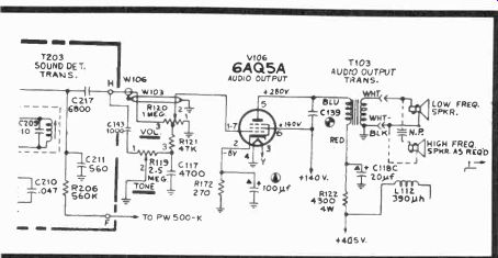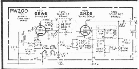 ... diodes, and includes a big capacitor across load resistors R1 and R2 to ground. Because of C4, the circuit's load voltage cannot follow small changes in the input signal and is, therefore, not sensitive to incoming amplitude variations. Phase differences between secondary and primary, and on either side of the tapped transformer secondary, are the same as in the F-S discriminator. However, since the detector diodes are in series, they generate a constant sum total of output load voltages at all times, but their ratio varies with the input signal deviation. The output is a changing ratio across the output resistors rather than a pure voltage difference. This is why such a circuit is called a ratio detector. Since the circuit always has a DC output, coupling capacitor C3 is installed to supply an AC-only audio voltage to the de-emphasis network and the audio gain potentiometer. In both the F-S discriminator and the ratio detector, as the input frequency passes above or below the resonant frequency, current in the transformer secondary lags or leads the induced voltage. And since voltages across the secondary coils lag the secondary current by 90 degrees, the voltages across these coils are then 90 degrees out of phase with the primary voltage when the received frequency matches the tuned resonant secondary. Vacuum Tube Sound Subsystems RCA's CTC25X chassis sound system is most representative of the middle '60s era (Fig. 6-16). Sound is picked off by a positive demodulating detector diode in the plate circuit of the third IF and brought to the grid of the sound IF (V201) through an RLC network following the diode and another blocking capacitor, plus additional series and shunt coils that reject video and sync and form a tuned 4.5-MHz circuit. The 6EW6 tube is a sharp cutoff pentode used in gain controlled audio and video IF stages. It features controlled plate-current cutoff and a high transconductance of 1400 micromhos. It's relatively large plate swing, along with the other characteristics, provides considerable gain so that only one stage is needed before demodulation. The sound IF (T202) transformer is double tuned for broad bandwidth, with a resonant circuit in its secondary, which is a good impedance match for the grid of the following sound demodulator. The 6HZ6 demodulator is a sharp cutoff pentode with two independent control grids. It may be used either as a Class A amplifier or as an FM sound detector in FM and television receivers in either parallel or series-connected heater strings. Used by both Zenith and RCA in much the same configuration, the circuit is similar in many respects to the old 6BN6 gated-beam detector, which had a rectangular cathode surrounded on three of its four sides by a focusing anode. Electrons leaving the cathode form a sheet-beam for the focusing anode, go through a narrow slot in the accelerator to the first control grid. If the control grid is slightly negative or positive, electrons may pass, but otherwise they are blocked and return to the cathode. The control grid, meanwhile, is saturated by large positive signals or cut off during negative signals and so limits the received FM signal amplitude. When the control grid allows electrons to pass, they go to a second accelerator, the screen grid, and on to the quadrature grid, connected to a 4.5-MHz high Q resonant circuit consisting of the RLC network between ground and pin 7.