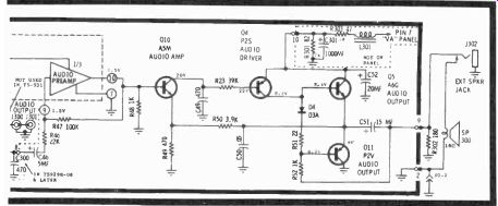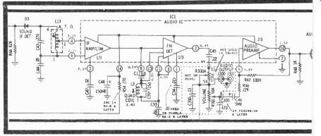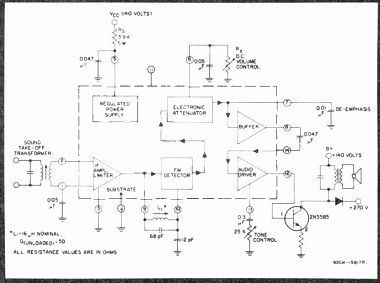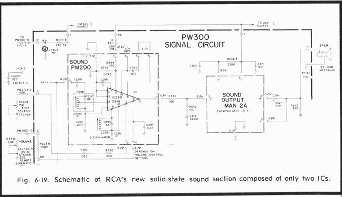 These differential amplifiers are, in reality, switching circuits that combine the varied pulse transitions through the emitter follower transistor (pin 2) and develop an audio output that is a linear function of frequency deviation. The recovered sound is then passed through pin 9 into the audio preamplifier current driver transistors and out through the emitter follower at pin 10, with some stabilizing feedback returning to pin 9. Further amplification is provided by Q10 and Q4. Q4 is a class B (approximately) push-pull output coupled through a 150-mfd capacitor directly to the speaker. In the complementary symmetry output stage, as it's called, the NPN-PNP coupled emitters are quiescently biased at 10.7 volts. The upper NPN base has 11.2 volts and the lower PNP base has 10.2 volts. Since the NPN's base-to-emitter voltage difference is +0.5 volt, and the PNP's base-to-emitter voltage difference is-0.5 volt, both transistors are forward biased to within 0.2 volt of conduction, also an antidote for crossover distortion. A positive audio voltage will drive Q5 into conduction, and a negative audio voltage will pass DC for ward-biased D4 and drive Q11 into conduction. The outputs are then coupled through C51 to the speaker. Resistor R50 supplies feedback, to the emitter of Q10 for DC stability and to minimize distortion at high output levels. R51 and R52 are simply the voltage dividing network for the base of Q11, while R302 is part of the load and charging path for C51. RCA's 2-stage IC thick film audio processor is represented in Figs. 6-19 through 6-22. Since an entire integrated circuit is obviously more expensive than several individual transistors, manufacturers must have reasons for going substantially all-IC. The CTC46 and CTC54, two new RCA solid-state chassis, have supplied many of the answers, except cost, and we'll probably never know this. However, the circuit on board PW300 consists of only three basic entities: one monolithic IC299, one phenolic encapsulated thick film IC, and one speaker. If you count the peripheral components, they amount to about 22 passive pieces-a far cry from almost hundreds used in other sets. So the initial answer here is economy of parts and low labor costs, since the PM200 sound section is a plug-in module, and so is the MAN 2A. IC299 is a CA3065 complex multifunction IC (Fig. 6-20) with an IF amplifier-limiter supplying an FM detector. The detector output goes to an electronic attenuator, to a buffer, and then to an audio driver and the MAN module. The block diagram, of course, is a "typical" circuit application that makes the routine look easy. But let's go to the schematic (Fig. 6-21) of this little 14-pin IC and you'll get a different perspective. Incoming sound, applied to terminal 2, passes through the Q11 emitter to the collector of Q12 without inversion, is coupled emitter-to-base to another set of differential amplifiers, Q14-Q15, then delivered to a third set consisting of Q18 and Q19 still in phase. Reference zener D2 and regulators Q1, Q3 and Q4 supply collector regulation for Q12, Q15 and Q19, and detectors Q22 through Q27. The bases of Q17 and Q20, are clamped by D7,...