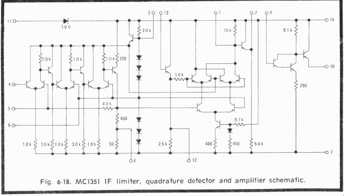 When the incoming signal is exactly 4.5 MHz, the tuned quadrature grid lags this frequency by 90 degrees. Higher frequencies cause larger phase lags and lower frequencies lesser lags. The combined effect of the two grids cause different pulse current widths to arrive at the detector plate, making the plate current a linear function of FM deviation. Audio voltage is developed across load resistor R206 and passed through a de-emphasis RC network and the volume control to the grid of the audio output. Notice that the tone control is in parallel with half of the volume control and is simply an RC series pair of components that can attenuate the higher frequencies, with possibly a boost for the low ones. The 6AQ5 audio output cathode is heavily bypassed, thereby allowing the tube to work virtually at full potential and deliver several watts of output. The suppressor grid is at cathode potential, while the screen is supplied by the +140-volt source. Capacitor C139, between plate and screen, is a basic troublemaker if its transient suppression and stabilizing function is disturbed, especially by a short. The primary of output transformer T103 often opens because of the 405-volt supply and high current demands of the output tube. Motorola's CTV7-8 audio subsystem Fig. 6-17) uses an IC and a push-pull capacitor-coupled output. However, the solid state FM detector does have a quadrature coil like the 6HZ6 tube, and so also is known as a quadrature detector. The FM sound takeoff point is in the collector of the third video IF transistor. The 4.5-MHz signal passes through the sound IF detector into the (L13, C43, 44) 4.5-MHz tuned input circuit. The IC input is terminal 4, since terminal 6 is actually a bypassed bias supply. The IC itself is also quite interesting and is a Motorola type MC1351. It is a dual in-line monolithic IC with 22 transistors, 7 diodes, a zener diode, and 21 diffused resistors. It has three limiting differential amplifiers (Fig. 6-18), voltage regulation by the 7-volt zener and diodes D1-D6 plus Q10, an effective means of quadrature demodulation, current-multiplying drivers and an emitter-follower final stage serving as a low-impedance preamplifier. The three differential amplifiers, each with a gain of 10, are buffered by emitter-follower outputs. The amplifiers are limited in output swing for excellent AM rejection and furnish a total 60 db gain over the frequency range of 1 to 12 MHz. Following the six temperature-compensating and regulating diodes are another two pairs of cross-coupled differential amplifiers supplied by a single transistor current source and another feeder pair, again differential in configuration. The right-hand transistor of this pair has a regulated DC voltage on its base, while the basic FM signal is delivered to the base of its sister transistor on the left from the third buffer transistor following the three limiters. On the schematic (Fig 6-17), a quadrature coil and shunting 150-pf capacitor form a tank circuit, the Q of which determines the peak separation of the detected output, noise characteristics, and output voltage swing of the detector. Since this is a quadrature system, the tuned circuit will lag the incoming carrier by precisely 90 degrees. The output, through the emitter follower transistor to pin 2, is twice the input through pin 13, the initial emitter-follower and the 1K limiting resistor. The time constant of the 10K resistor in the right differential amplifier and the 0.015-mfd capacitor (normally the de-emphasis network) shunts the twice multiplied incoming frequency and any noise pulses to ground. Higher frequencies result in a greater phase lag and lower frequencies produce a smaller phase lag, with maximum output at 0 degrees and-or 180 degrees.