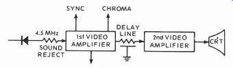 Video detectors and video (luminance) amplifiers are being given considerably more attention as chroma processing and picture tubes improve so that maximum video detail and resolution can be supplied to the overall system. Our initial block diagram (Fig. 6-1) is much like the one in Section 1. DC SIGNAL COMPONENT Norman Doyle and Don Smith of Fairchild Semiconductor say: "the DC component of a television signal contains in formation relating to the mean brightness of the scene being televised." So if there is no DC component, mean brightness is AC coupled and only picture content determines the average value of video voltage-and this isn't good. Therefore, you must either DC couple all video amplifiers to the picture tube following the video detector, or find some means of restoring the DC level.