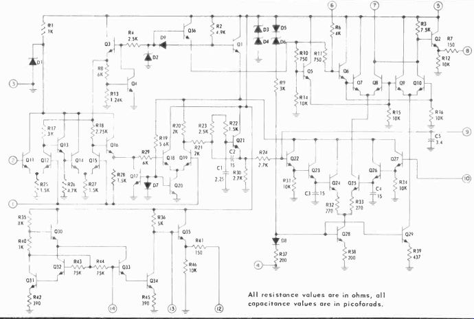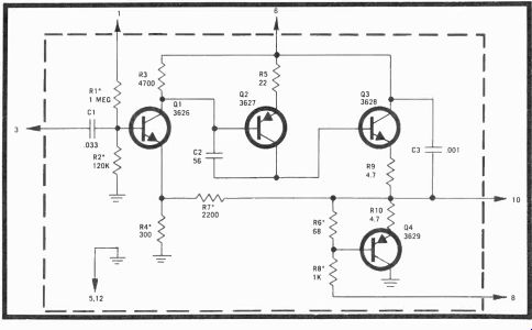 ...a limiter and current source, respectively. The Q18-Q19 differential pair again amplifies without phase change through Q21 (with feedback) and to the Q22 and Q27 buffers through the L1-68-pf tunable discriminator circuit (Fig. 6-19) Q23 and Q26 are peak detectors that supply differential amplifiers Q24 and Q25 with detected FM that is compared against the resonance set up by the discriminator circuit so that output currents are proportional to the input FM deviations. After amplification by Q7-Q8, signals are applied to the electronic attenuator. Terminal 6 is the DC volume control connection, while bias for Q5-Q6 and, subsequently, bias for the bases of Q8-Q9 and Q7-Q10 is supplied from the emitter of Q36 out of the regulated chip supply. Q29 is the emitter constant-current source for Q9-Q10. If you look at these two pairs of differential amplifiers, you will find that, except for the emitters, they are in parallel. The only mobile connection is to the emitter of Q7-Q8 and this is clamped by the limited voltage from the power supply, base bias and the constant current feed from Q29. The output through Q2 and terminal 8, therefore, is electronically and automatically attenuated regardless of incoming signals. Low-impedance audio is delivered from terminal 8 to terminal 14, the input to buffer Q33 and audio drivers Q34 and Q35. Transistors Q30 through Q32 are simply another regulator, this time for Q33. Any external changes are sensed by the base of Q30 which increases or decreases the emitter current and also the collector current of Q32, which finally reaches the base of Q31 where the change is resistively con trolled by the conduction of this transistor. The MAN 2A module (Fig. 6-22) receives its input from terminal 12 of PM200 through a 0.033-mfd capacitor between base bias resistors R1 and R2. The signal is amplified through Q2 with a little degenerative feedback to the base of Q3. Transistors Q3 and Q4 constitute a Class B push-pull amplifier, with Q3 taking incoming voltages from Q2; Q4 requires negative polarity inputs on its base or positive inputs on its emitter. Feedback applied is through terminal 8, following the 50-mfd capacitor at output terminal 10. QUESTIONS 1. What would the face of the CRT look like in an all DC coupled system with no incoming signal? 2. Why is black level clamping preferred? 3. Are video detector diodes quite linear? 4. Why is there a luminance delay line, and how much is the delay introduced? 5. What is the only way a serviceman has to check a luminance delay line accurately? 6. In the newer receivers, where the vertical and horizontal blanking pulses applied? 7. What happens in the luminance amplifier during vertical and horizontal blanking times? 8. What are "tweets"? 9. How can we be rid of tweets? 10. What's the bandpass of most TV audio sections as opposed to those of FM stereo? 11. What was the first good FM audio detector? 12. Do IC detectors and amplifiers produce better sound than discretes? 13. The ratio detector diodes are connected in p while the discriminator's diodes are in s 9 14. What is the basic difference between the ratio detector and discriminator? 15. What is the fundamental principal of the gated-beam detector? 16. What's different about Motorola's output stage in Fig. 6-17? 17. Can you guess how Q4 in Fig. 6-22 works? Next: Sync & AGC Circuits Also see: TV Antennas and Transmission lines Air Time--An Intro to Television Broadcasting TV and Radio Tube Troubles (1958)
